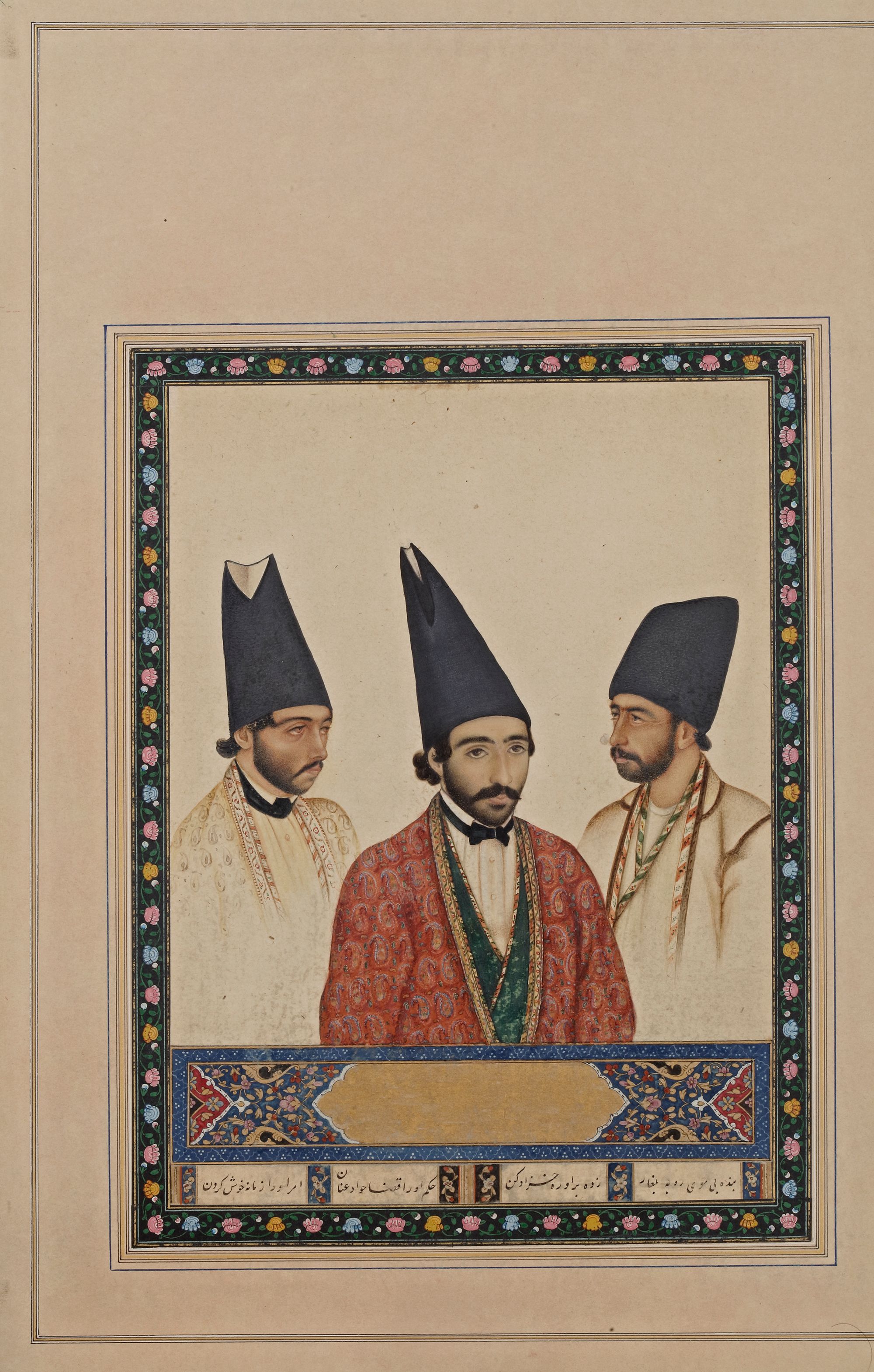 Gouache colour heightened with gold on paper, depicting three courtiers portrayed, ruled in a border with gilt and striking blue decoration containing panels enclosing Persian inscription in black nastaliq script.