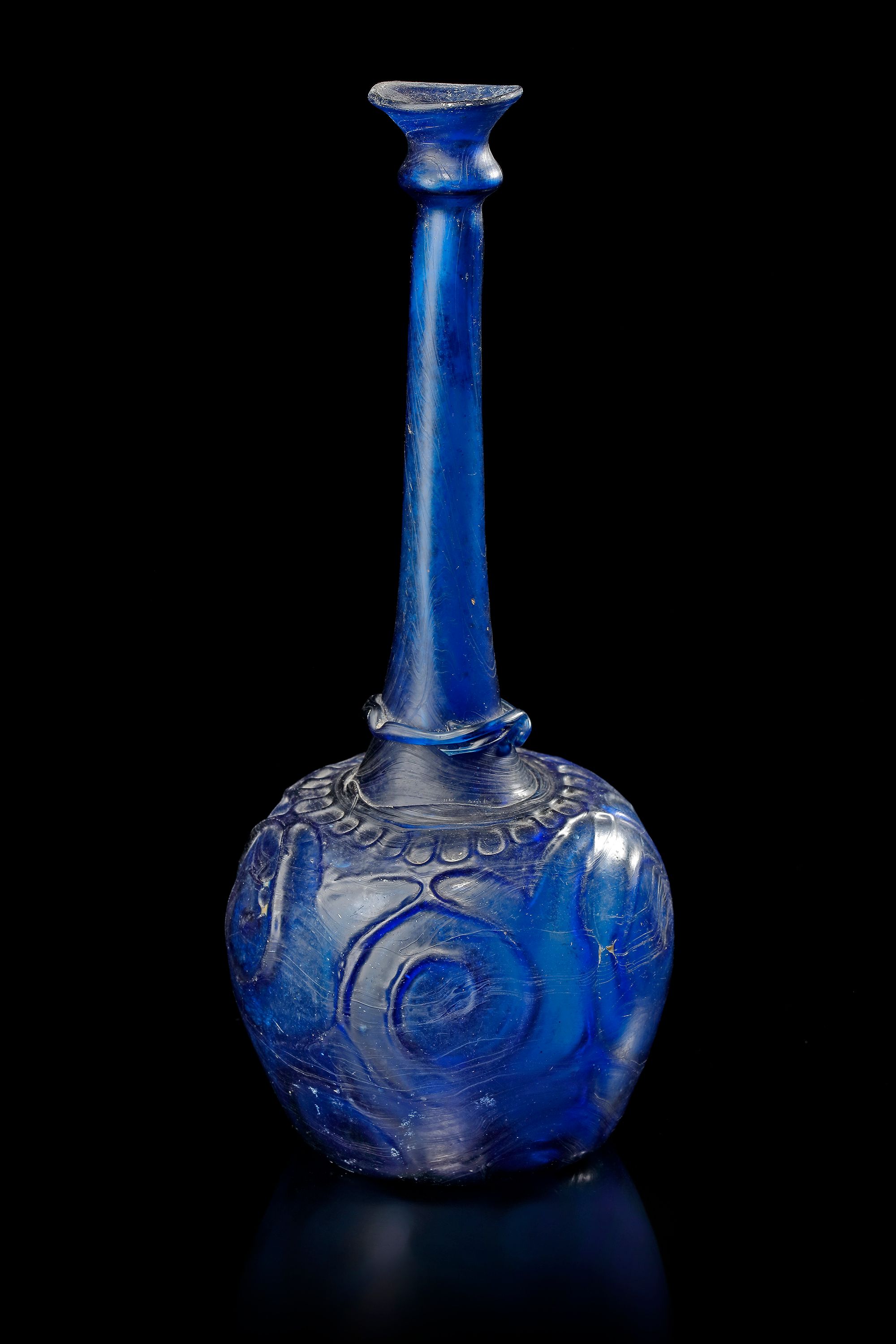 Lot 139A LARGE MOULD-BLOWN BLUE GLASS BOTTLE-VASE OR SPRINKLER, PERSIA, 12TH CENTURY
