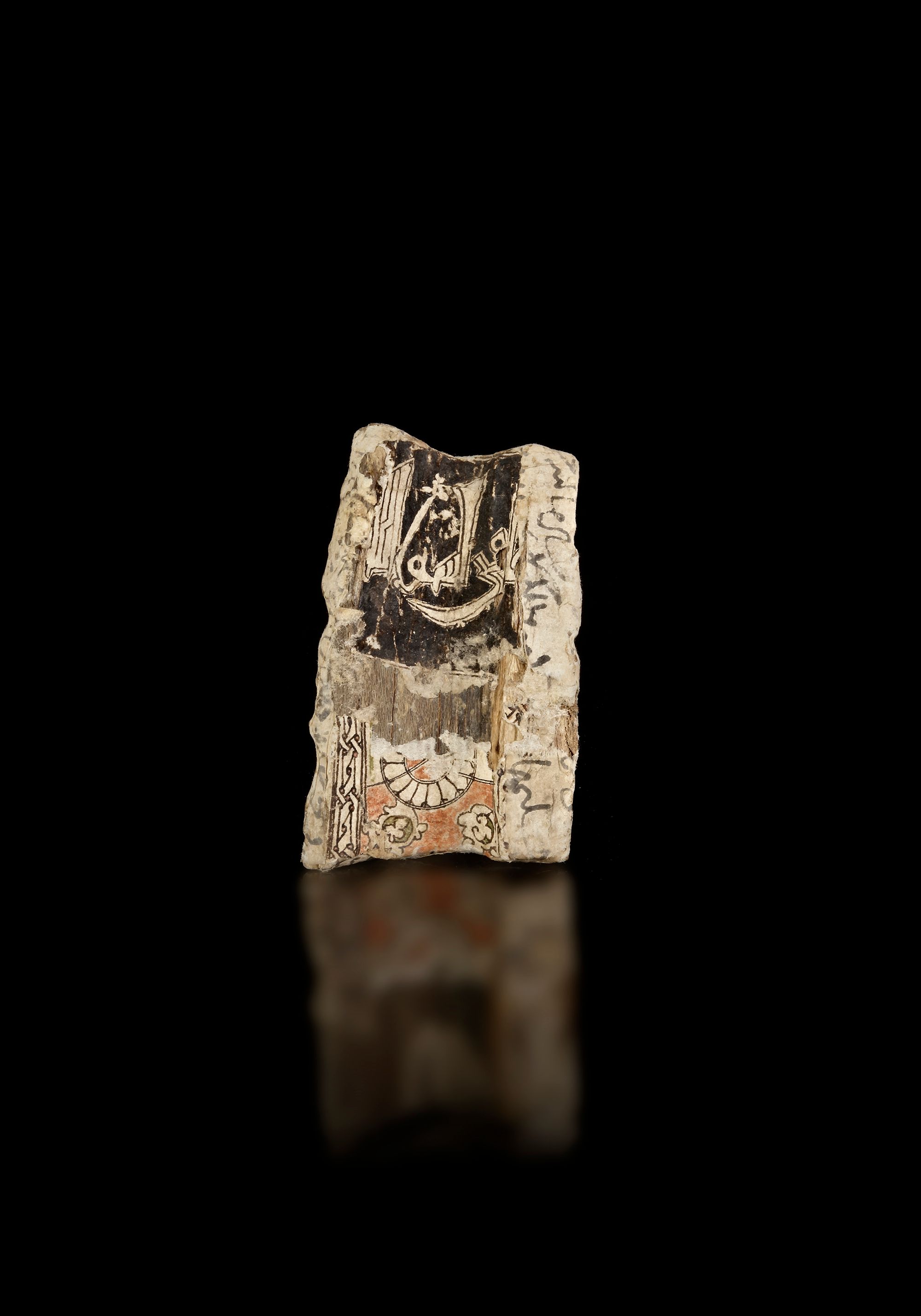 The bone of slightly curved natural form, polished, covered with paper stylized in Kufic inscriptions and polychrome floral designs. 11 by 7 cm.