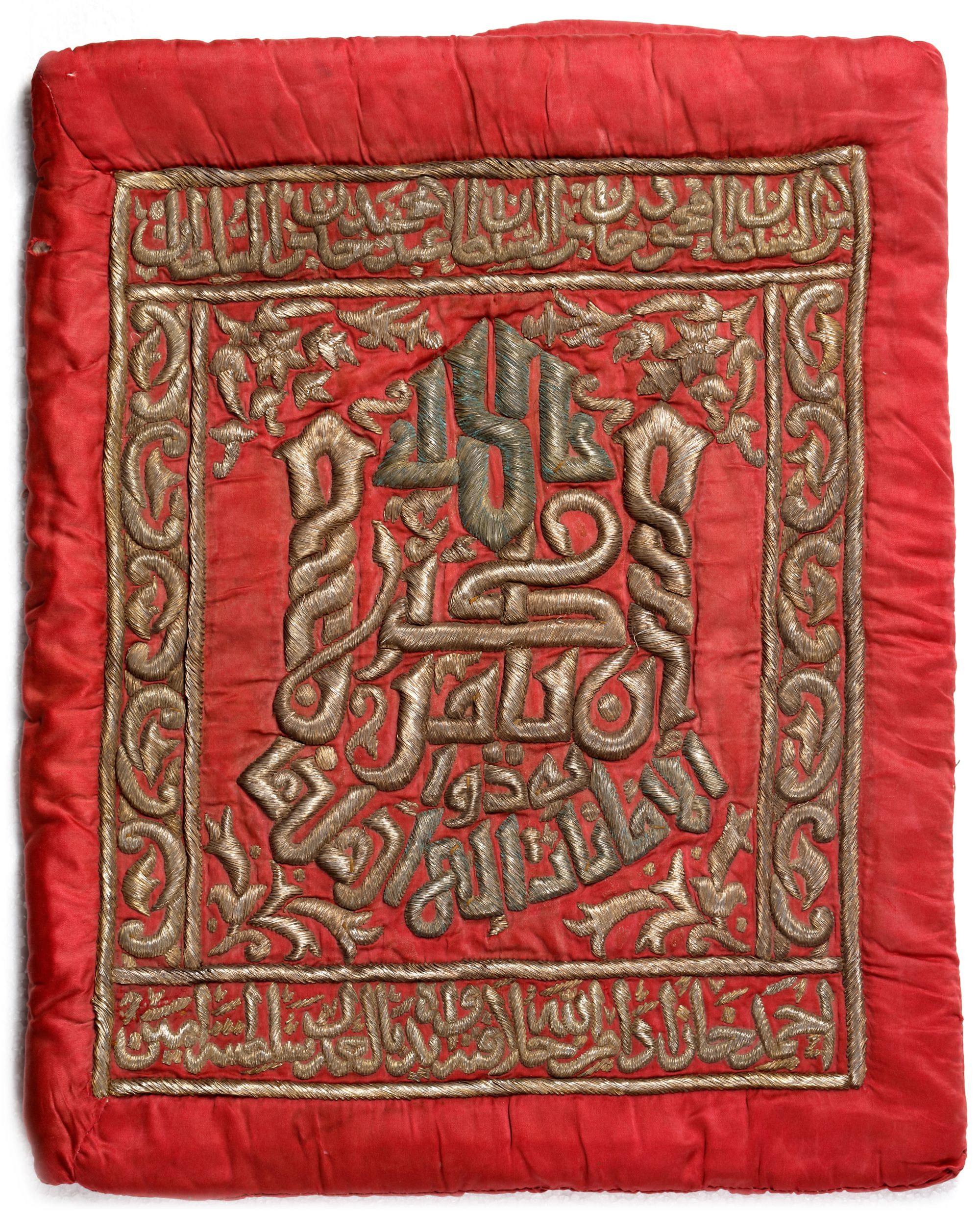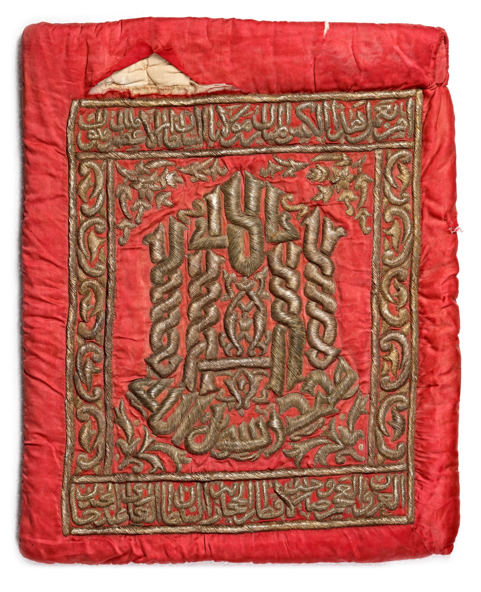 Rectangular in shape, two red cotton panels stitched together, each side is heavily decorated with a thread of silver-plated lush decorations surrounding inscriptions in Kufic script of Quran surah An-Nisa v.58 and Kalimaat al-Tawhid, made by the order of the Ottoman Sultan Abdulmejid I.