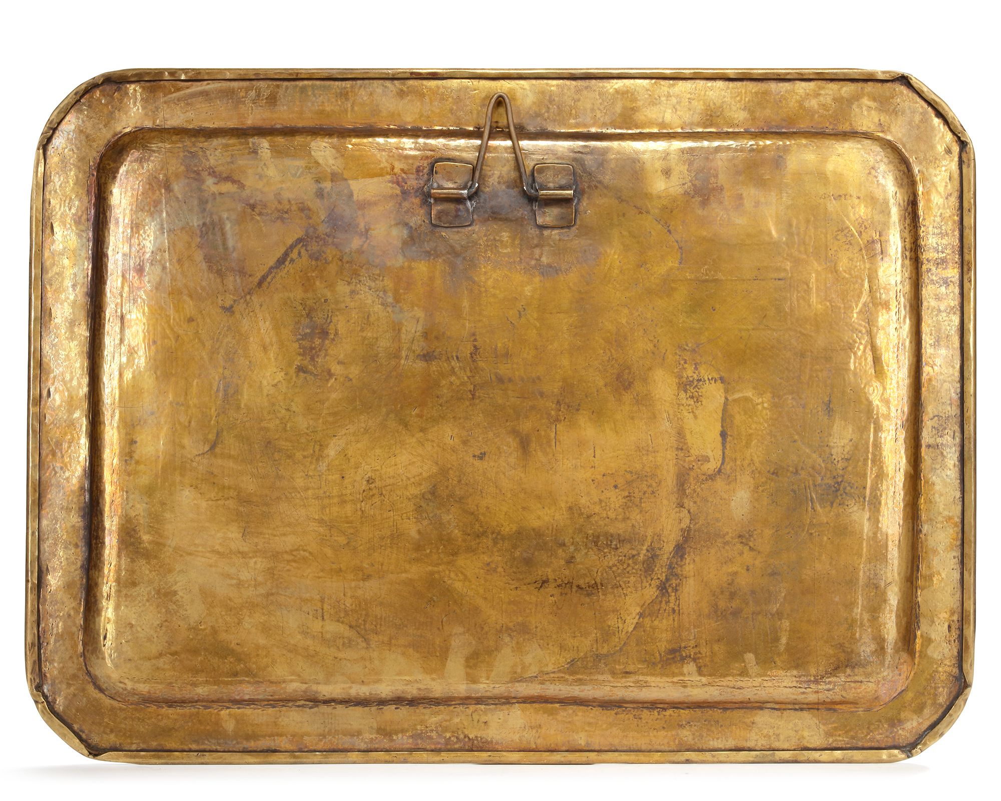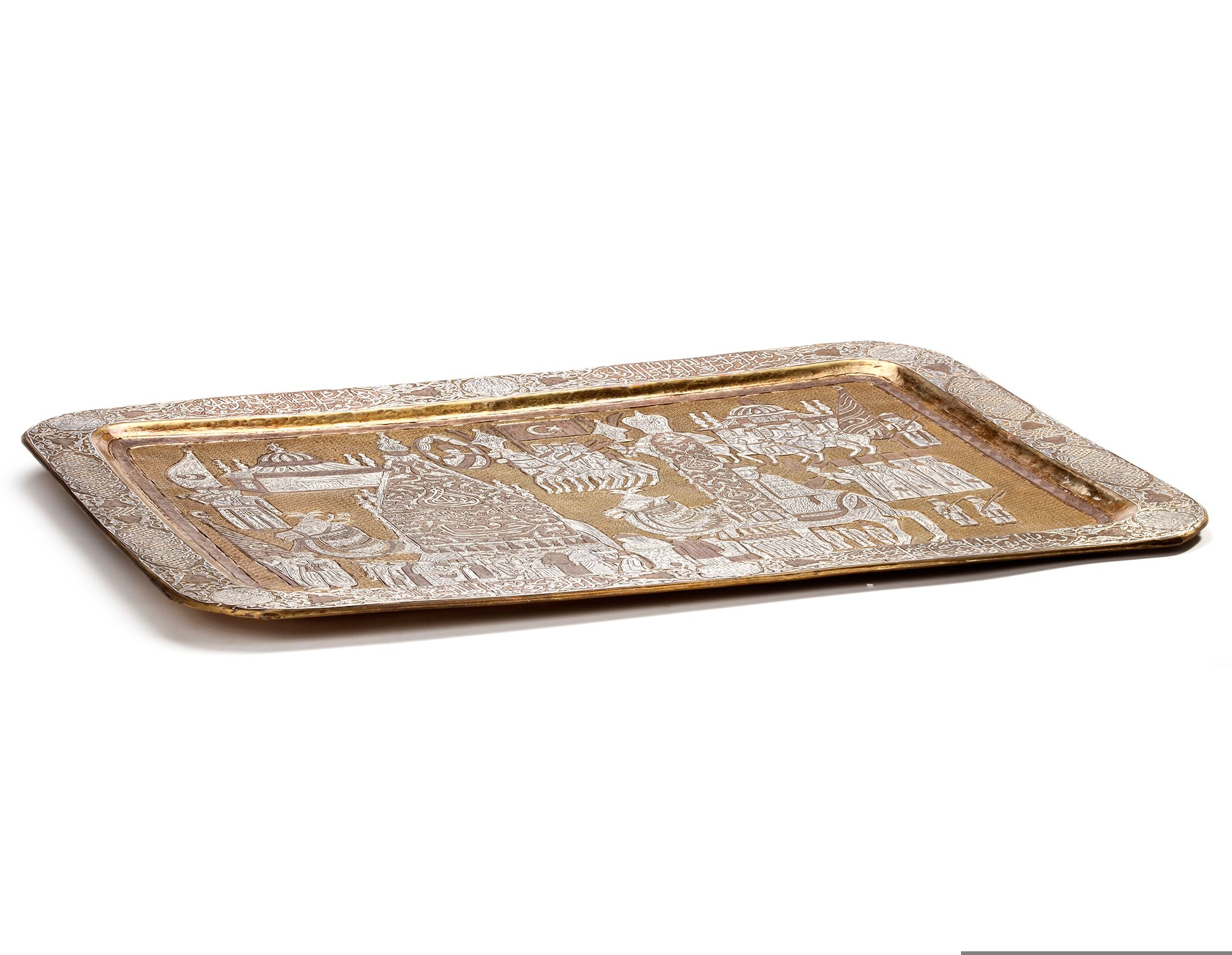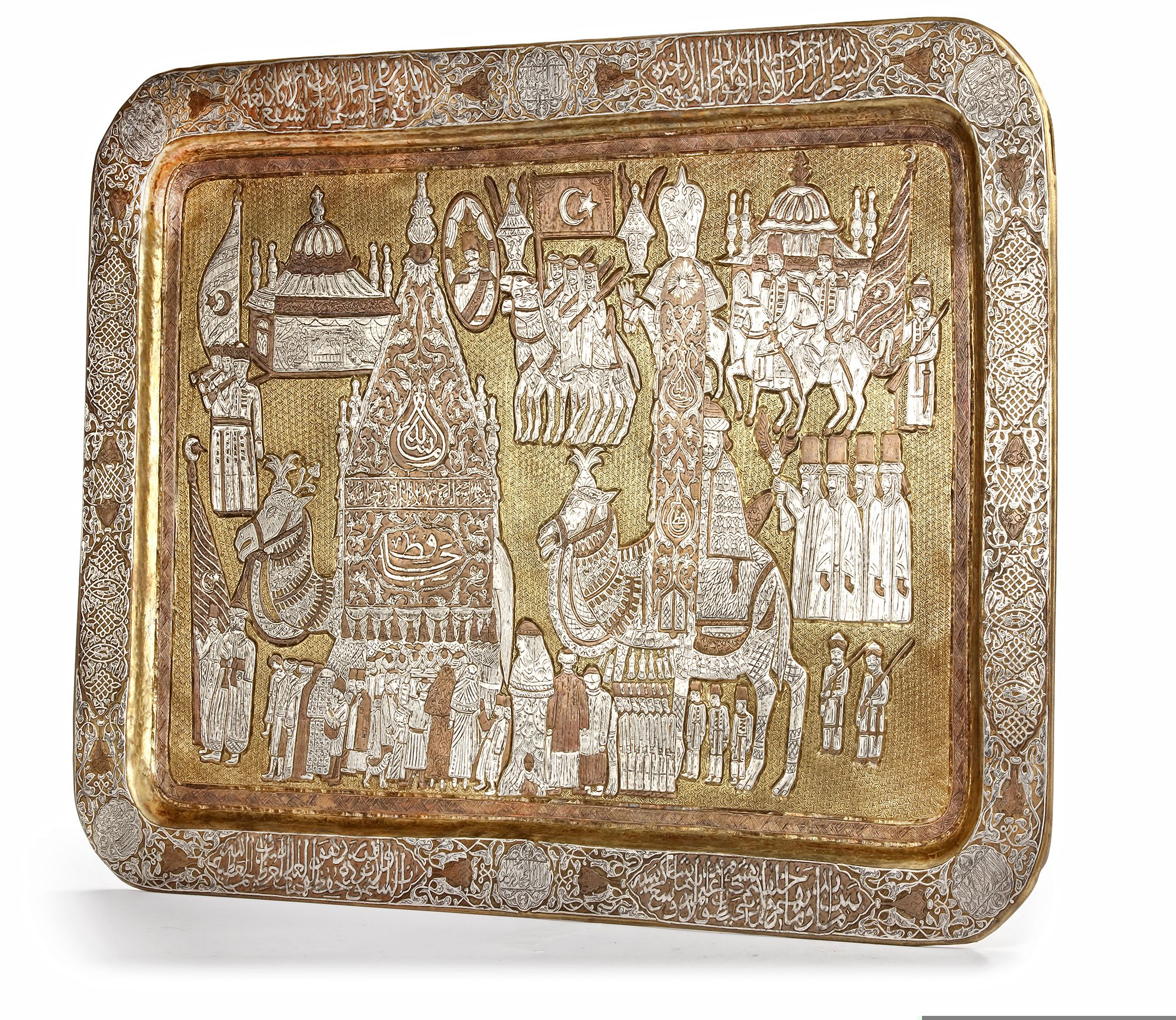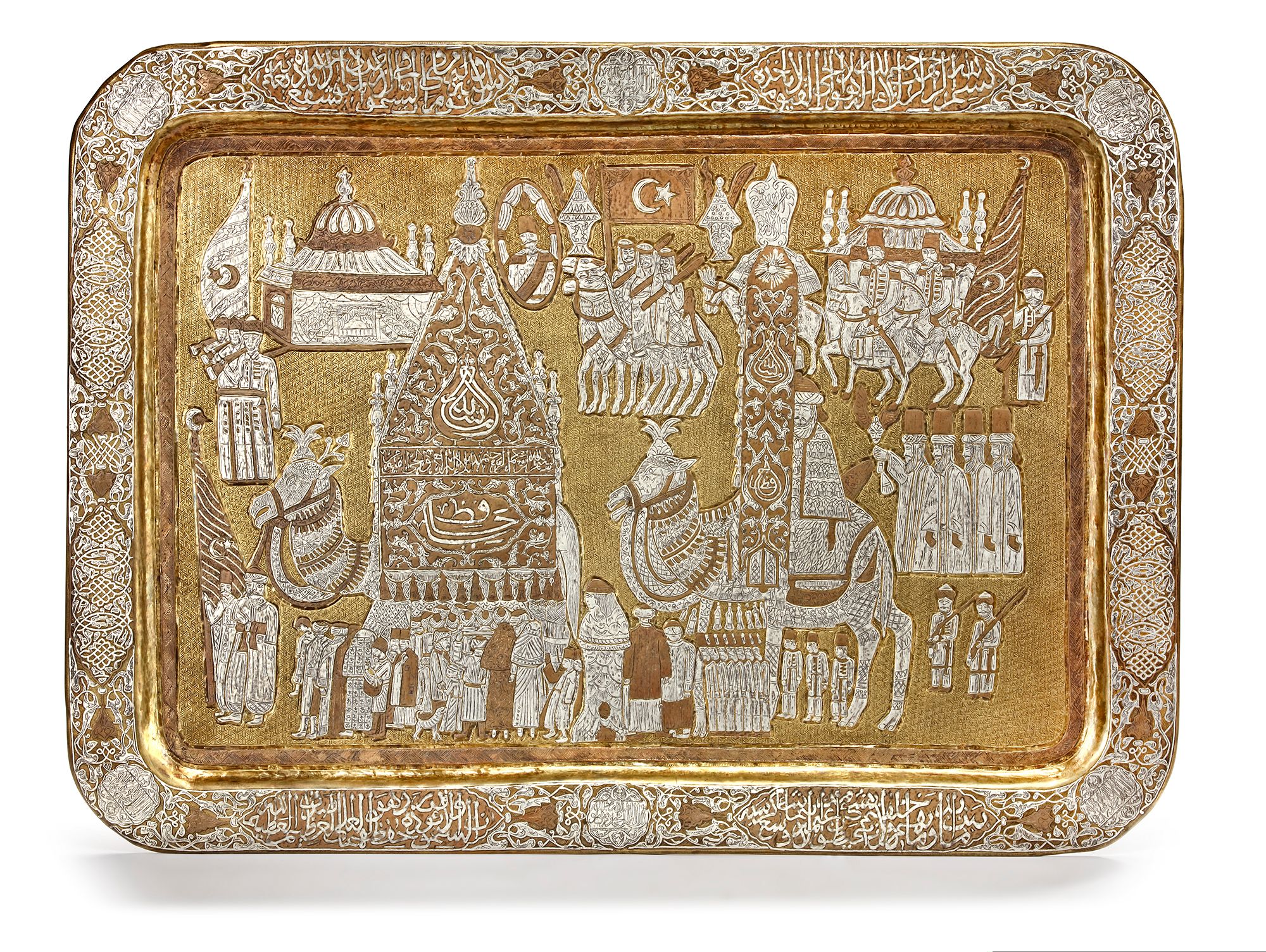 A brass tray of rectangular form, profusely inlaid, the central field depicting the Mahmal procession, the border containing cartouches enclosing inscriptions in Thuluth script of Ayat Al-Kursi v. 255 from surah Al-Baqaraa with interspersed roundels containing bands enclosing kalimaat Al-Tawhid.