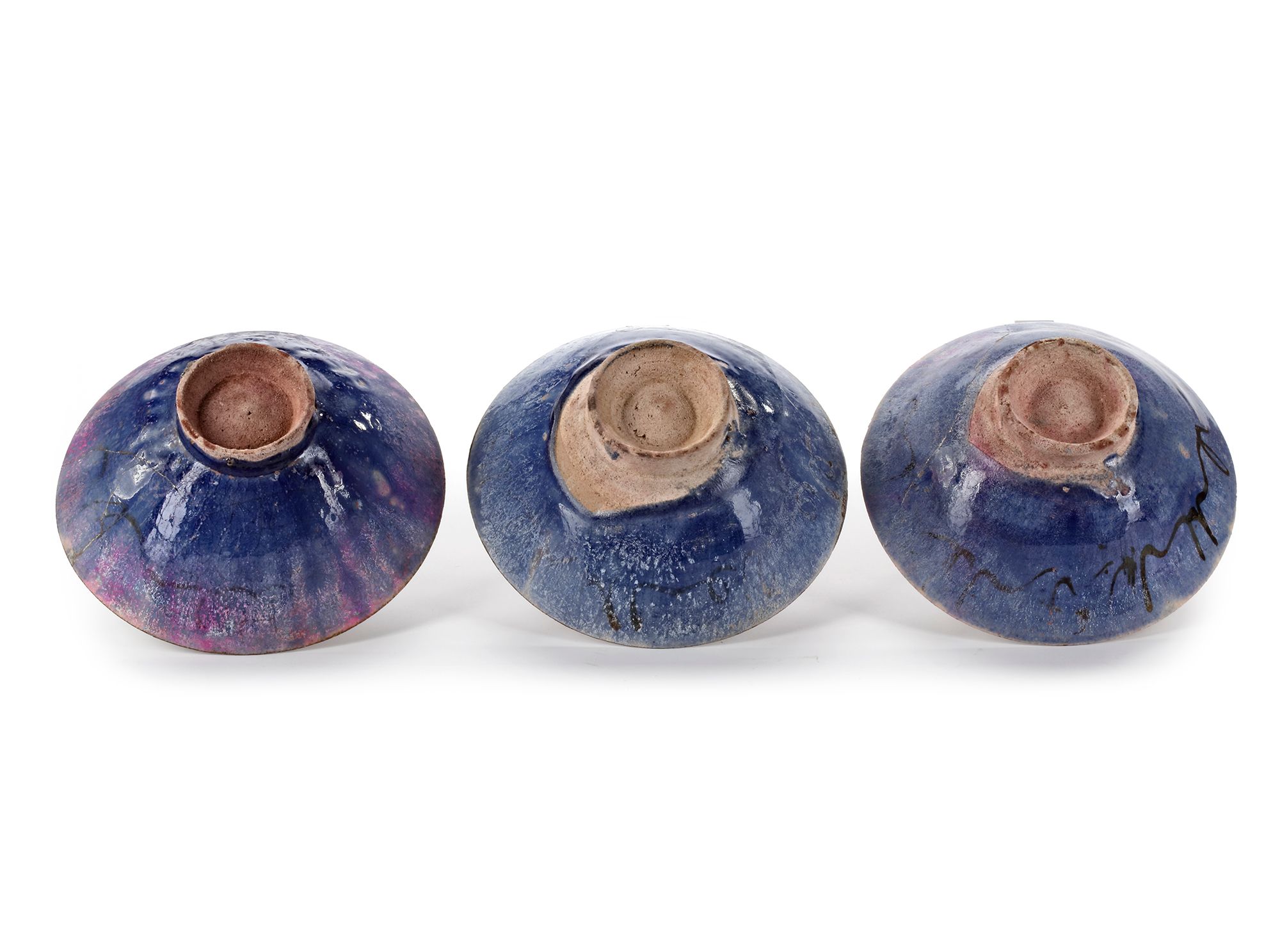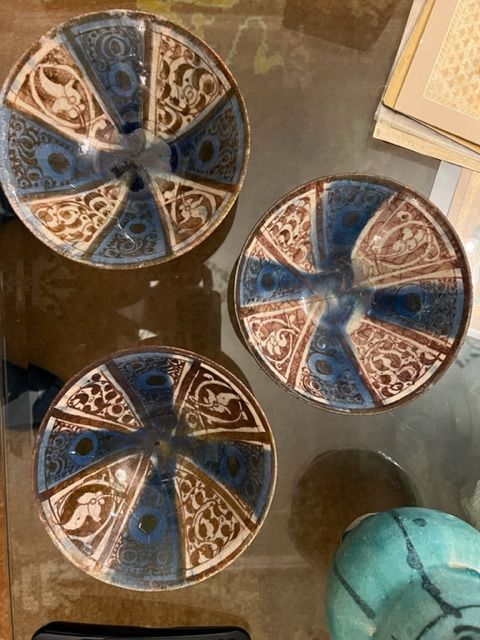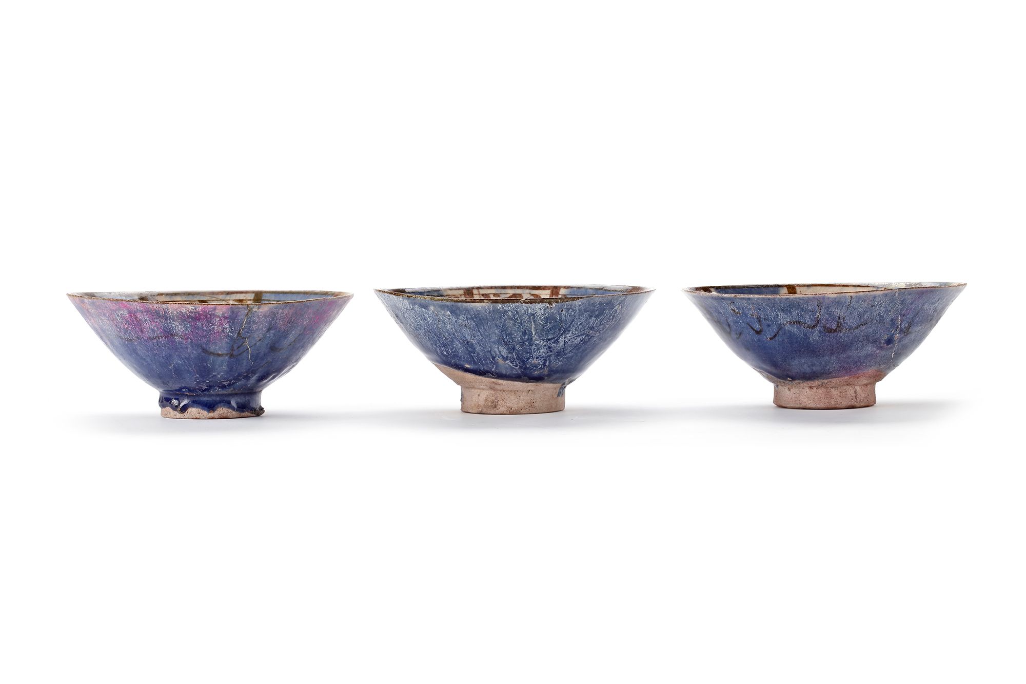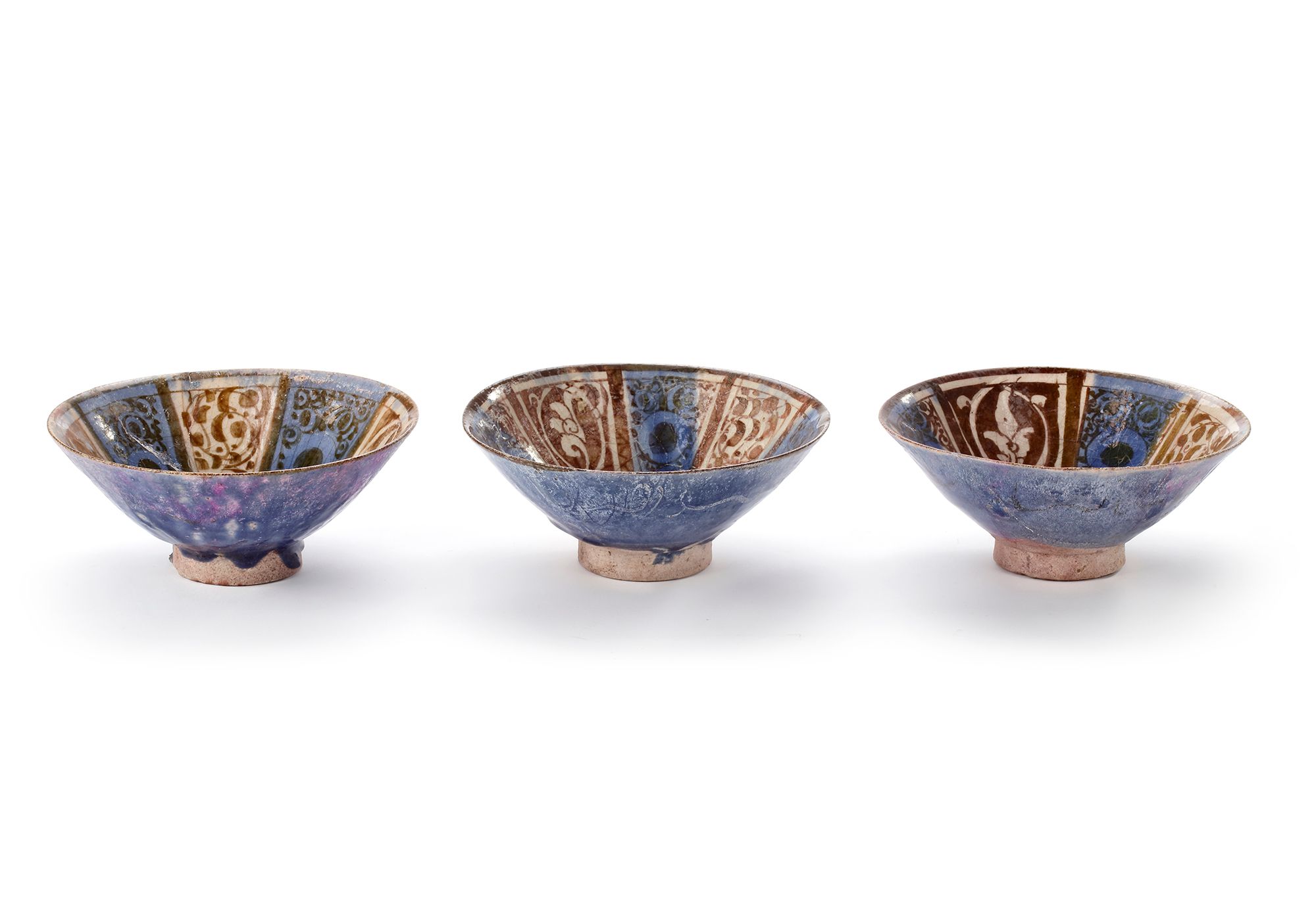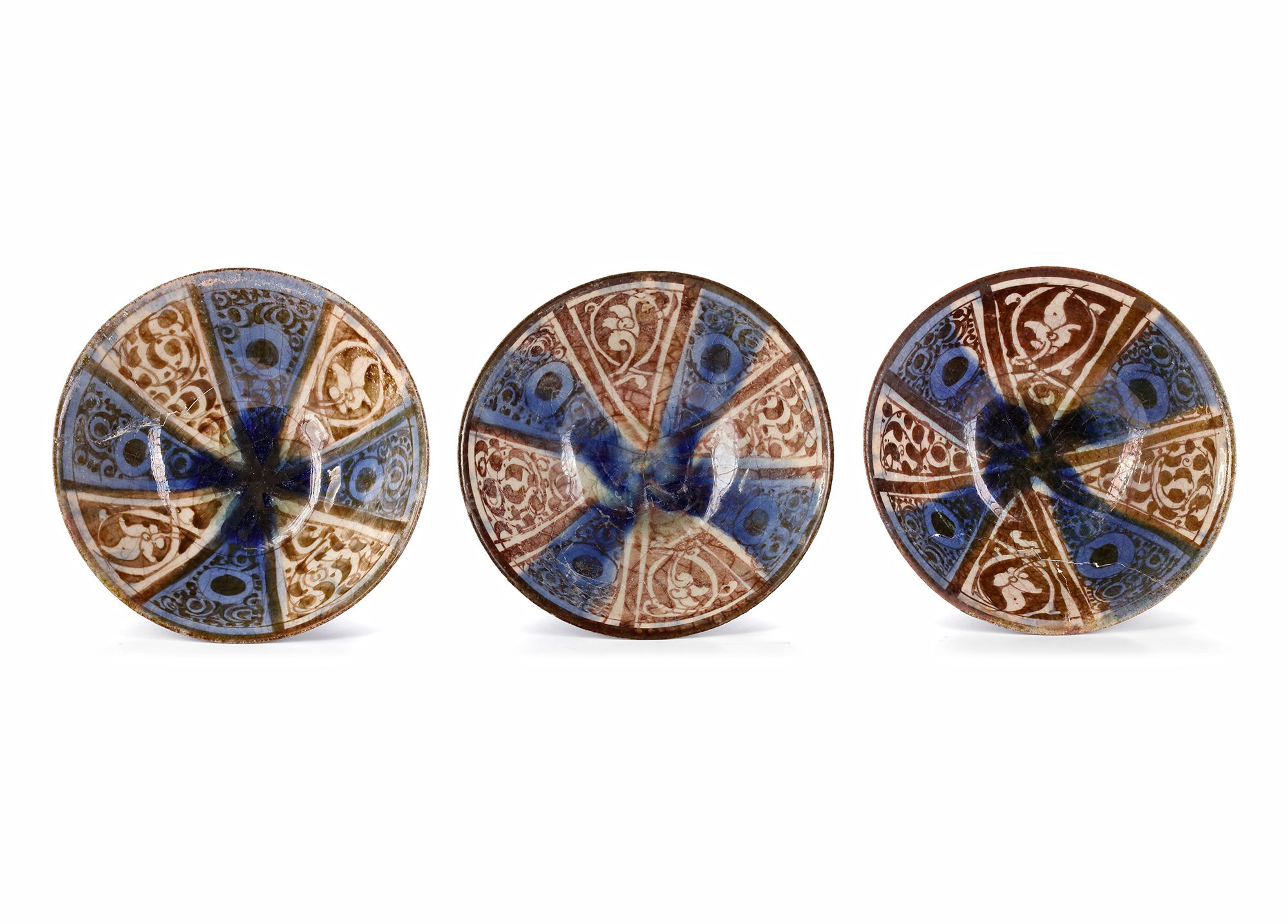 Of truncated conical form with flaring walls stepped down to a straight vertical foot, the cavetto stylized with a design of alternating panels in brown with floral designs on a white ground with cobalt blue overglaze. The exterior covered with a cobalt blue glaze decorated in black with inscriptions and stopping irregularly at the base to expose the buff ware.