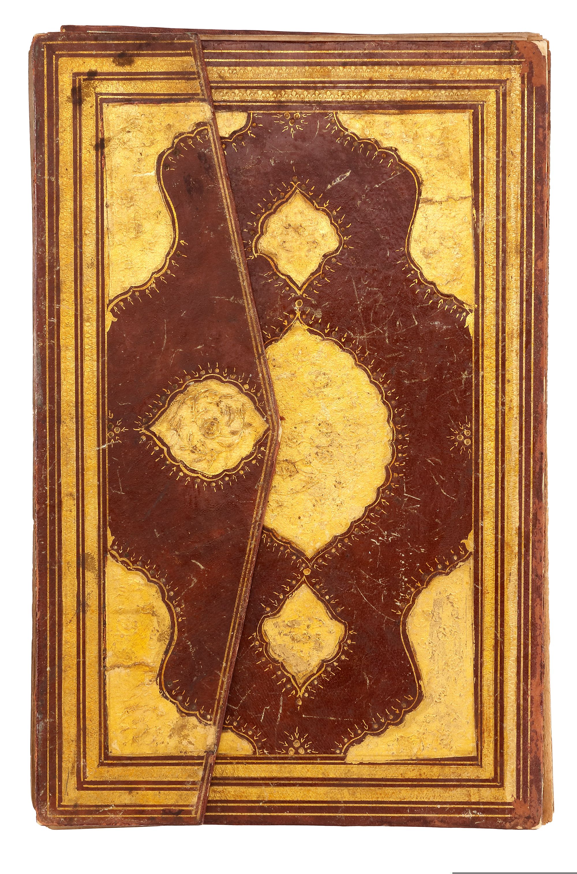 In brown morocco binding with flap decorated with gold painted floral motifs.