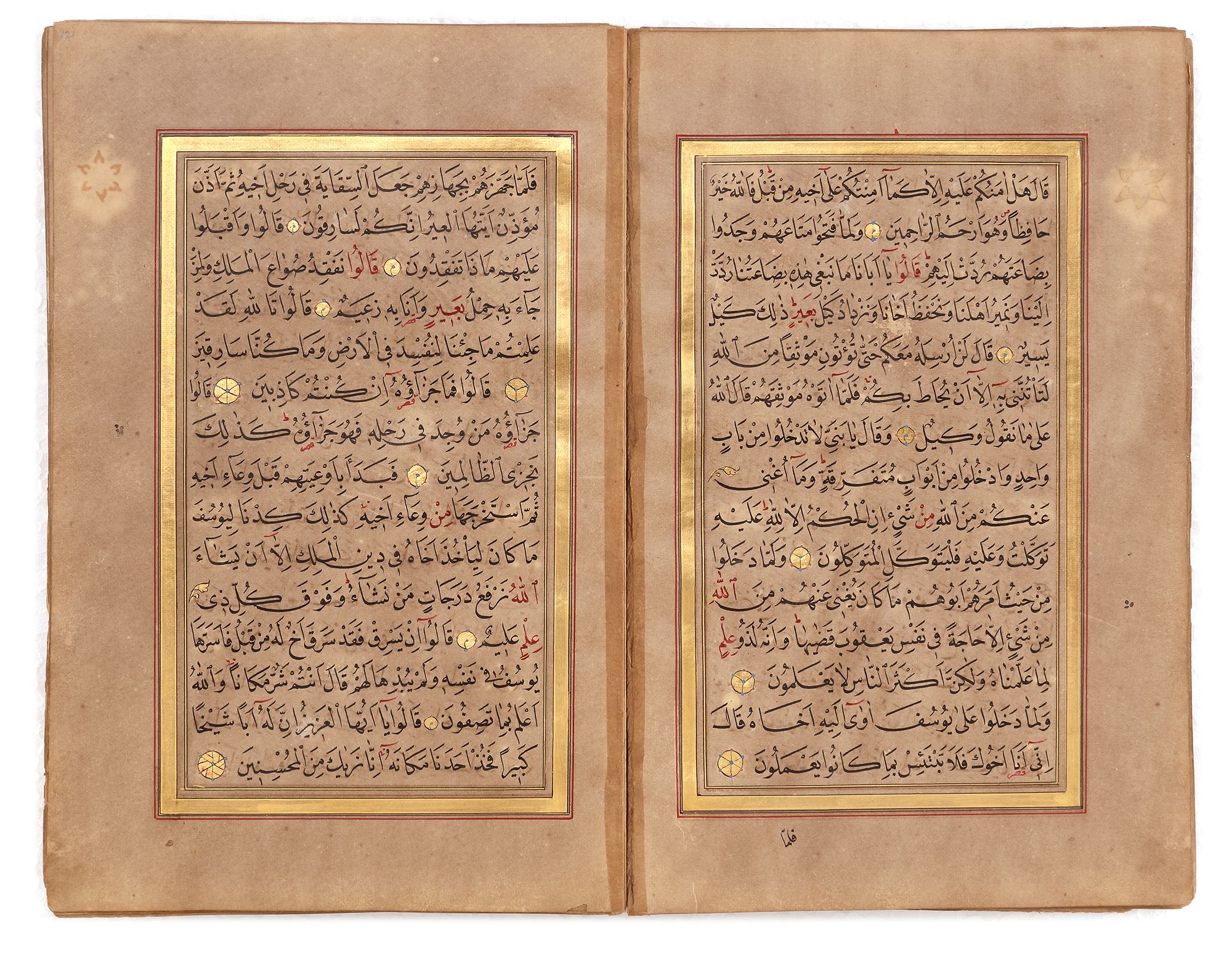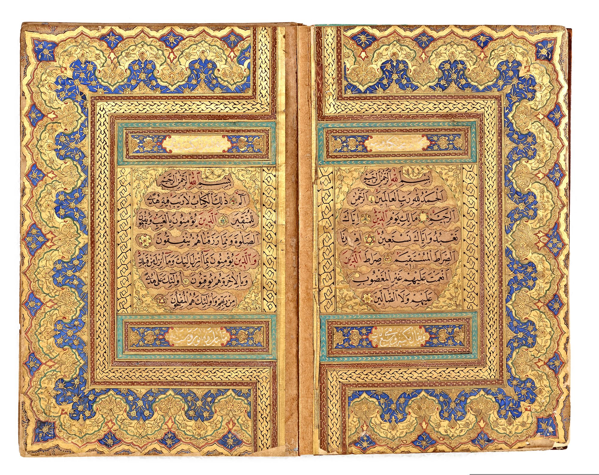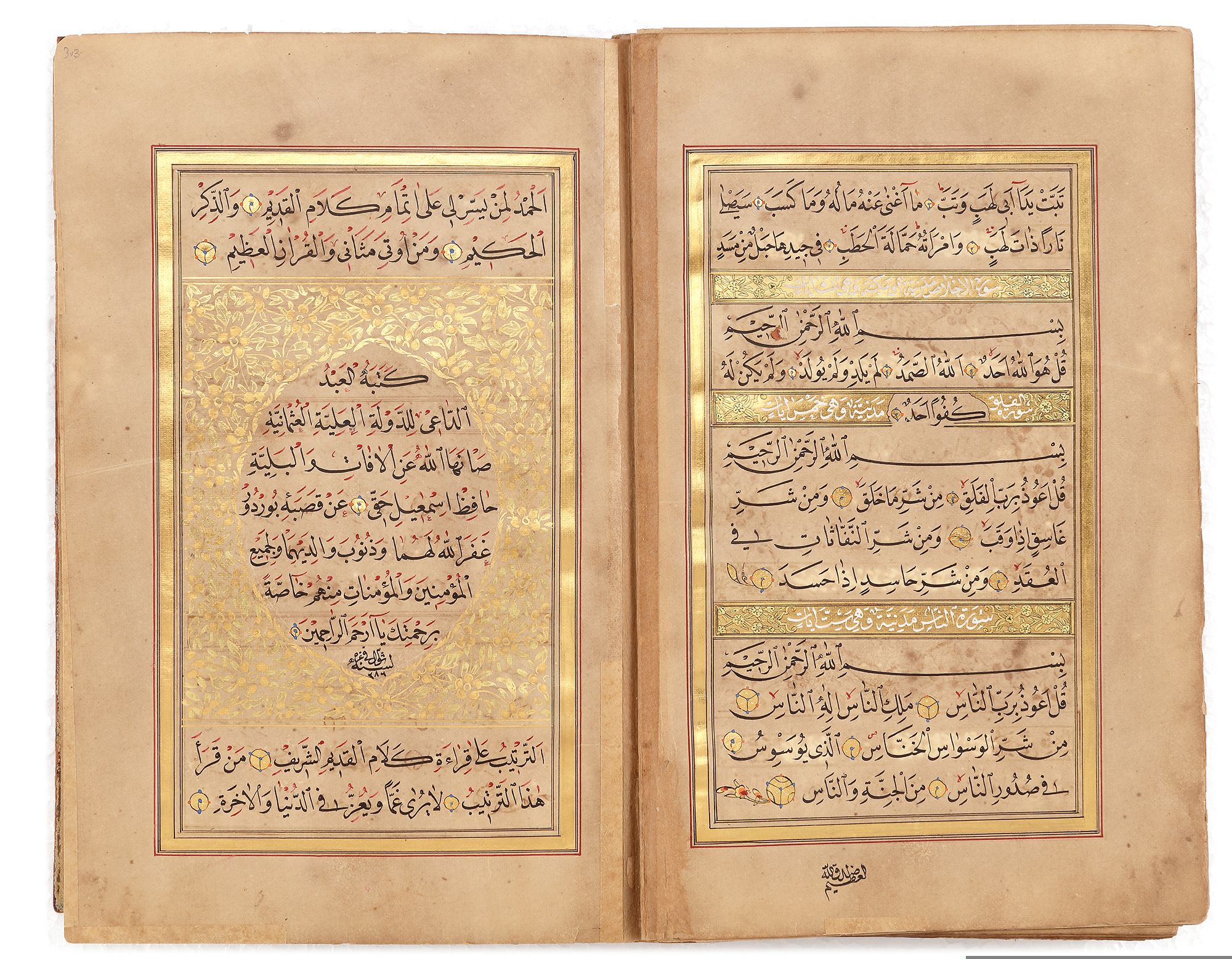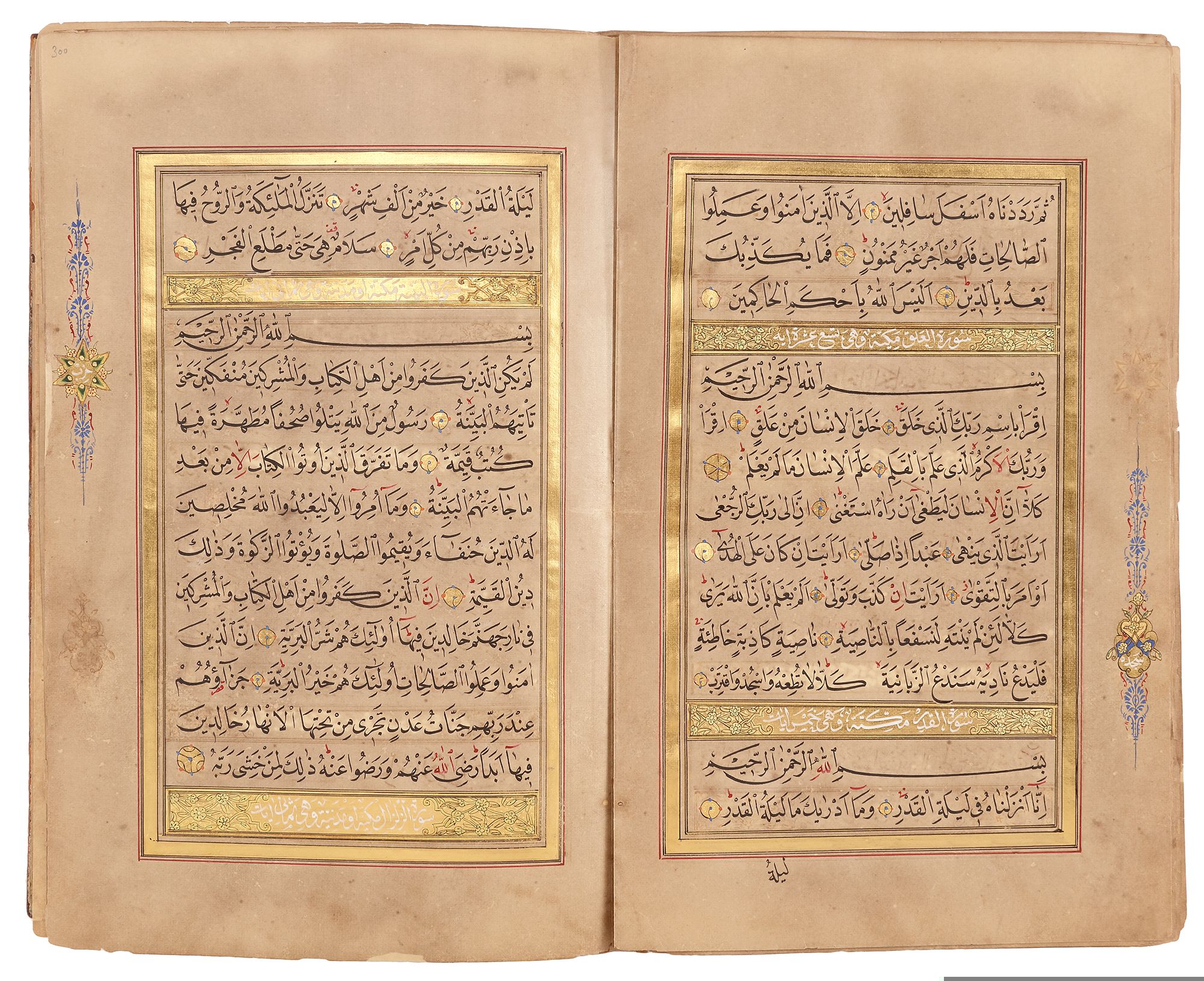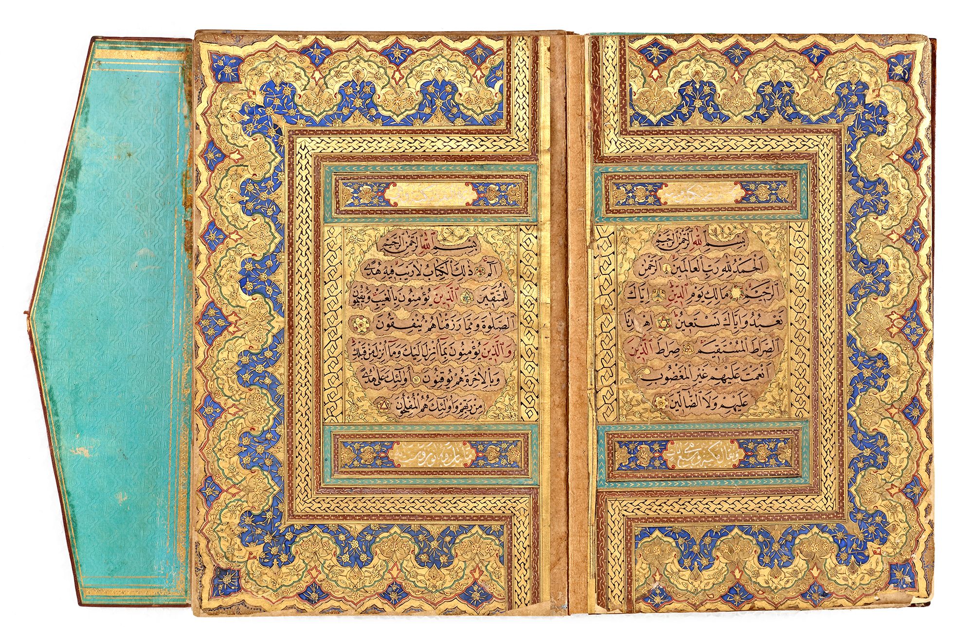 A complete Quran, Arabic manuscript on cream paper, each page with 15 lines written in black naskh script within gold and red rules, gold roundel verse markers outlined in polychrome dots, catchwords in red. Surah headings in white thuluth script on a gilt ground within a decorated panel, gold and polychrome marginal floral motifs indicating the 'Juz and Hizb'. Two opening biofolia heavily with gilt and polychrome decoration framing 7 lines of black naskh script in clouds reserved against a sprinkled gold ground. Final three pages with Due al-khatm and signed by 'written by al-Faqir Hafiz Ismail Hakki in 1282 AH/1865 AD' within a roundel on a gilt and polychrome decorated ground.
