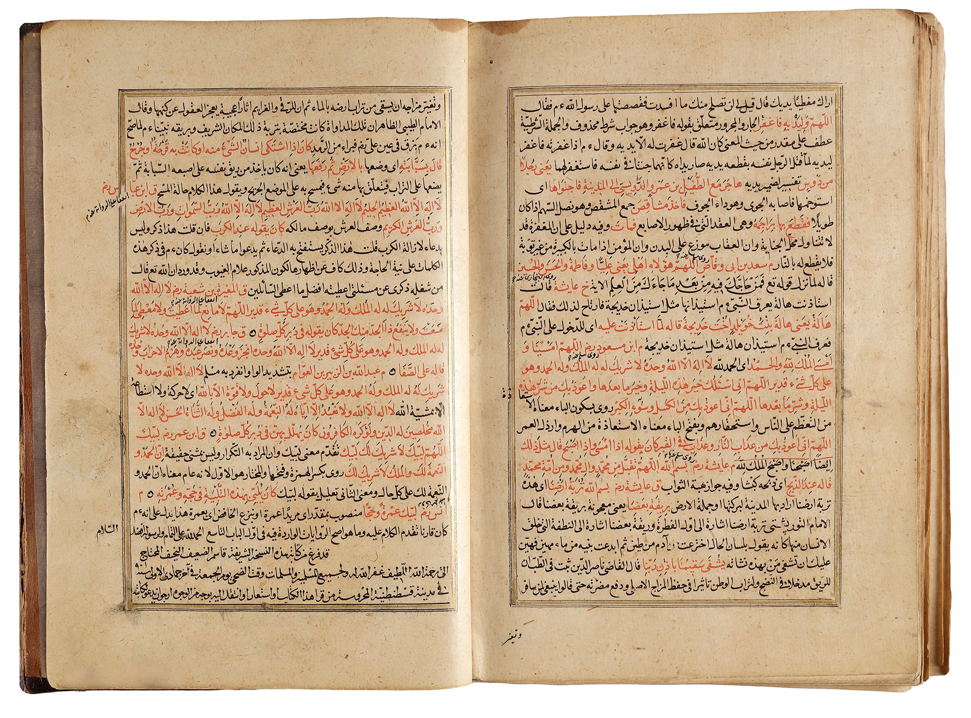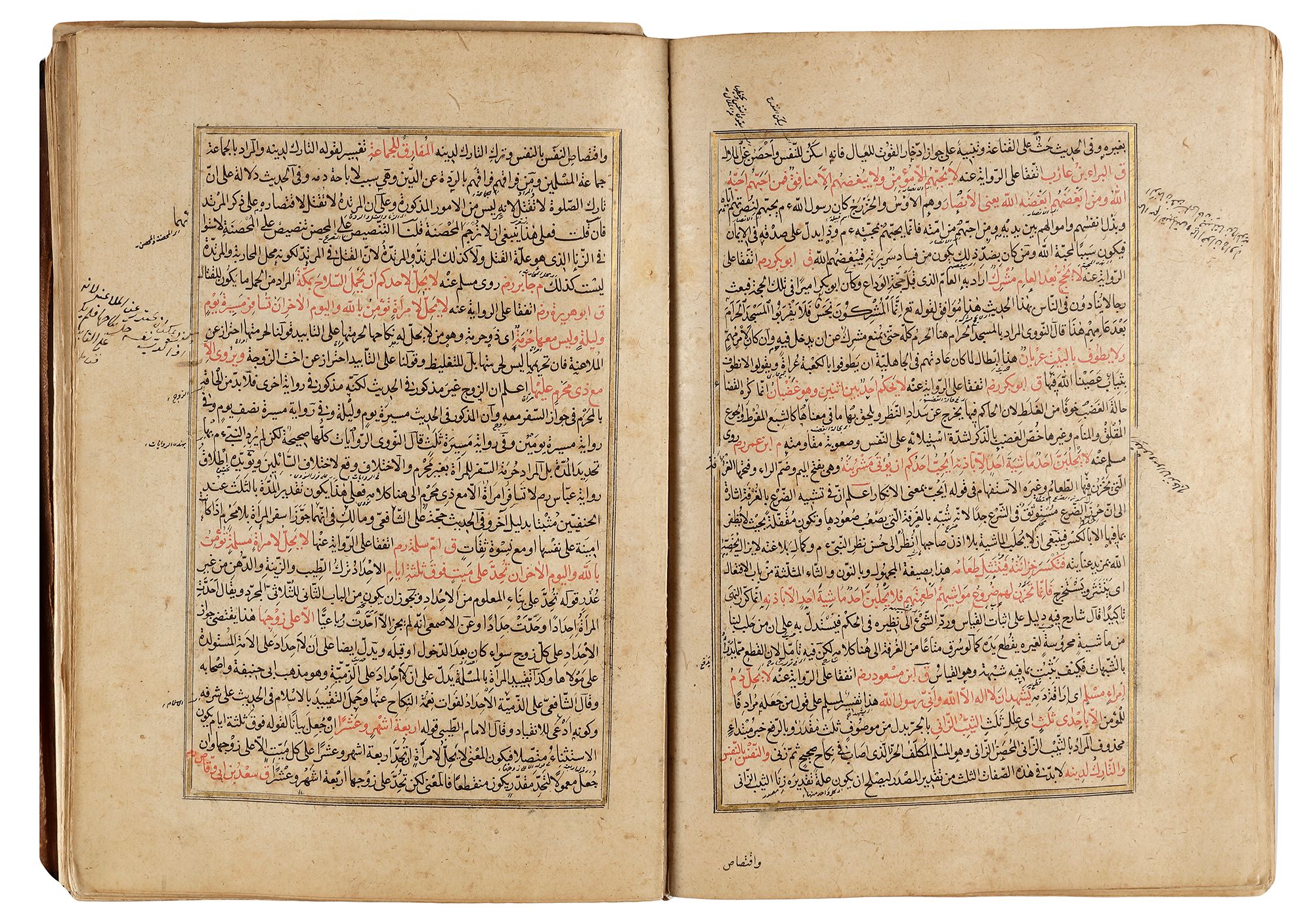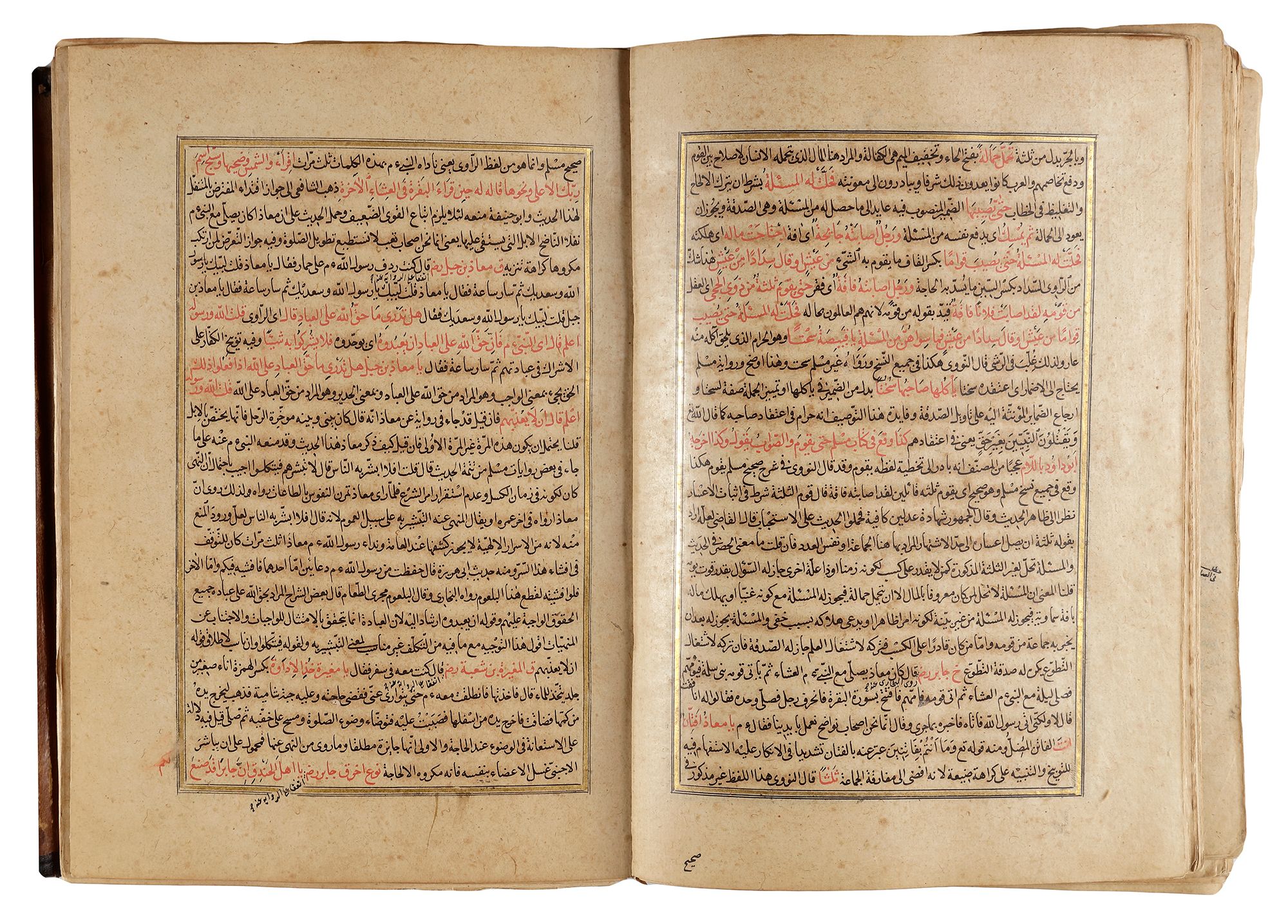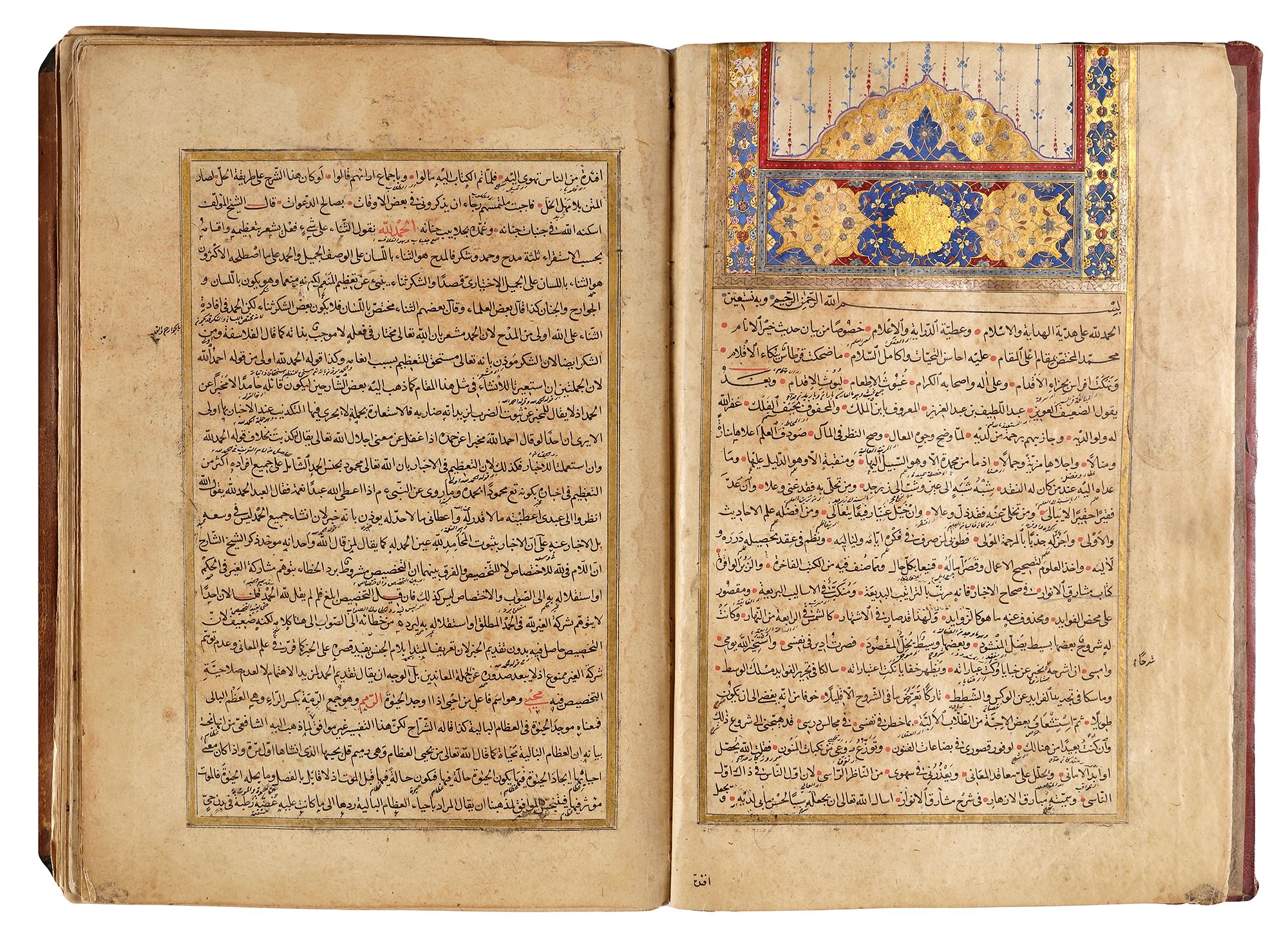 Arabic manuscript on paper, 267 leaves.with 3 fly-leaves, 25 lines to each page, written in black naskh script, catchwords and titles in red ink, ruled in gilt and black borders, occasional marginal commentary notes, opening biofolio with gilt and striking blue decoration. The last page with dedication and singed "written by Kasim in 901 AH in Constantinople".