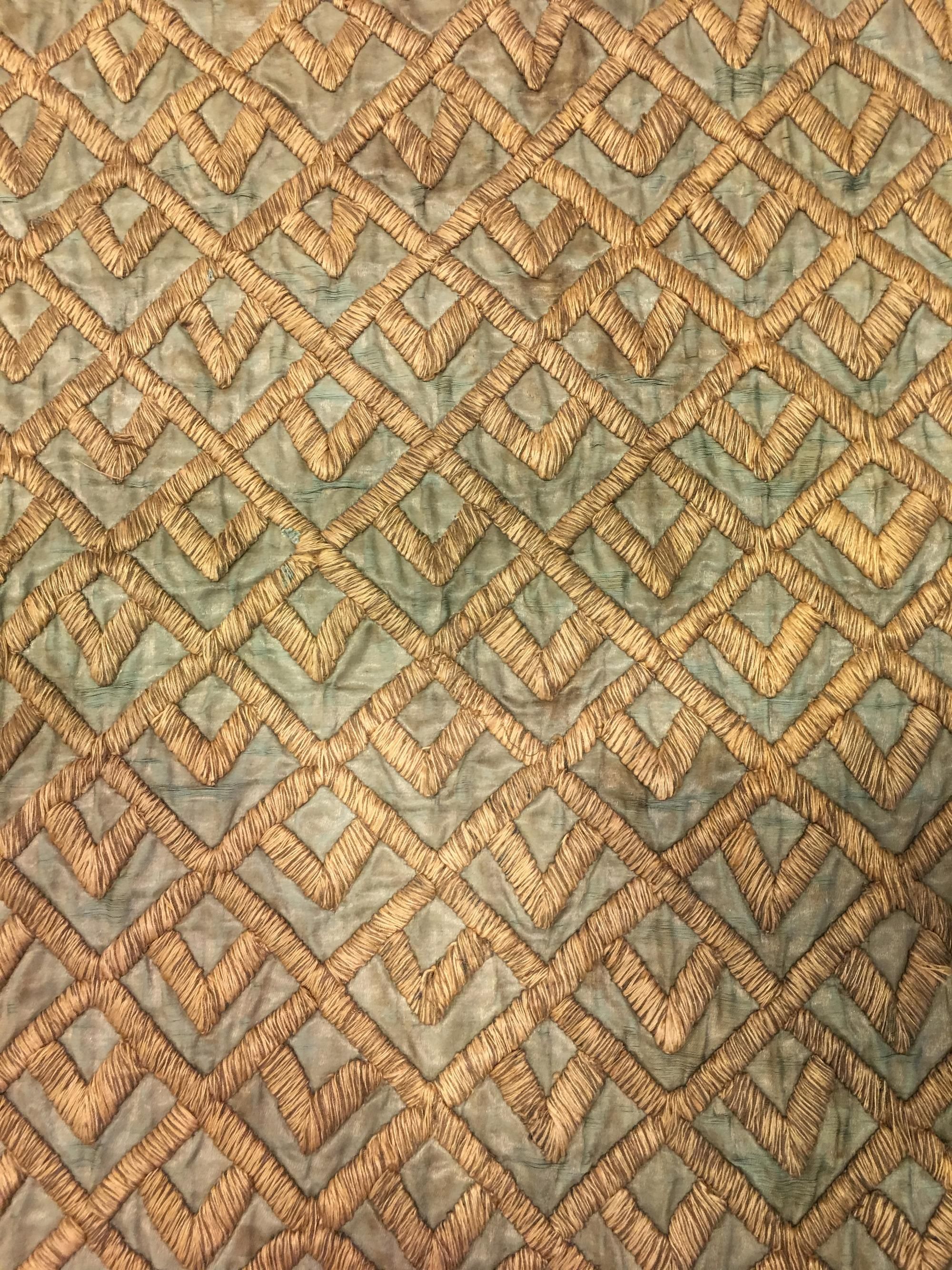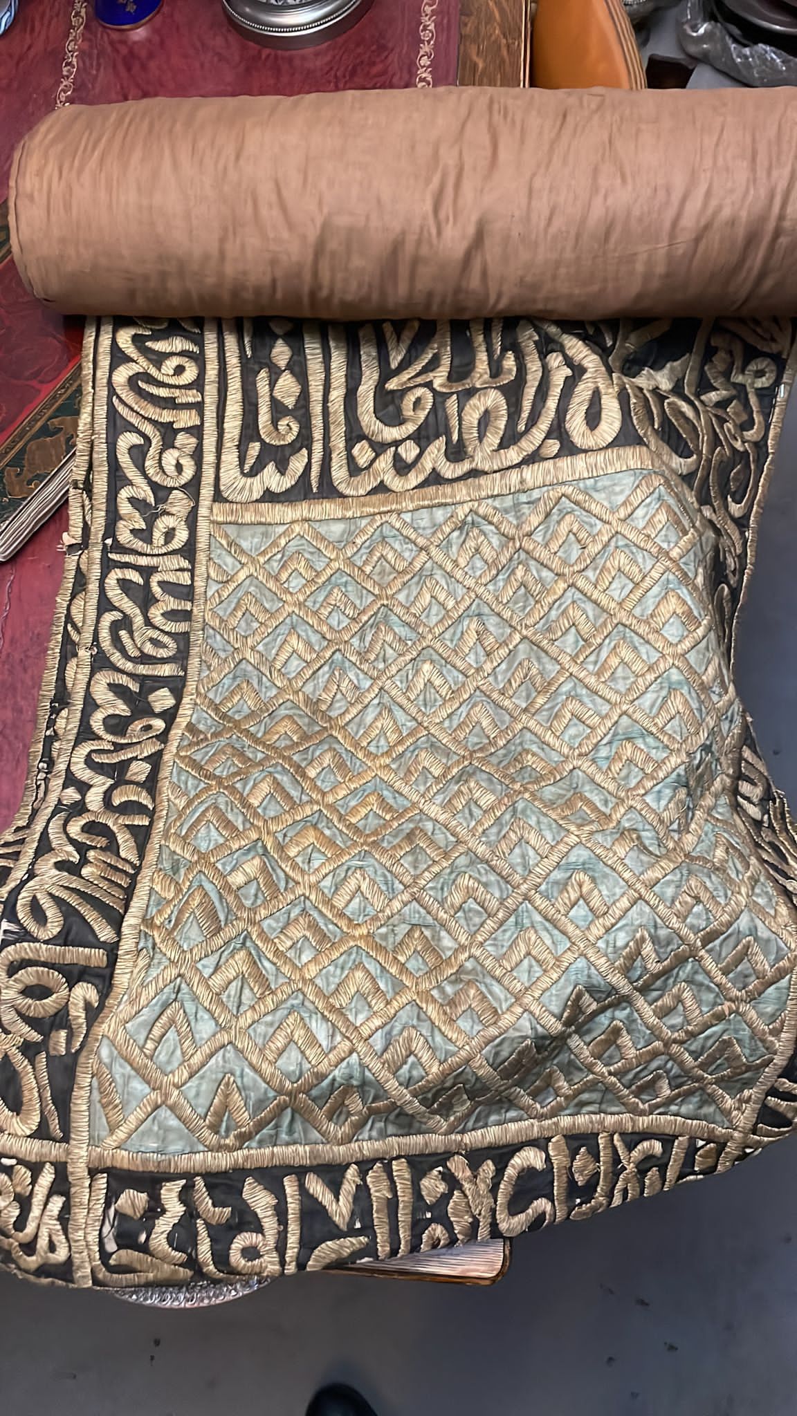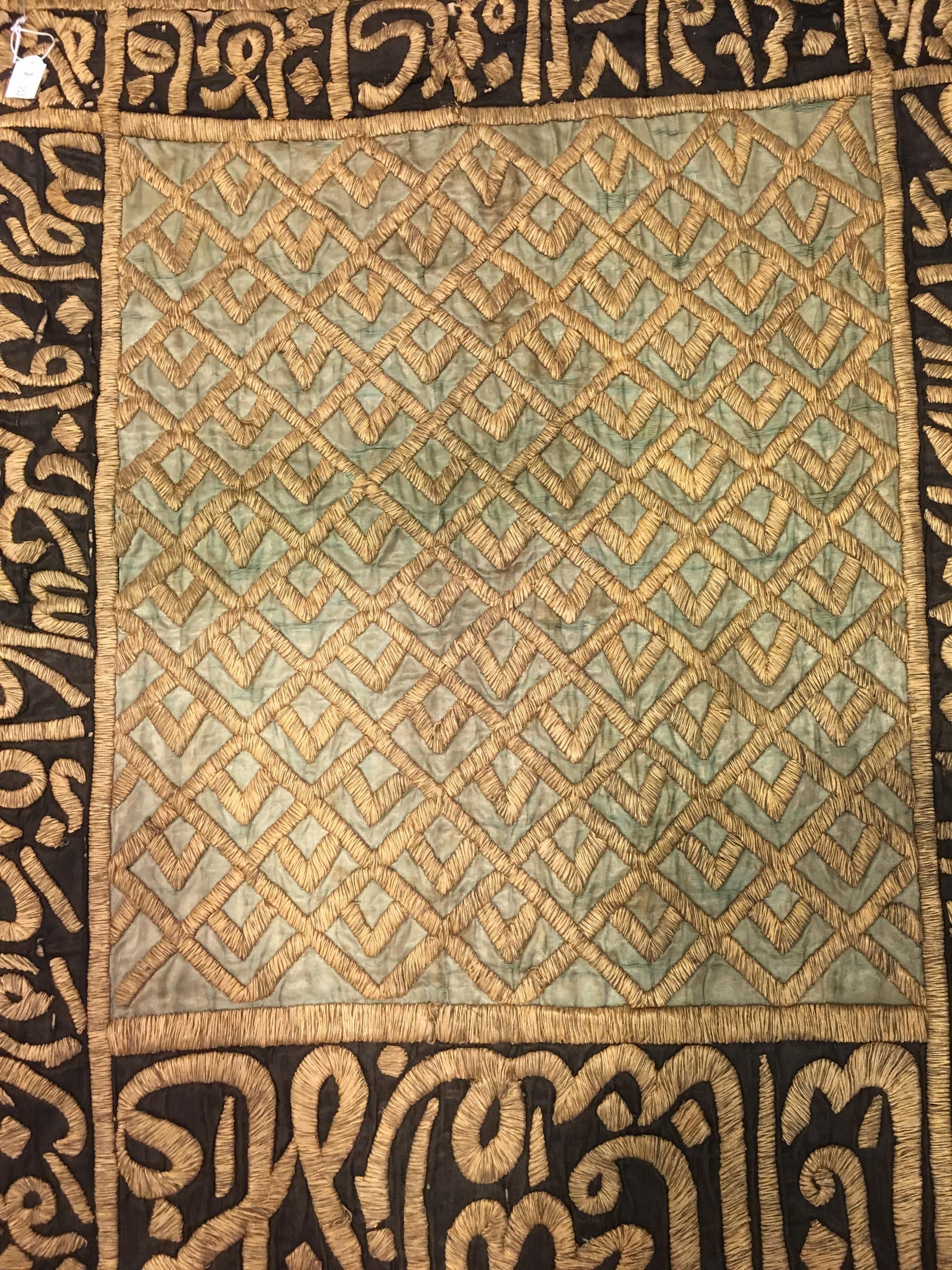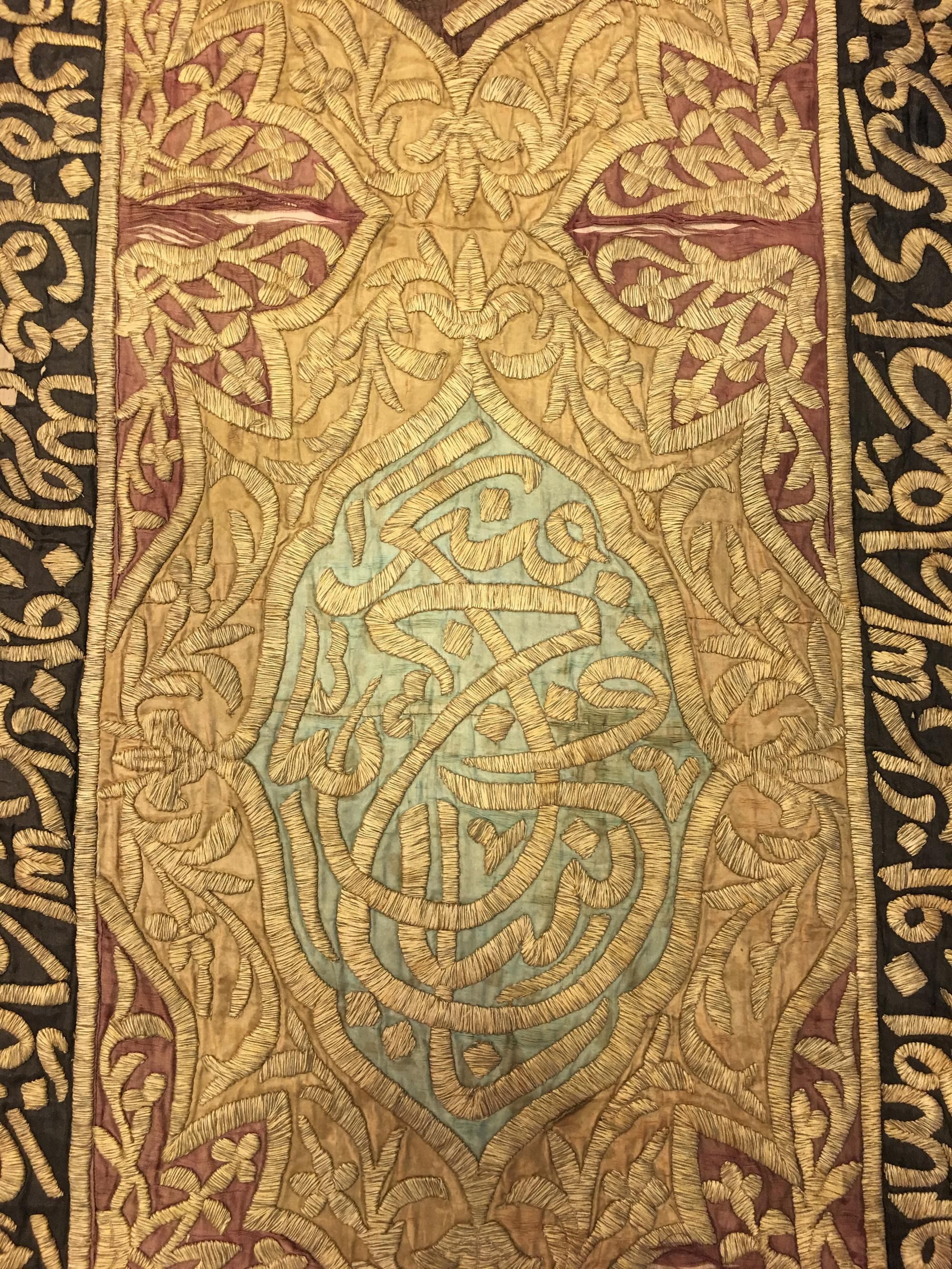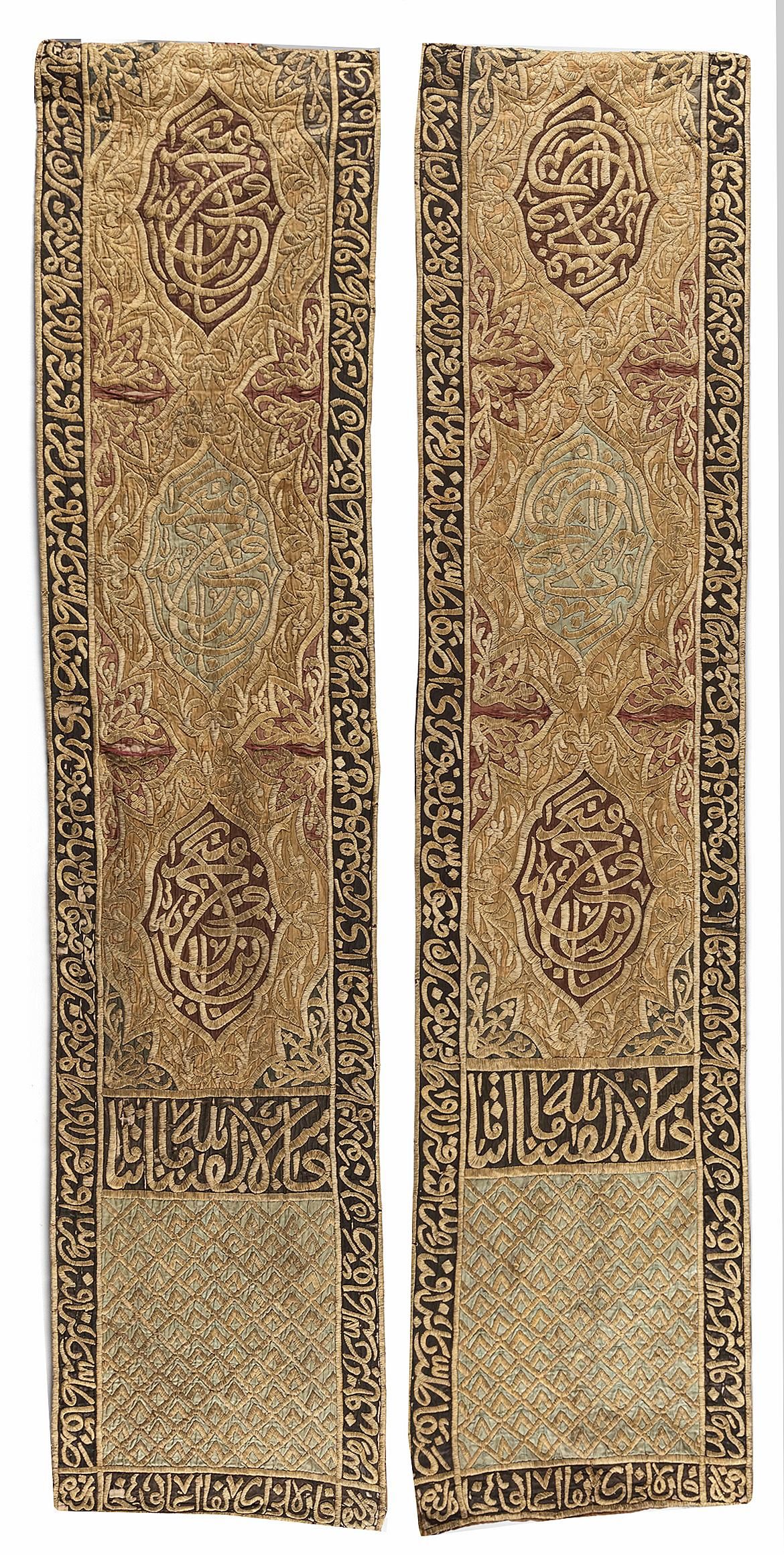 Two hanging panels of a portiere, the gold, black and red satin grounds embroidered in heavily couched gilt calligraphic cartouches. 60 by 250 cm.