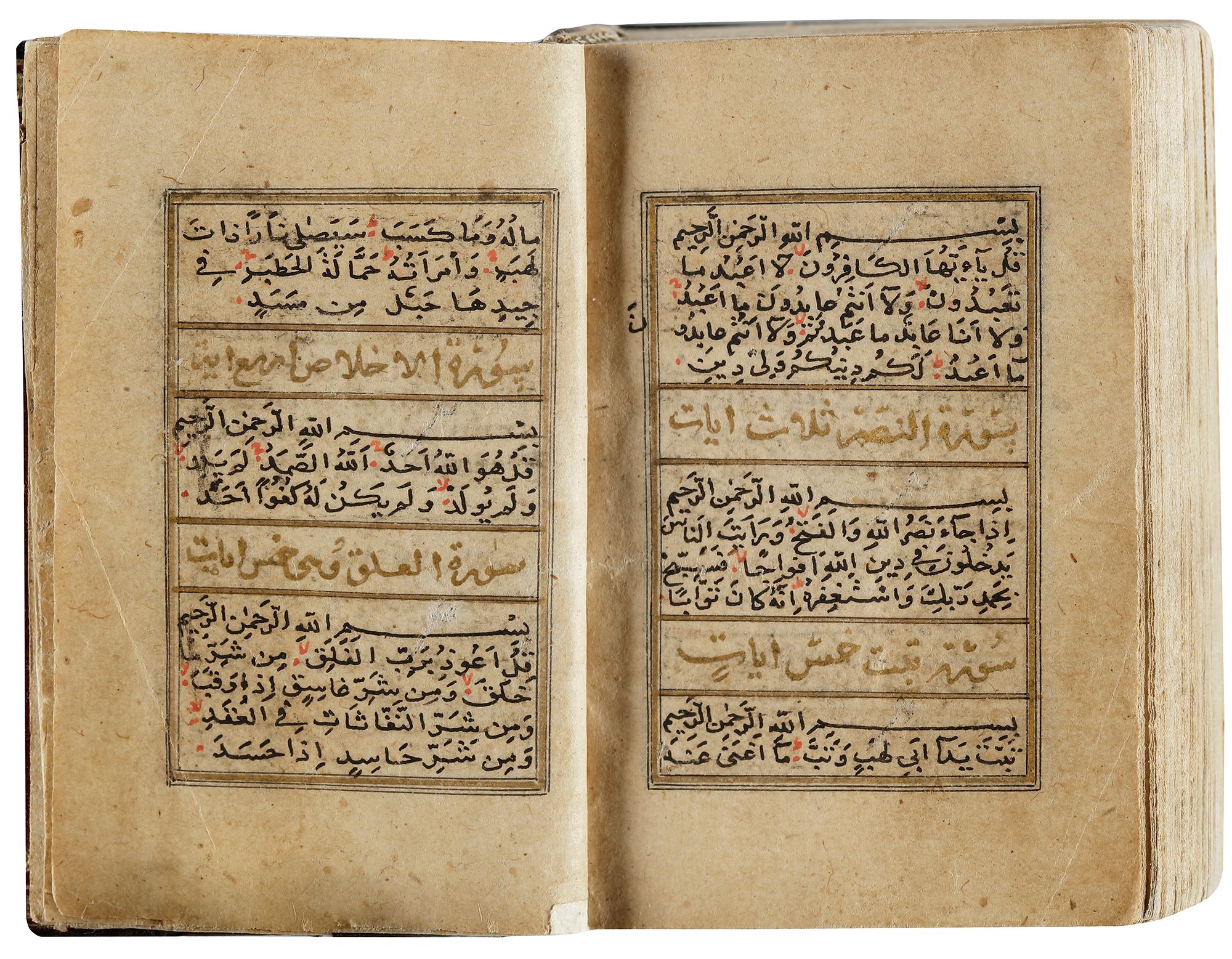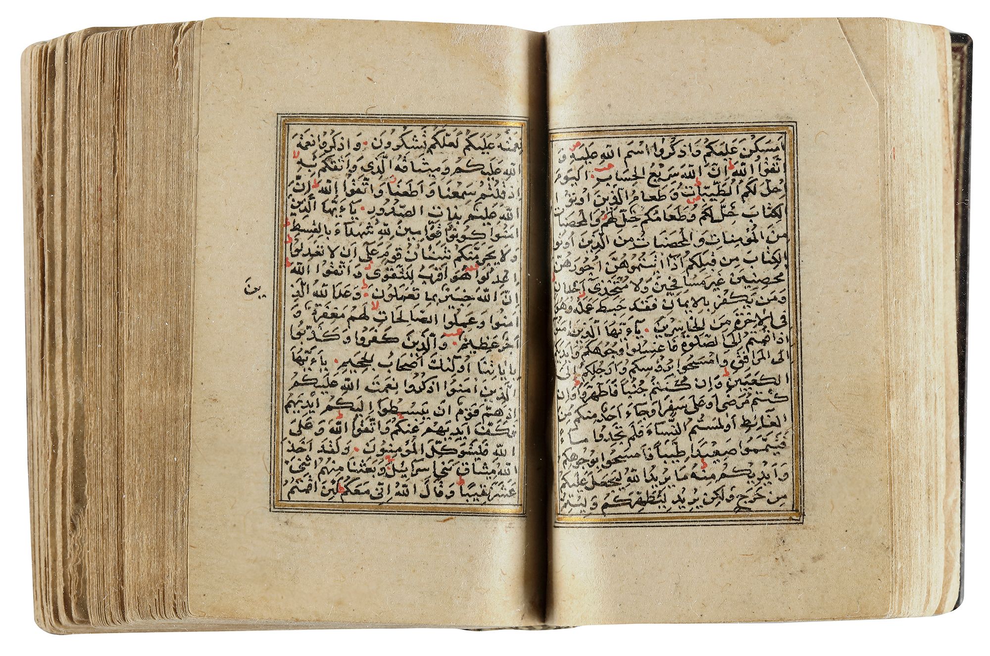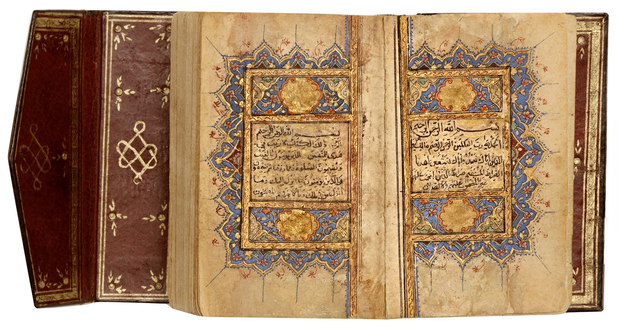 An Arabic manuscript on paper, 17 lines to each page in bold black naskh script within a gilt and polychrome borders. A complete Quran, surah headings in gilt thuluth within gilt and polychrome borders, two opening biofolia with striking blue and gilt decoration containing five lines in clouds reserved against a sprinkled gilt ground, diacritics and vowels in red with red occasional marginal "Hizb and Juz" markers. The last page Due al-Khatm and dedication, signed 'written by al-Fakir Ghiath Al-Din Muhammed bin Muhammed Hussain AL-Hafiz al-Sabzevary in 988 AH.