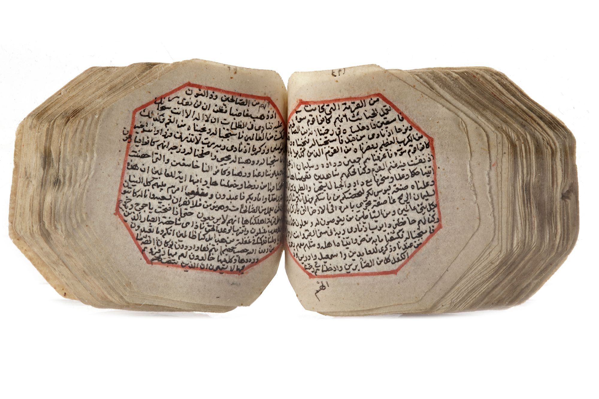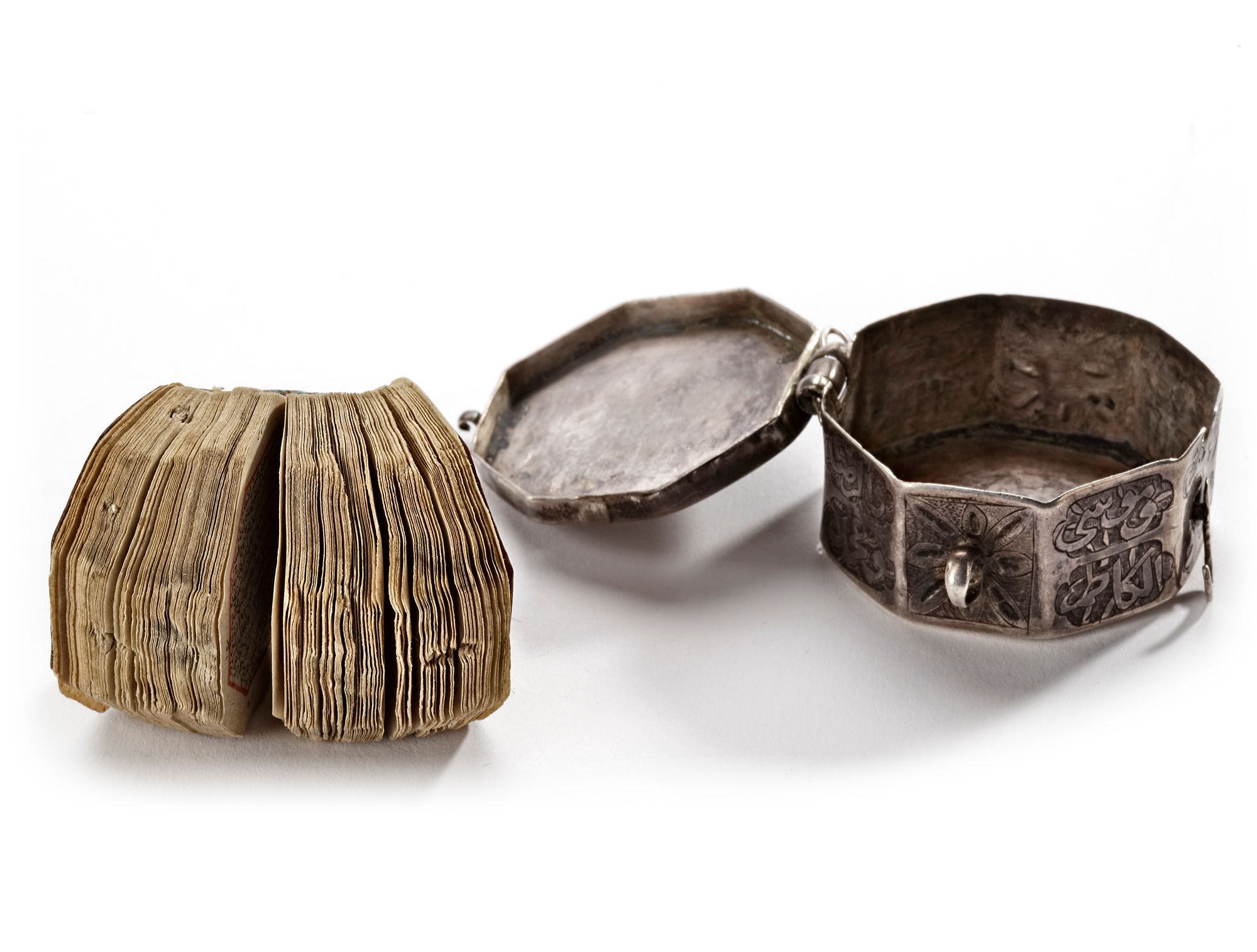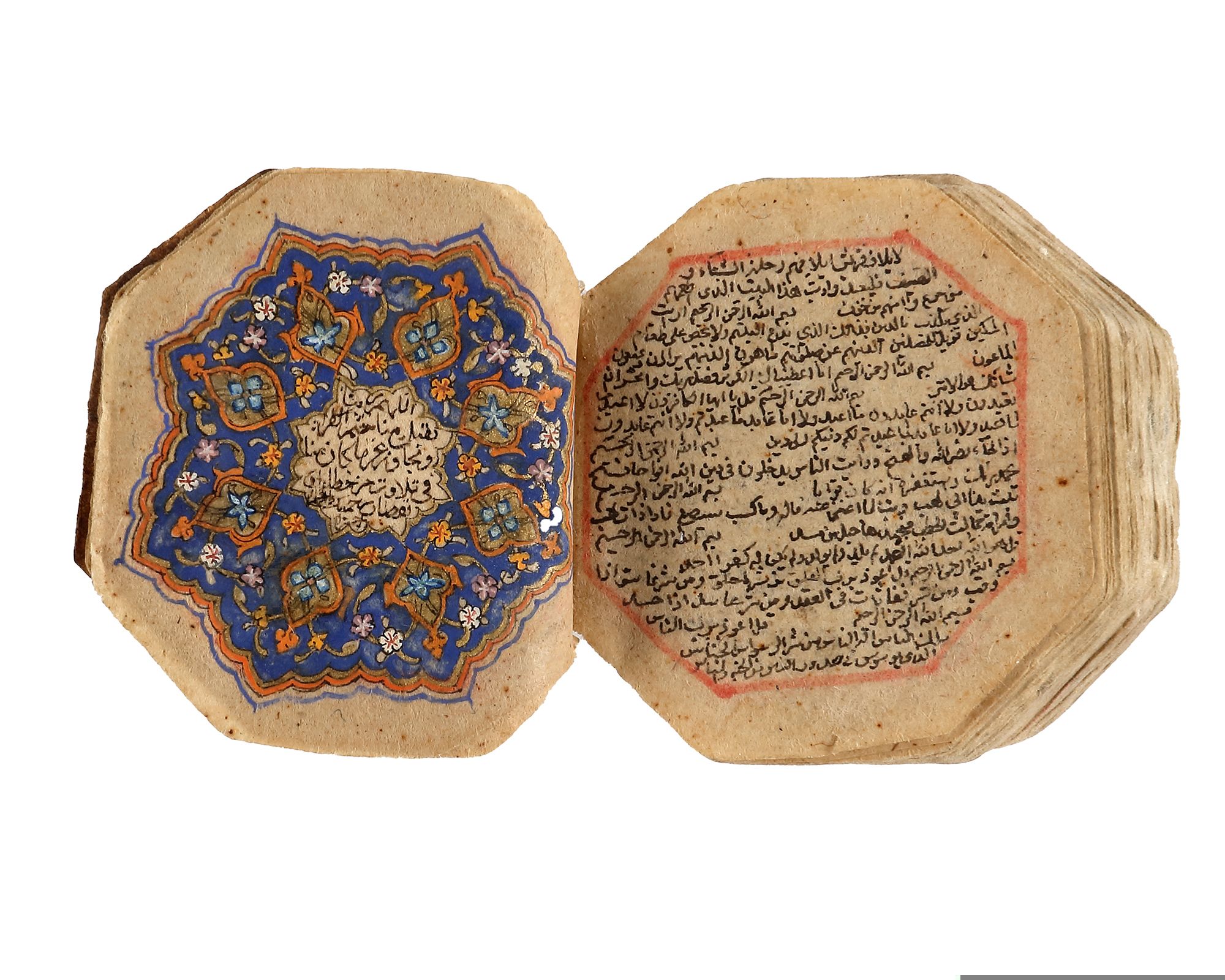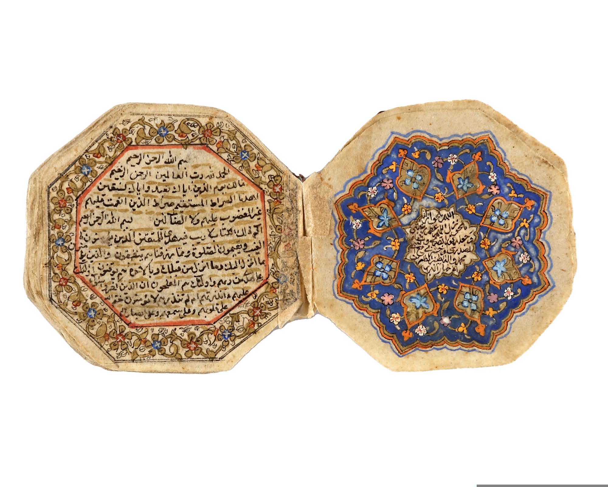Arabic manuscript on paper, 18 lines to the page written in minute naskh script in black ink with diacritics and vowel points in black, framed by red border, two illuminated double-page frontispiece with gold and blue decoration, the last page with due al-Khatm and dedication.