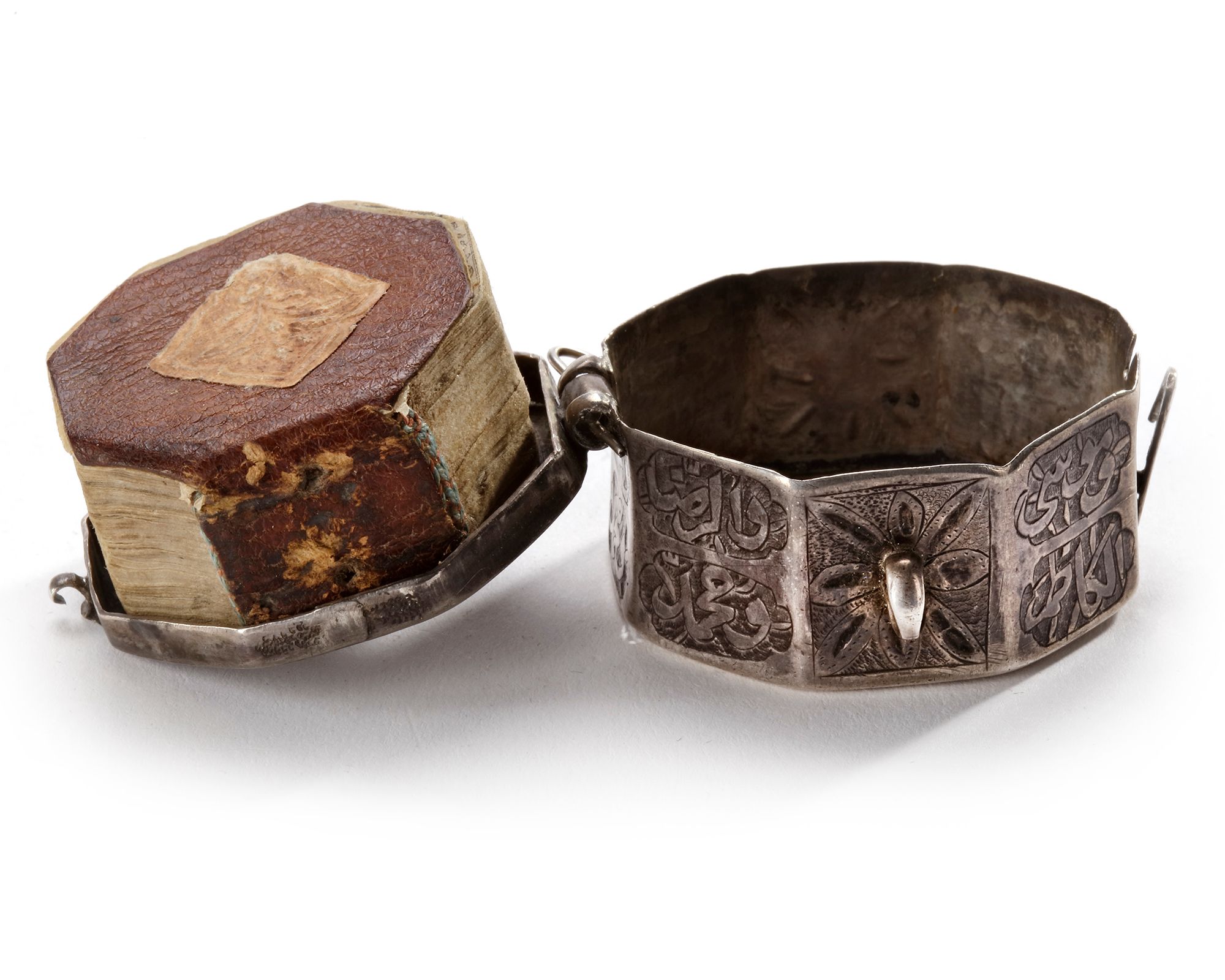 In brown morocco binding, with silver case decorated with Quran verses in naskh script.