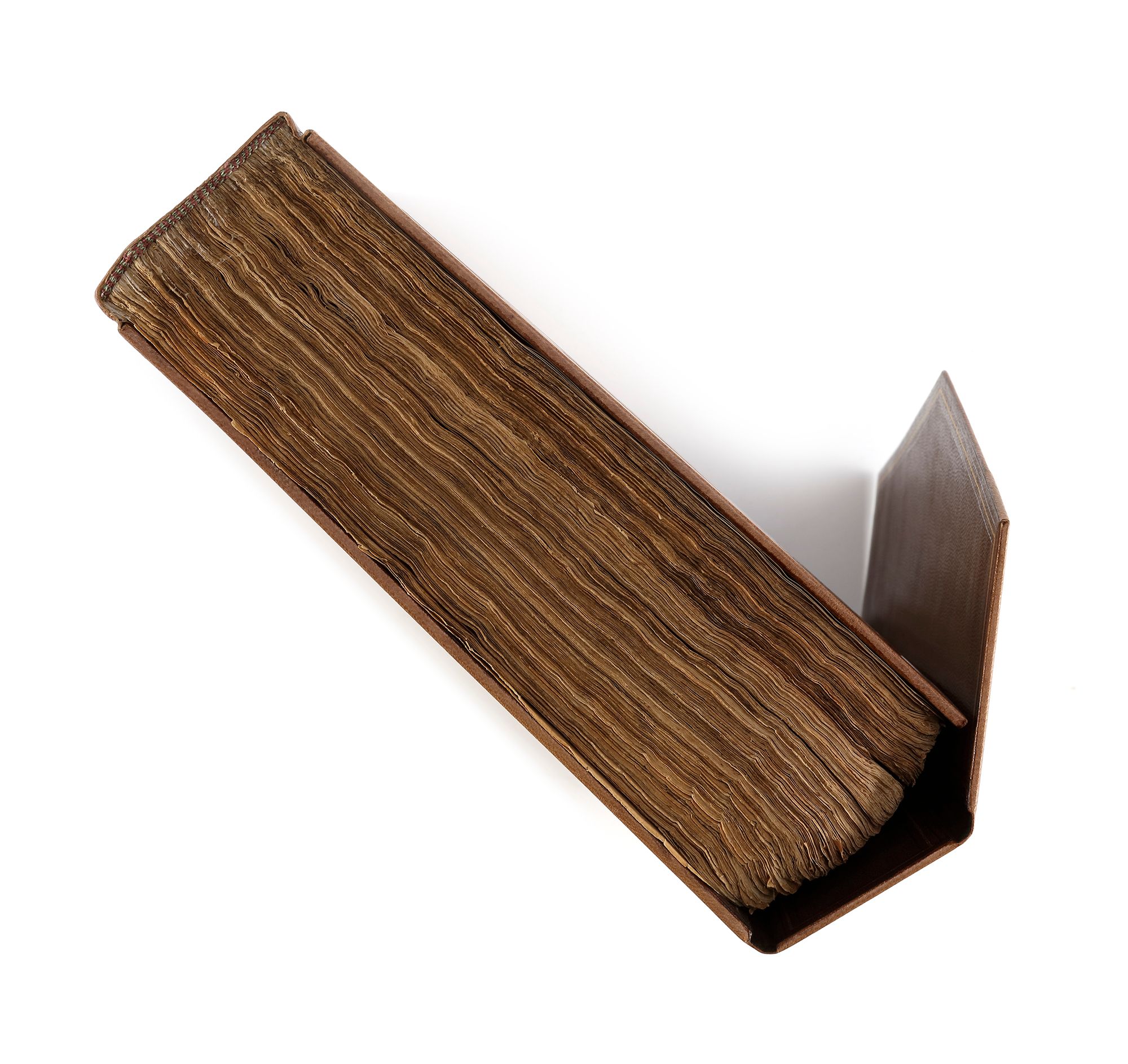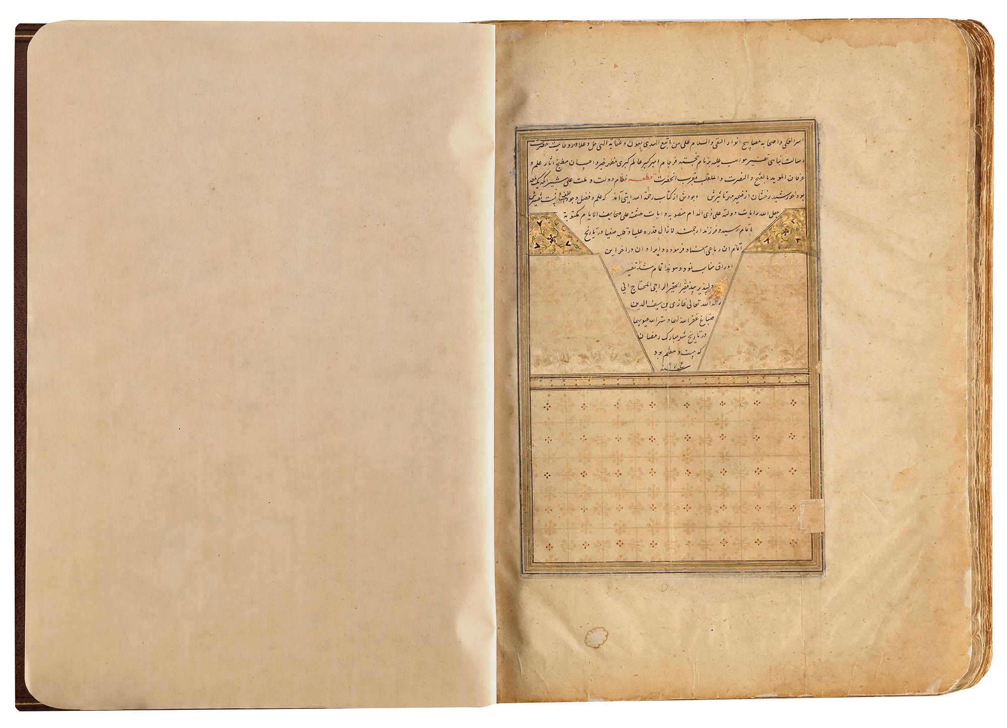 Gilt brown binding with flap decorated with gilt floral ready sprays.