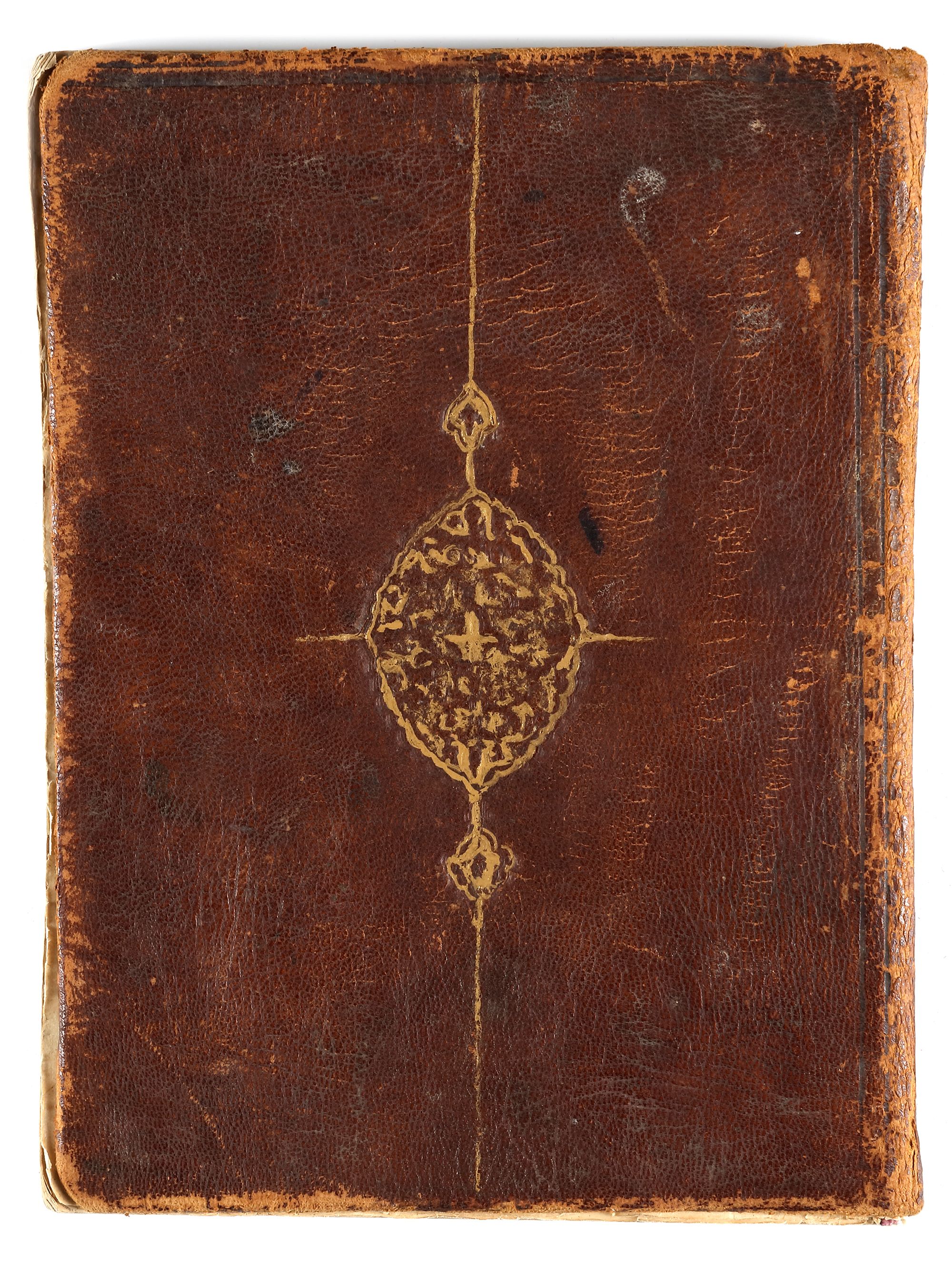 مجلد بغلاف من جلد المورقو البني، مزين بنقوش زهرية مذهبة. الأبعاد: 15 × 20 سم