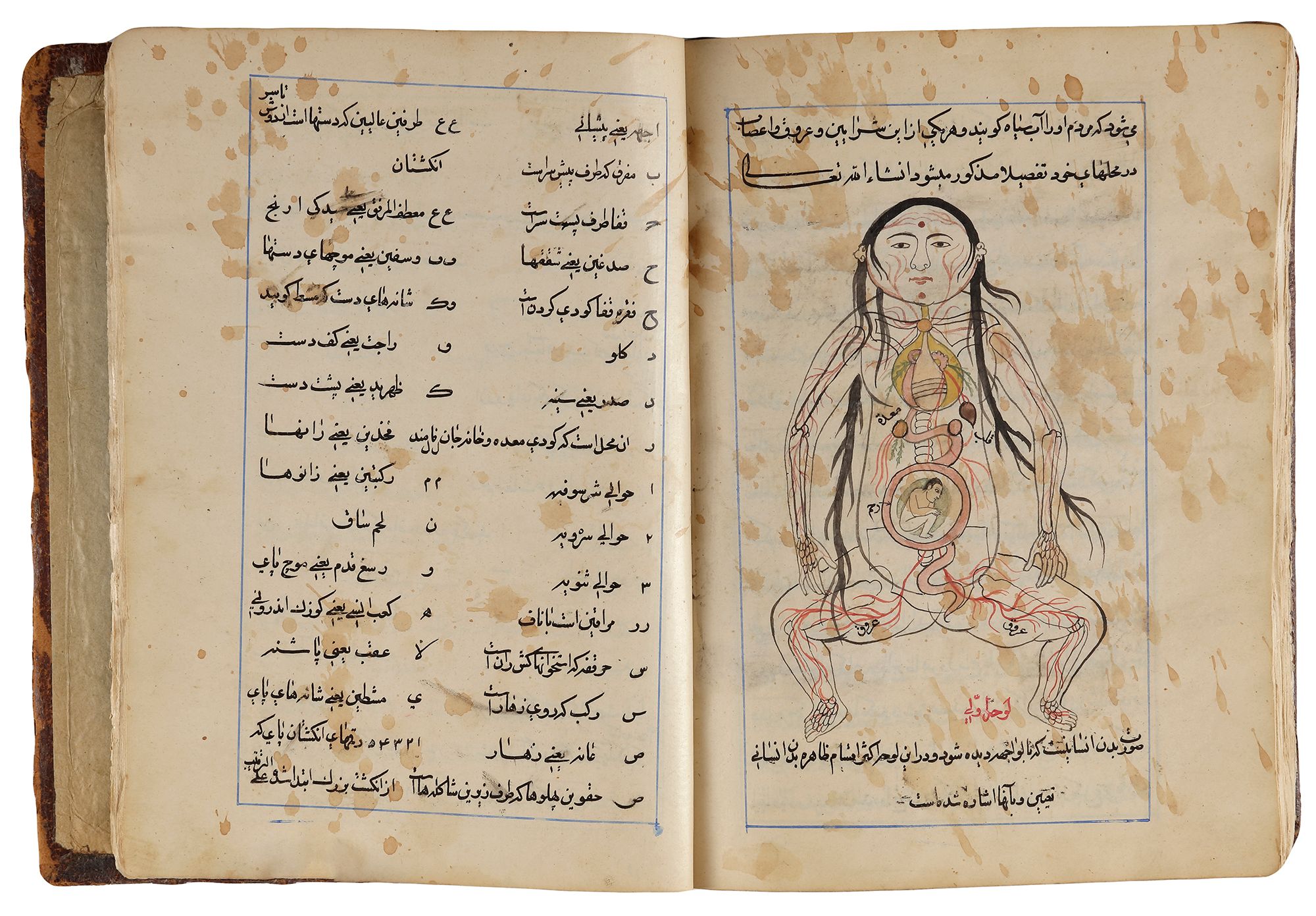 مخطوطة فارسية على الورق، تحتوي على 90 ورقة بالإضافة إلى ورقتين فارغتين، كل صفحة تحتوي على 16 سطرًا، مكتوبة بخط النسخ الأسود، مع عناوين وكلمات مرجعية بالحبر الأحمر، ومحاطة بإطار أزرق. الصفحة الأولى مزخرفة بالذهب وبزخارف زرقاء ملفتة في الأعلى.