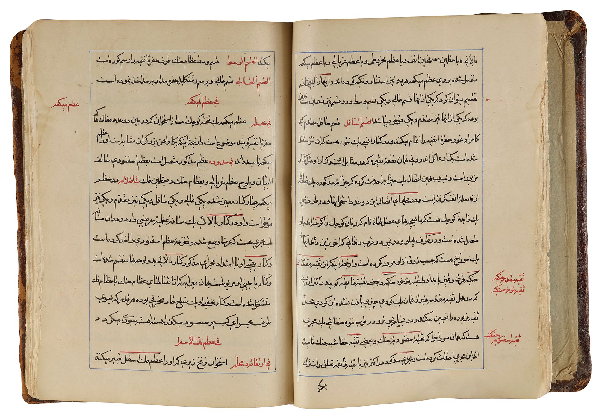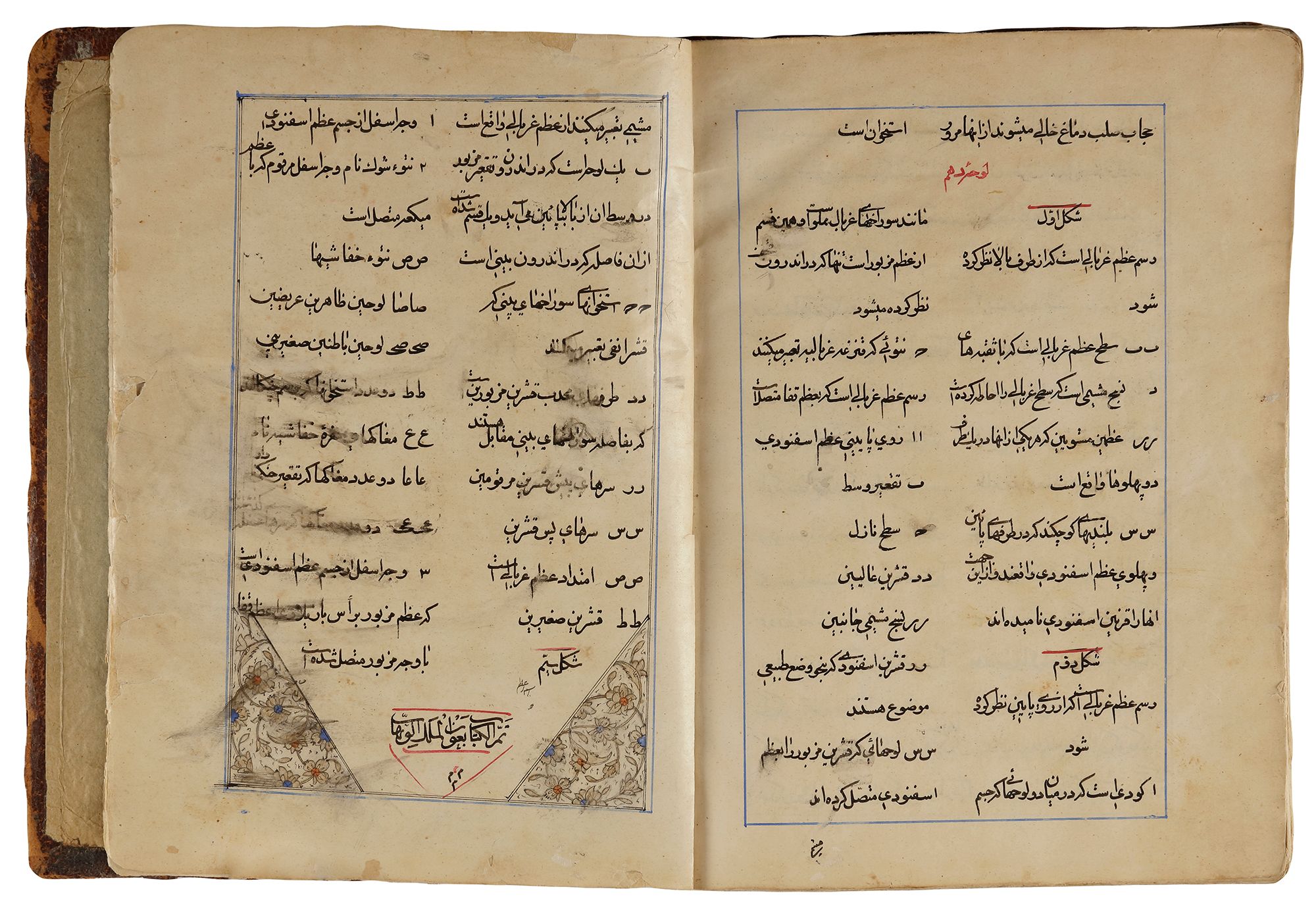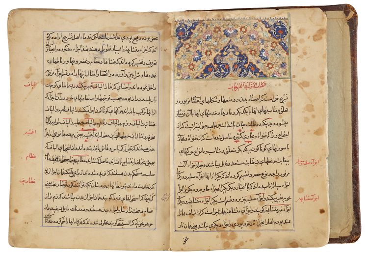 Persian manuscript on paper, 90 leaves with 2 fly-leaves, 16 lines per page, written in black Nasta'liq script, with catchwords and titles in red ink, and bordered in blue. The first page features gilded decoration and striking blue embellishments at the top.