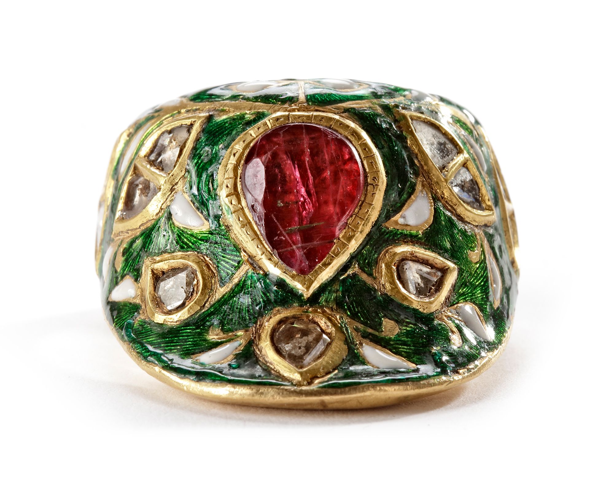A GEM-SET AND ENAMELLED GOLD ARCHER'S RING, NORTH INDIA, CIRCA 18TH CENTURY