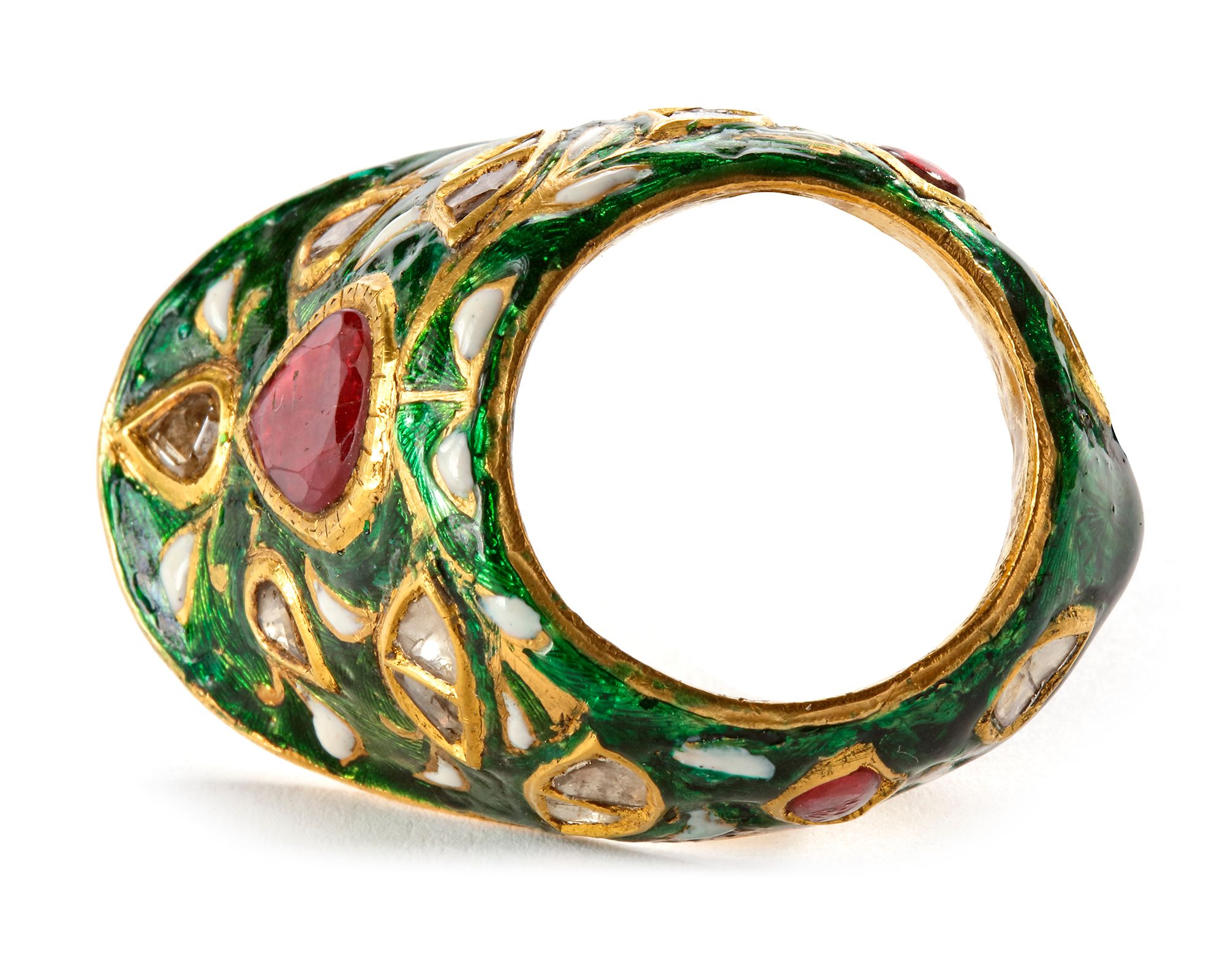 Decorated with rubies and diamonds set in the kundan technique against a green enamelled ground.