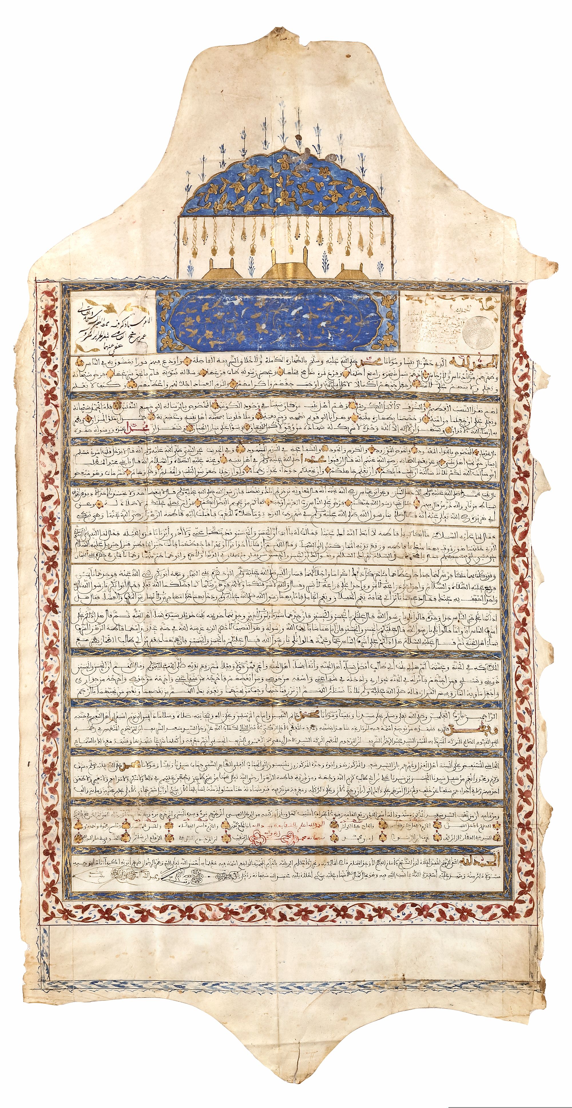 Arabic manuscript on vellum, with 35 lines written in black Maghribi script. Catchwords are in gilt ink outlined in black, and gold verse rosette markers are outlined in black and pointed in red. Interlinear borders are decorated with gilt floral leafy sprays on a blue ground, while the margins are adorned on the sides with red floral motifs and with a striking gilt and blue decoration at the top.