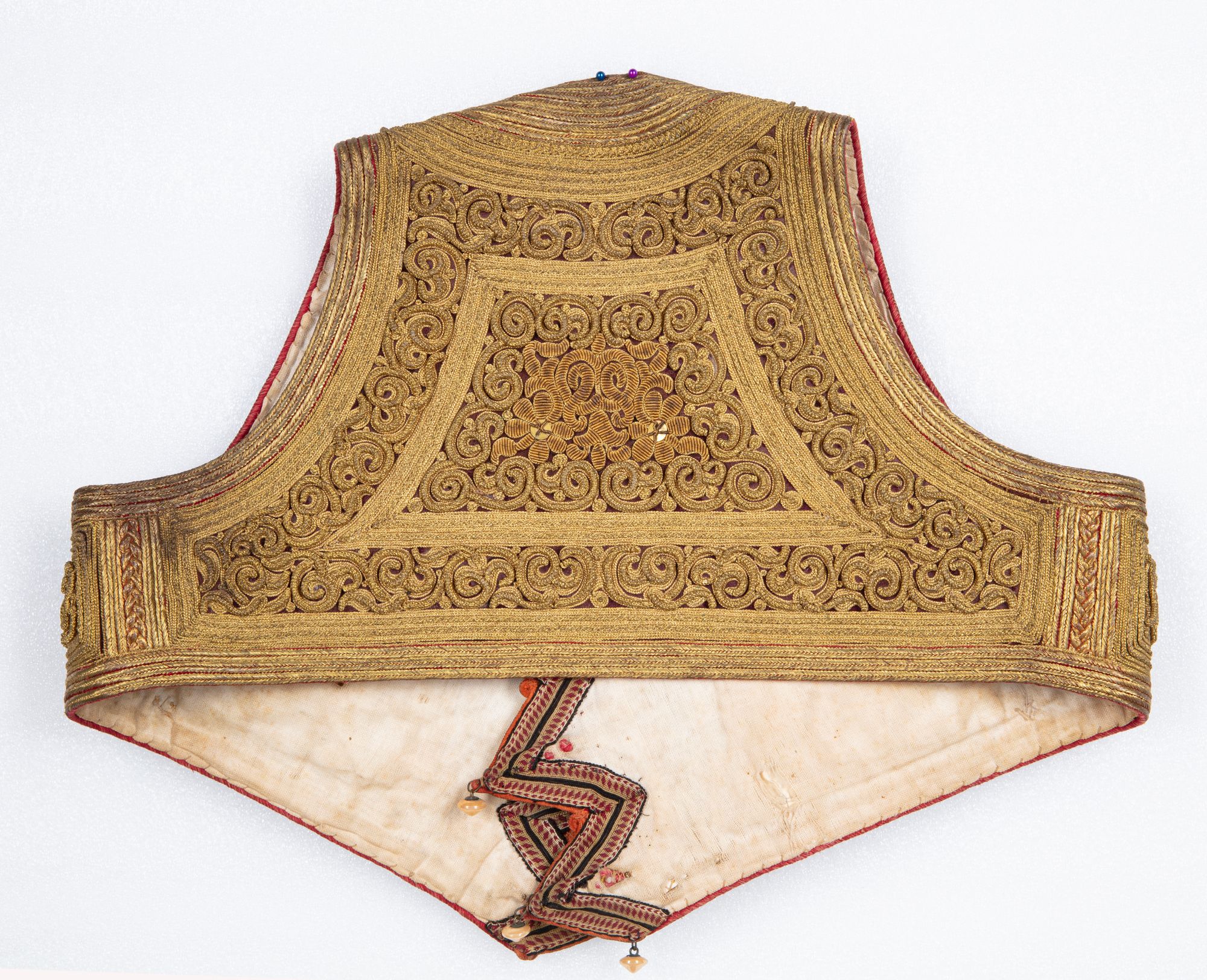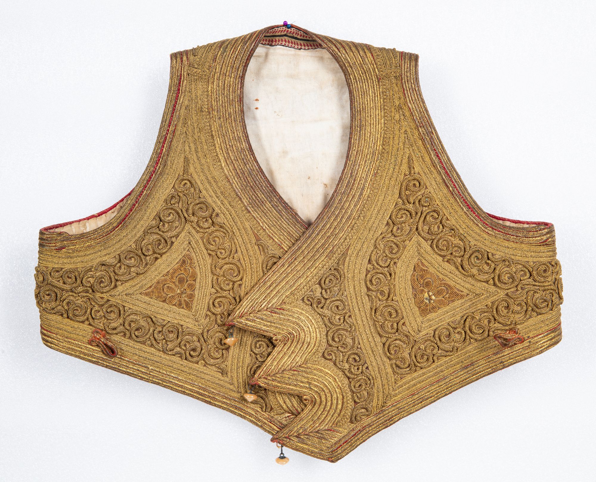 An Ottoman waistcoat embroidered heavily in gilt threads and embellished with dense design of flower head and floral leafy sprays. 35 by 44 cm.