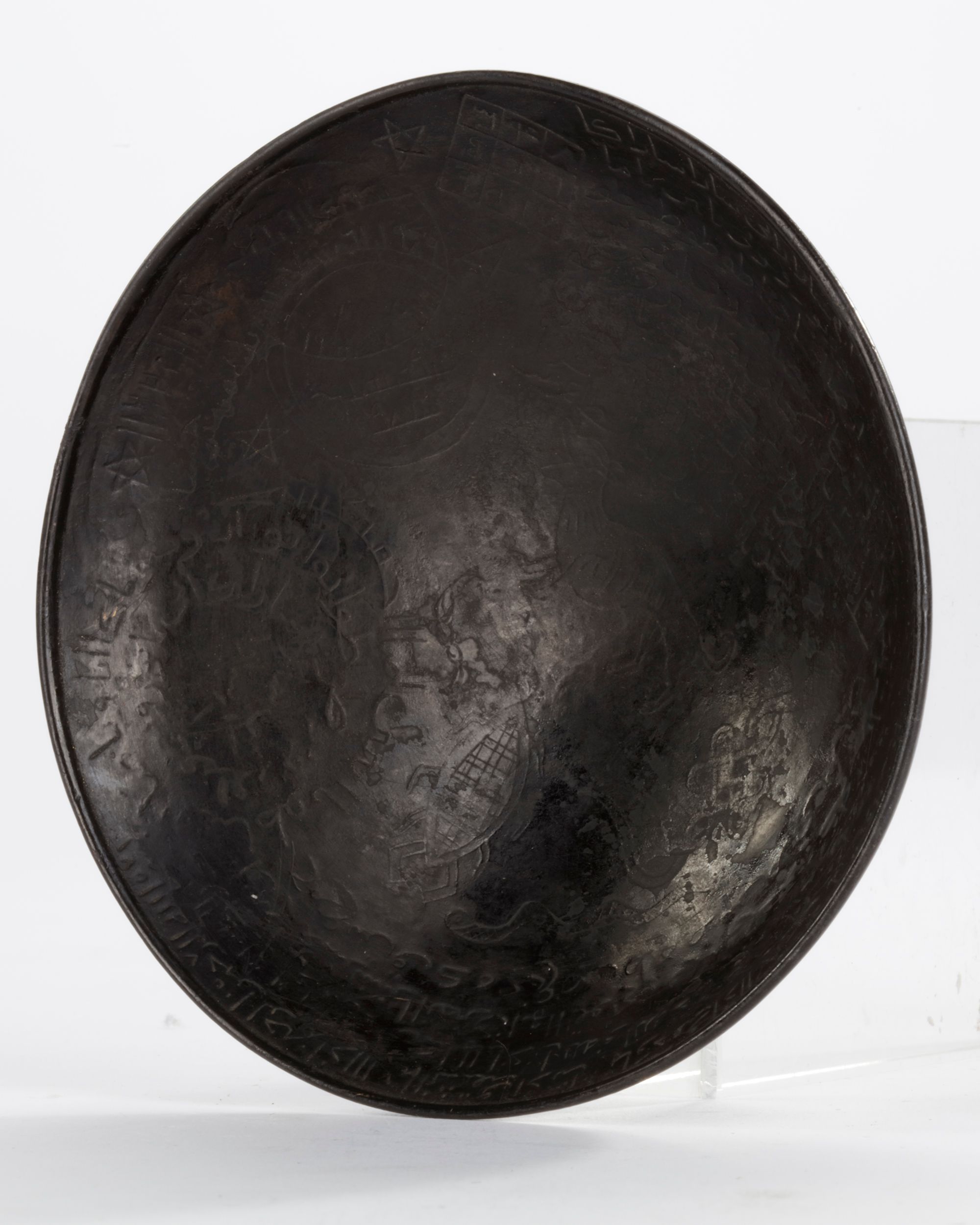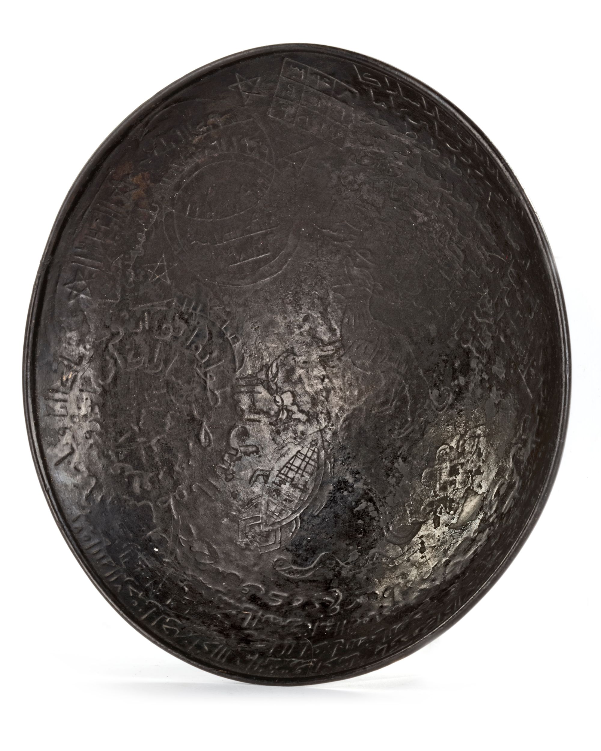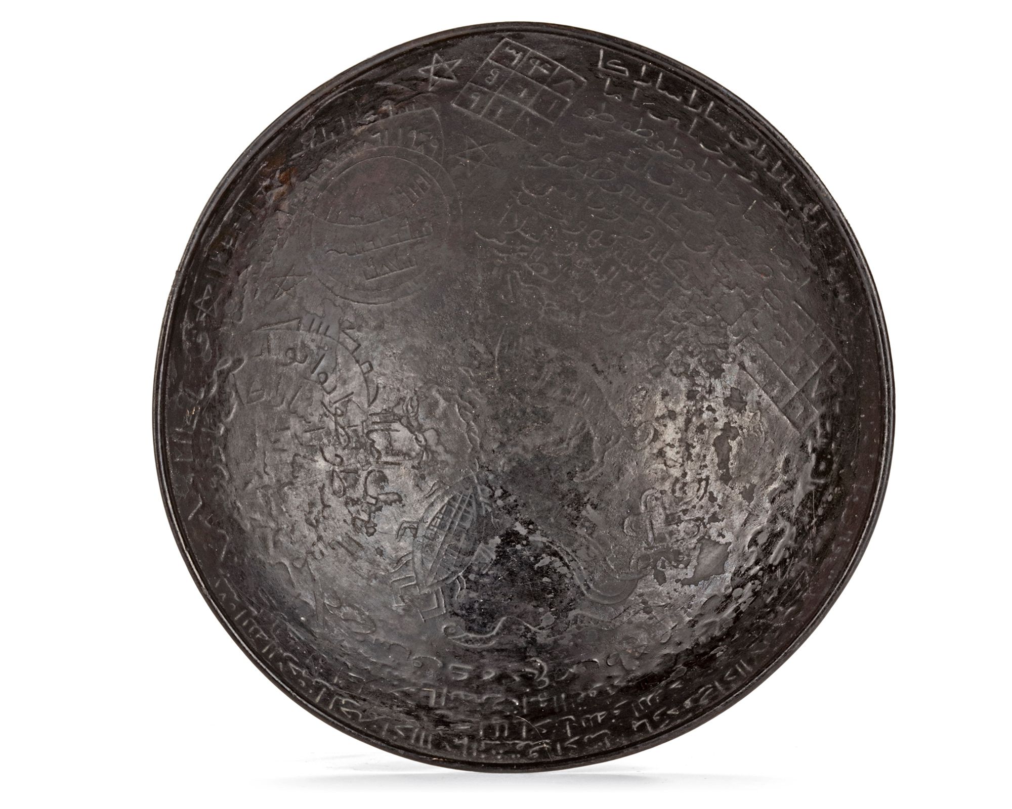 Shallow rounded form engraved to the interior with talismanic diagrams and inscriptions, stars and images of a dog, scorpion, snake and two-headed dragon, the exterior with a band of inscriptions to the rim.