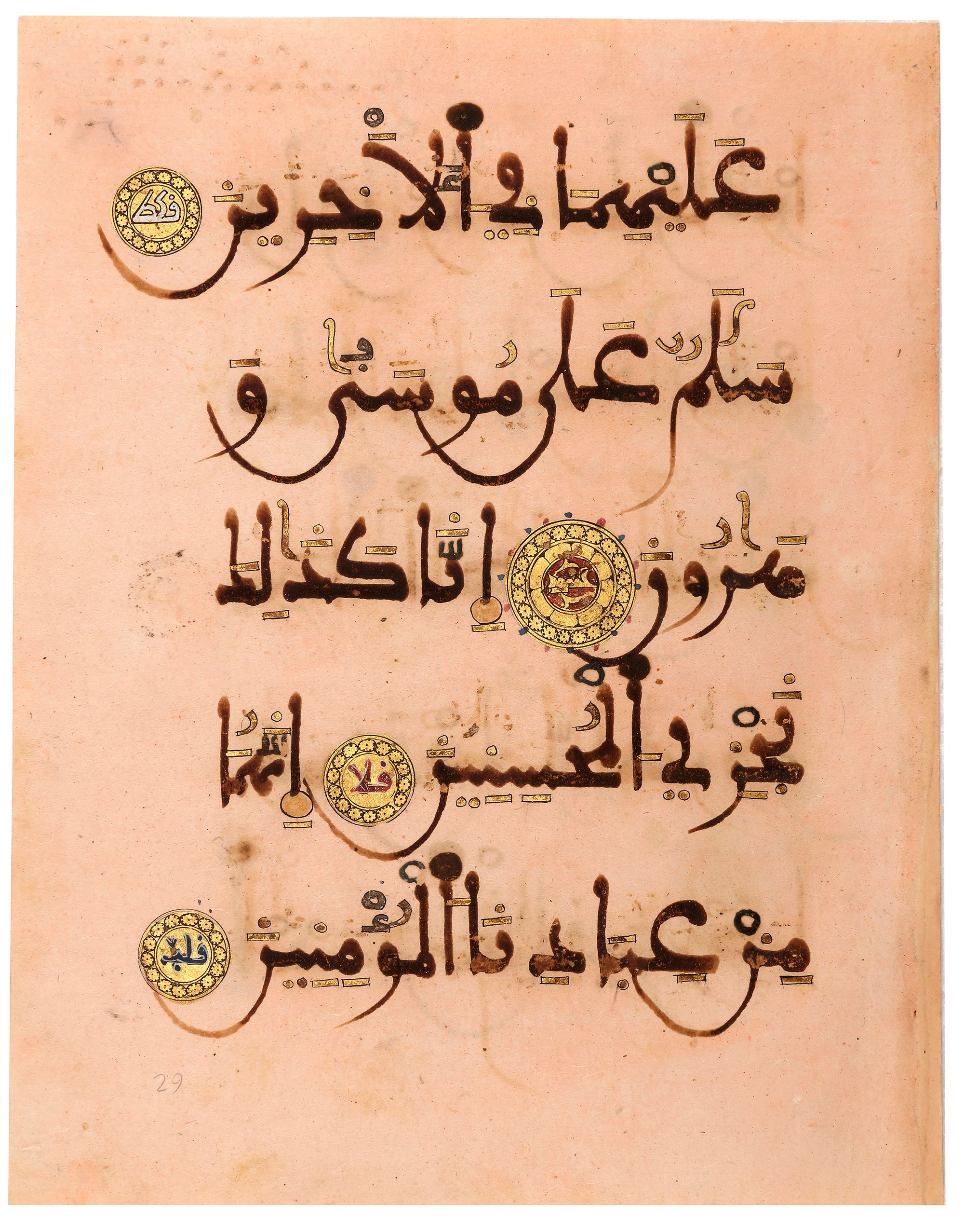 This is a fine example of Islamic manuscript production from the Muslim west. It was written on paper, which in medieval Islamic Spain was unusual, vellum still being the preferred material for the writing of the Quran. The paper was dyed pink, a rare luxury aspect; the script is a fine example of large scale Maghribi (the marking of the hamzas indicating a probable Andalusian origin) and the spacious arrangement of the script on the page allowed for the clear marking of the diacritics and vocalisation in colours and gold and the elaborate illuminated devices between verses. A particularly unusual aspect of the verse divisions is the use of 'abjad letters to mark the exact verse count of every verse. The illumination of the devices marking the verse divisions is of very high quality and the size of the devices allows the use of a relatively complex design, as witnessed in the present example.