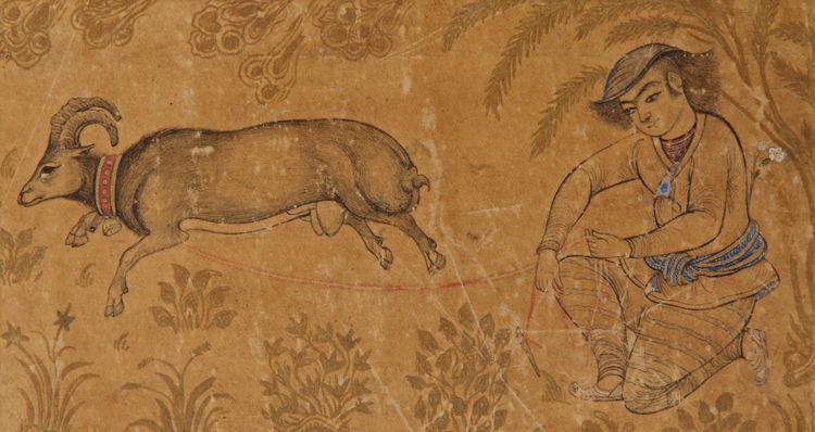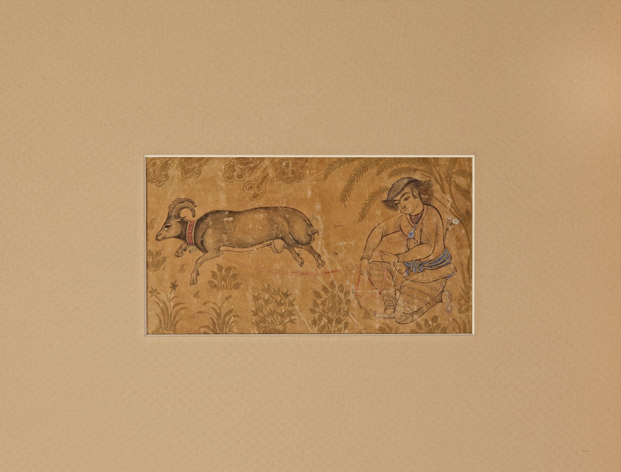 Ink and watercolor on paper, depicting a seated shepherd holding a tow of his goat in a landscape. 12 by 19 cm.