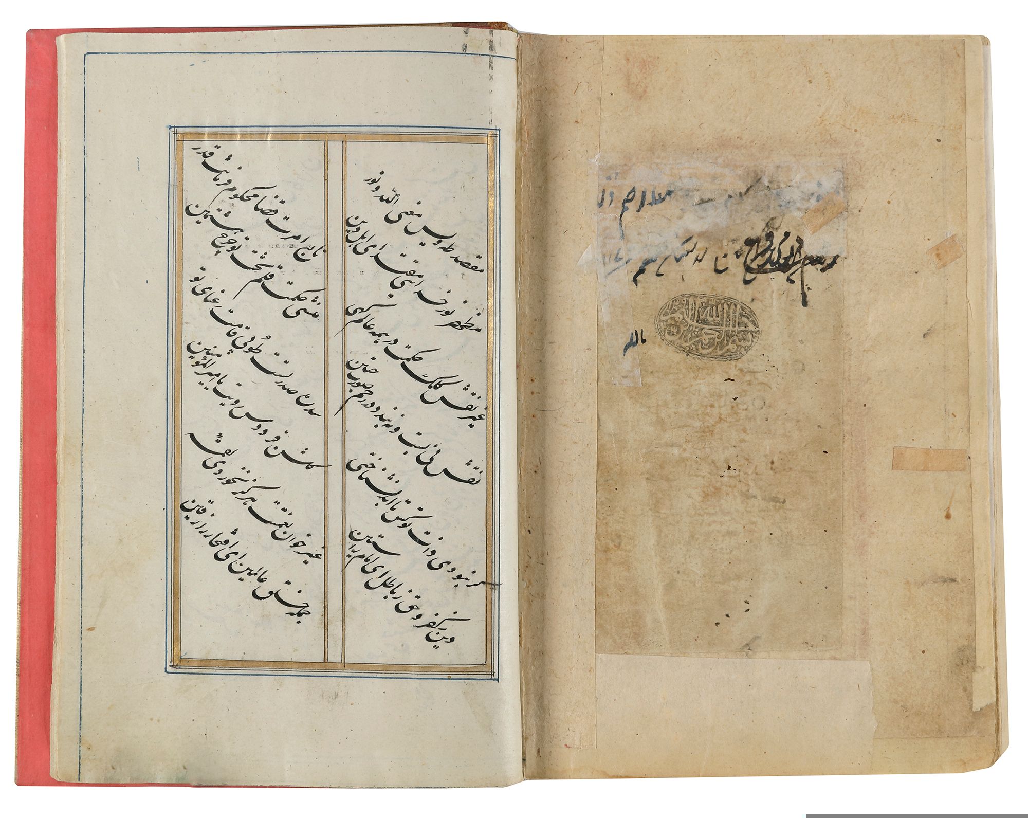 In later gilt Qajar lacquer binding with central cartouche enclosing spandrels containing scrolling floral vines.