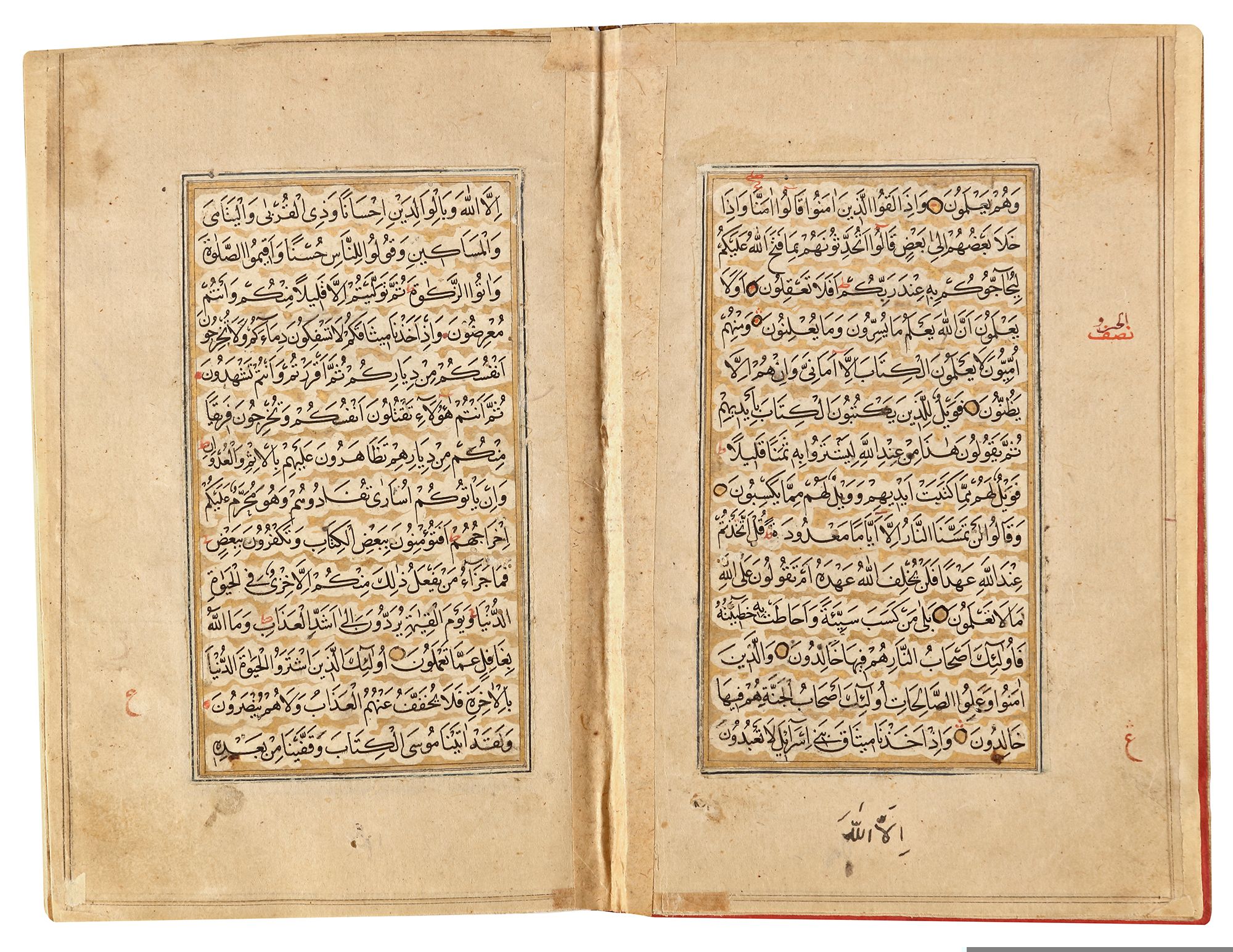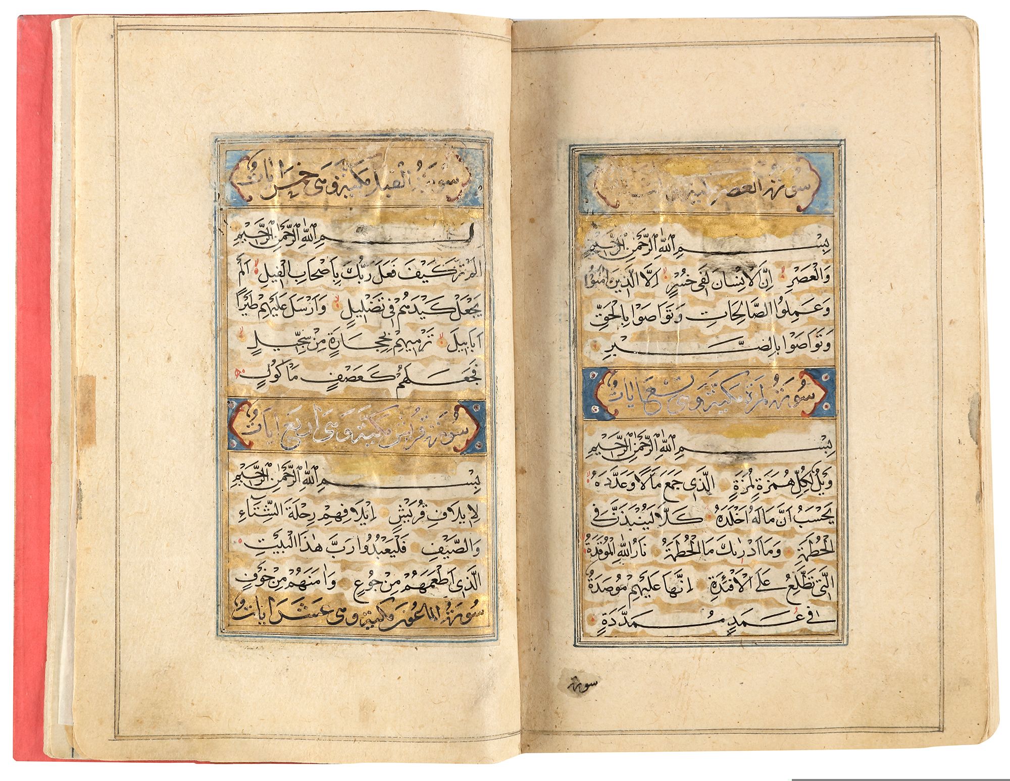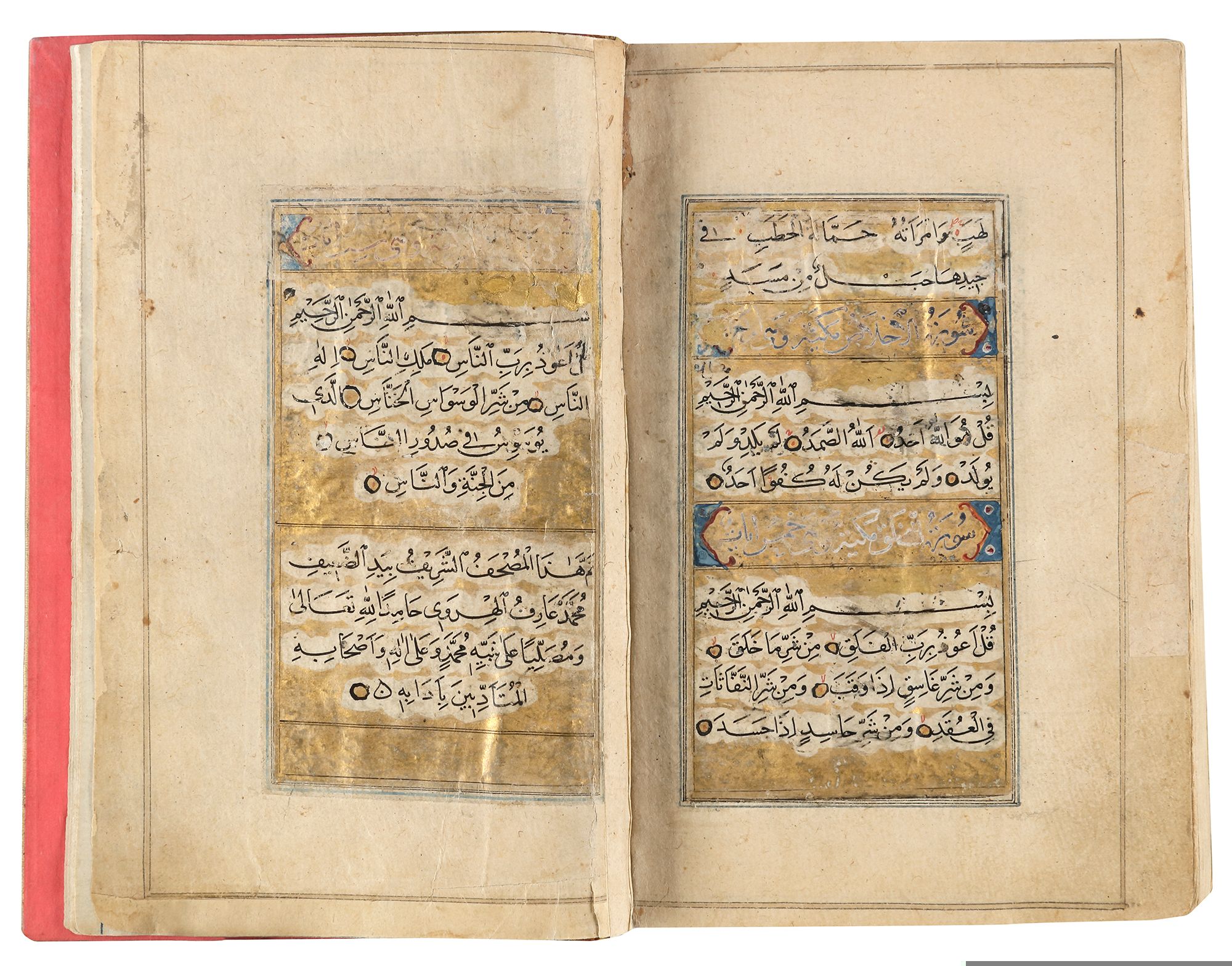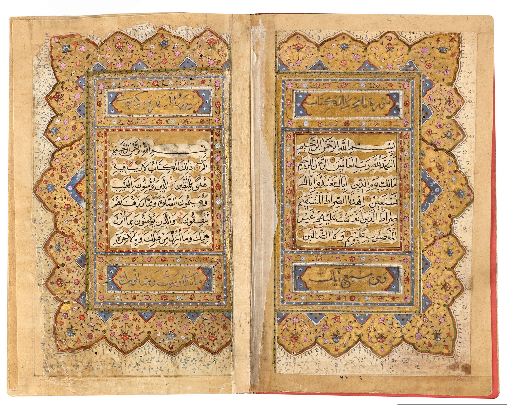 Arabic manuscript on paper, each page with 14 lines written in bold black naskh script in clouds reserved against a gold sprinkled ground, gold roundel verse markers outlined in black, diacritics and vowels in red, occasional marginal commentary notes indicating 'juz' and hizb'in red ink, surah headings in large white thuluth script on cartouches with a gilt blue floral illuminated ground, all ruled in gilt and blue borders, two opening bifolia fully illuminated in gold and polychrome framing 6 lines in clouds reserved against a gold sprinkled ground, end of the text with prayers and dedication.