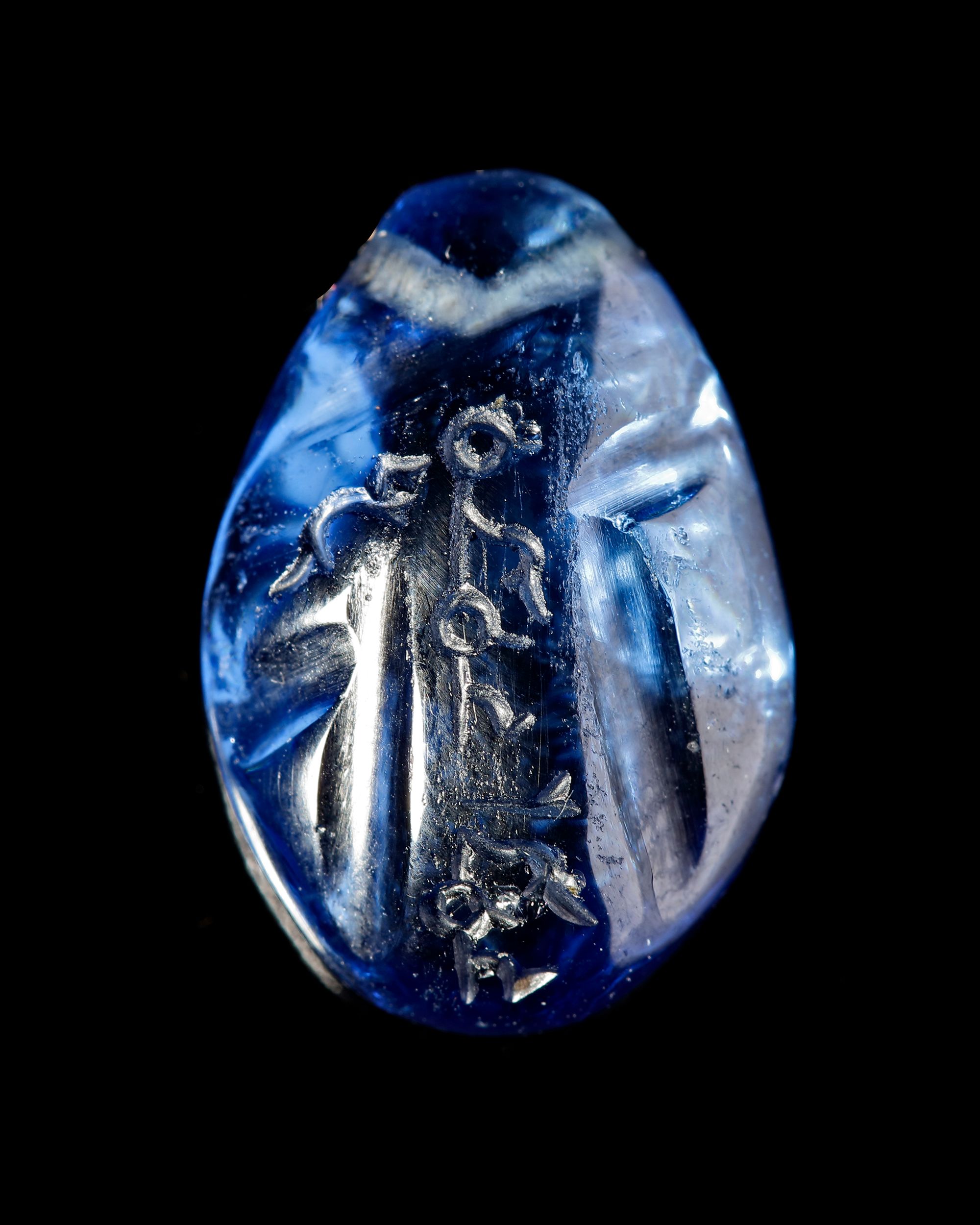 The dark blue sapphire of rounded shape, characteristic form featuring an engraved Kufic inscription.