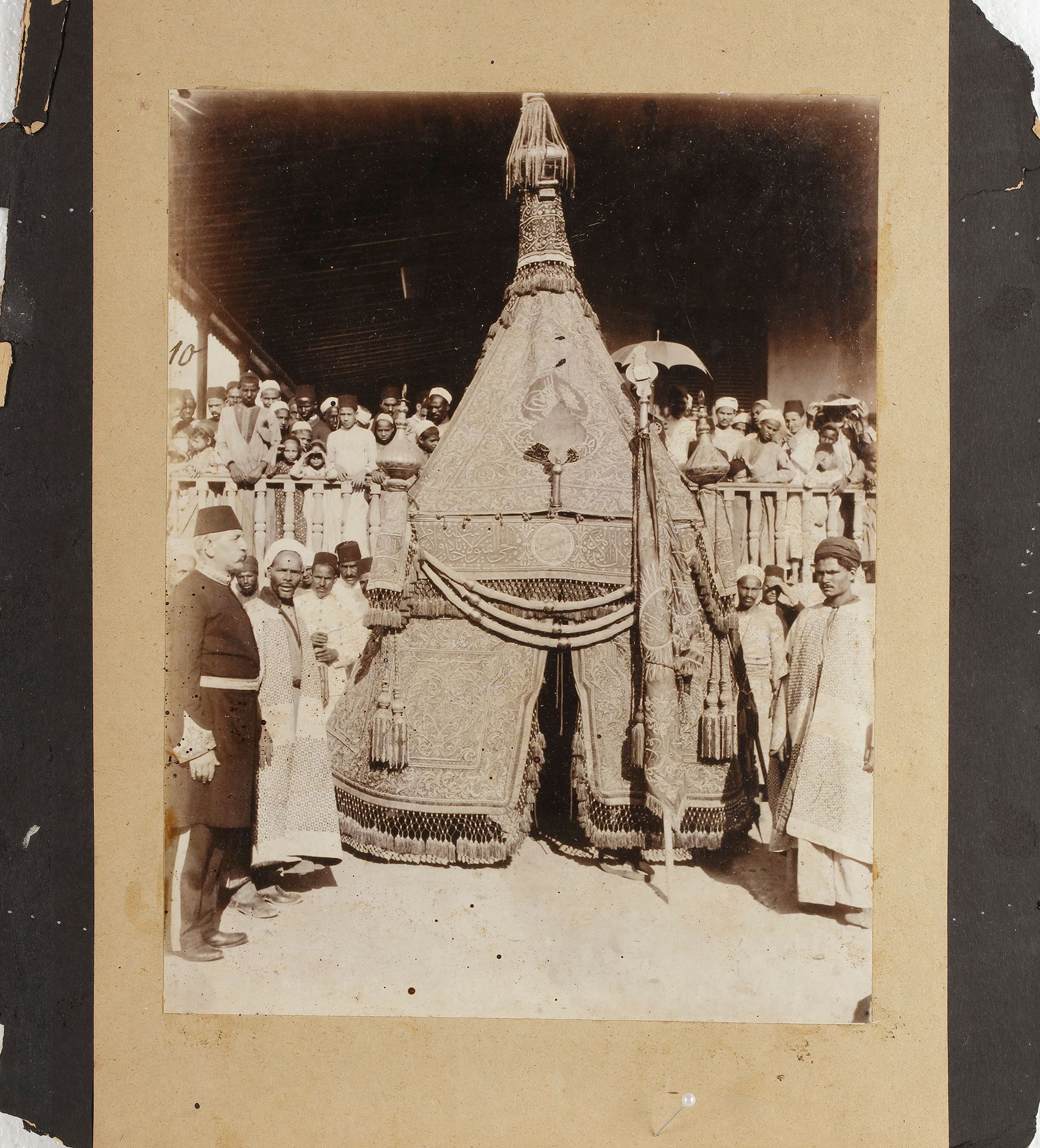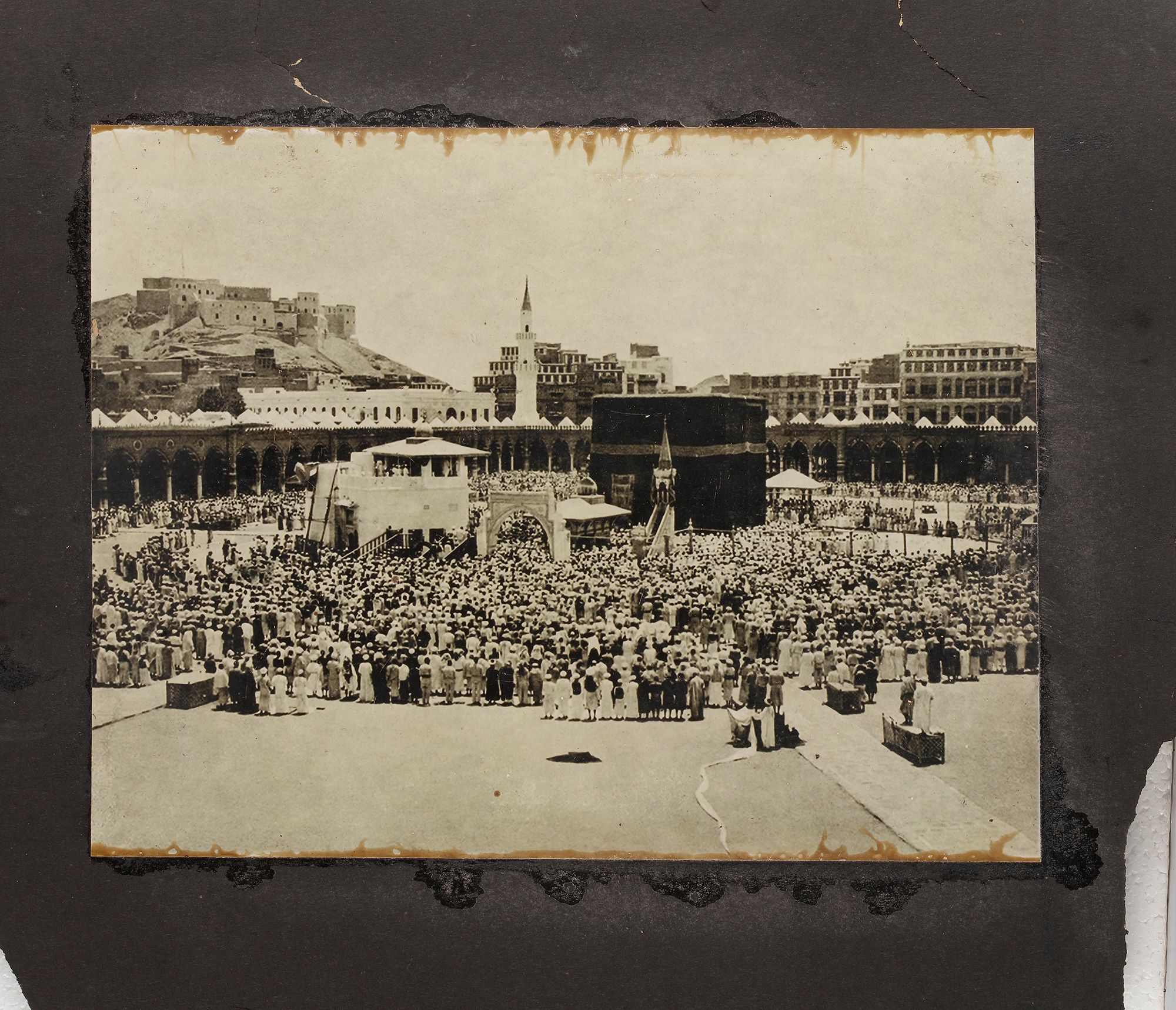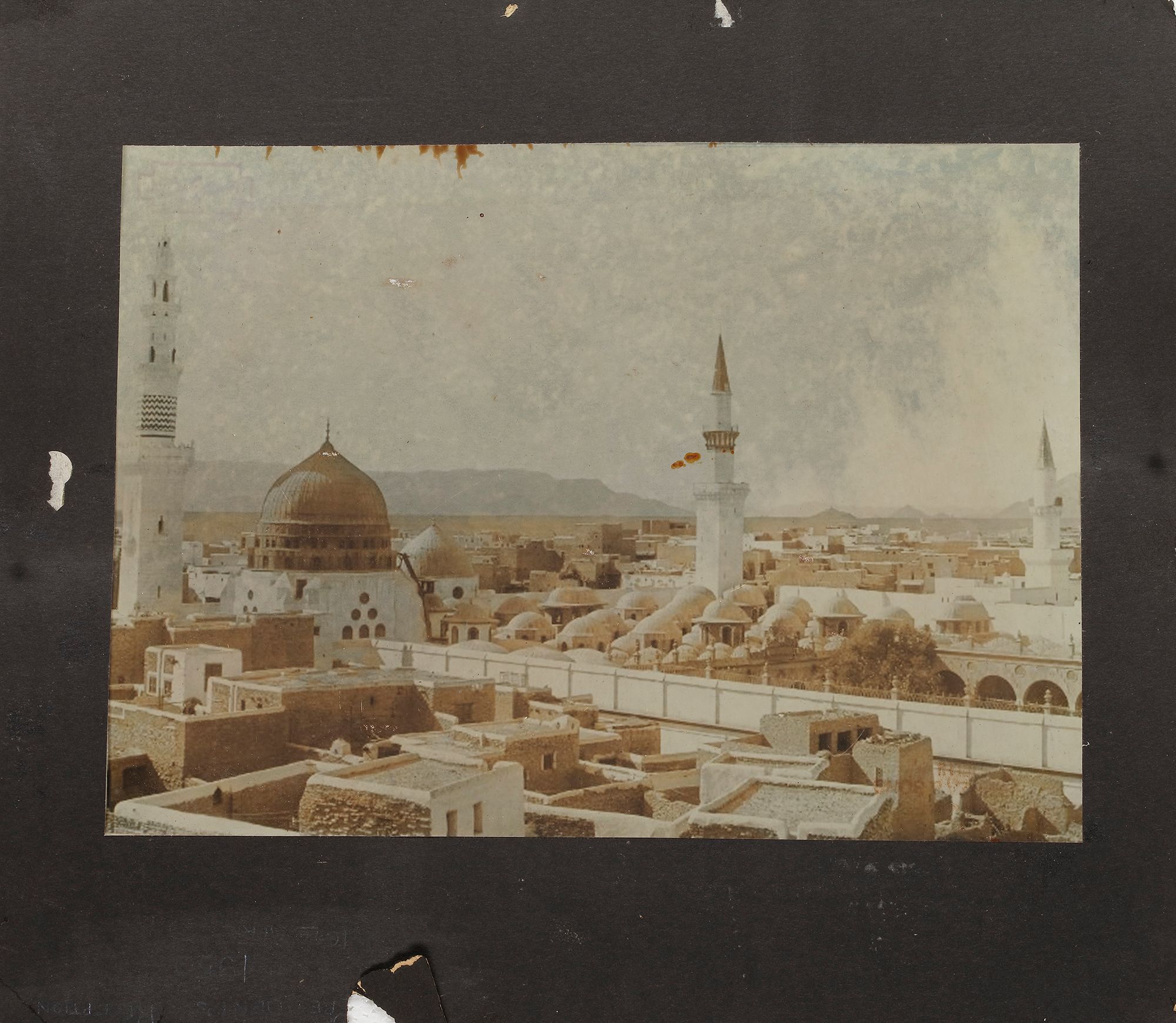 The photographs comprise a view of the Kaaba at Mecca, arrival of the Mahmal, a view of the city walls, and an interior of the Masjid-Al-Haram, tents at Mina and al-Masjid al-Haram