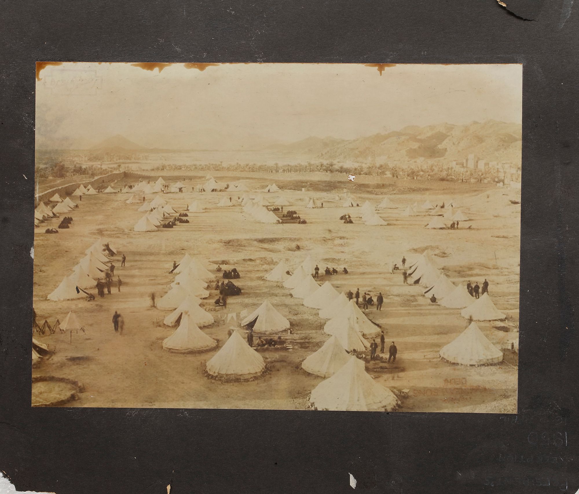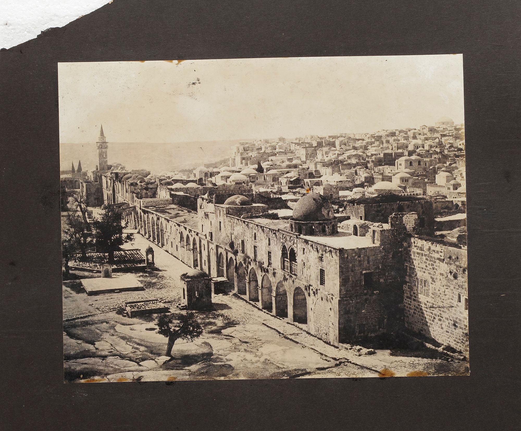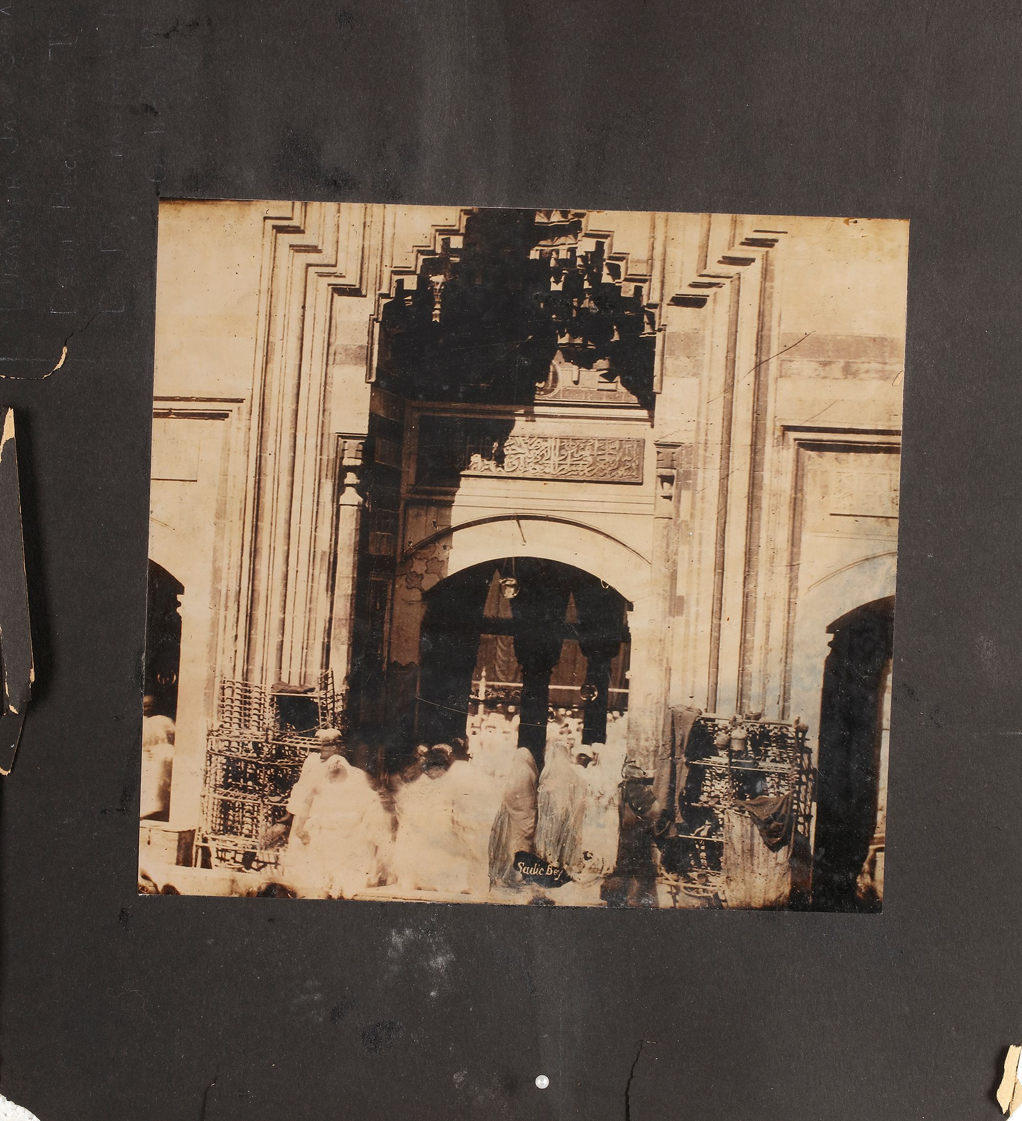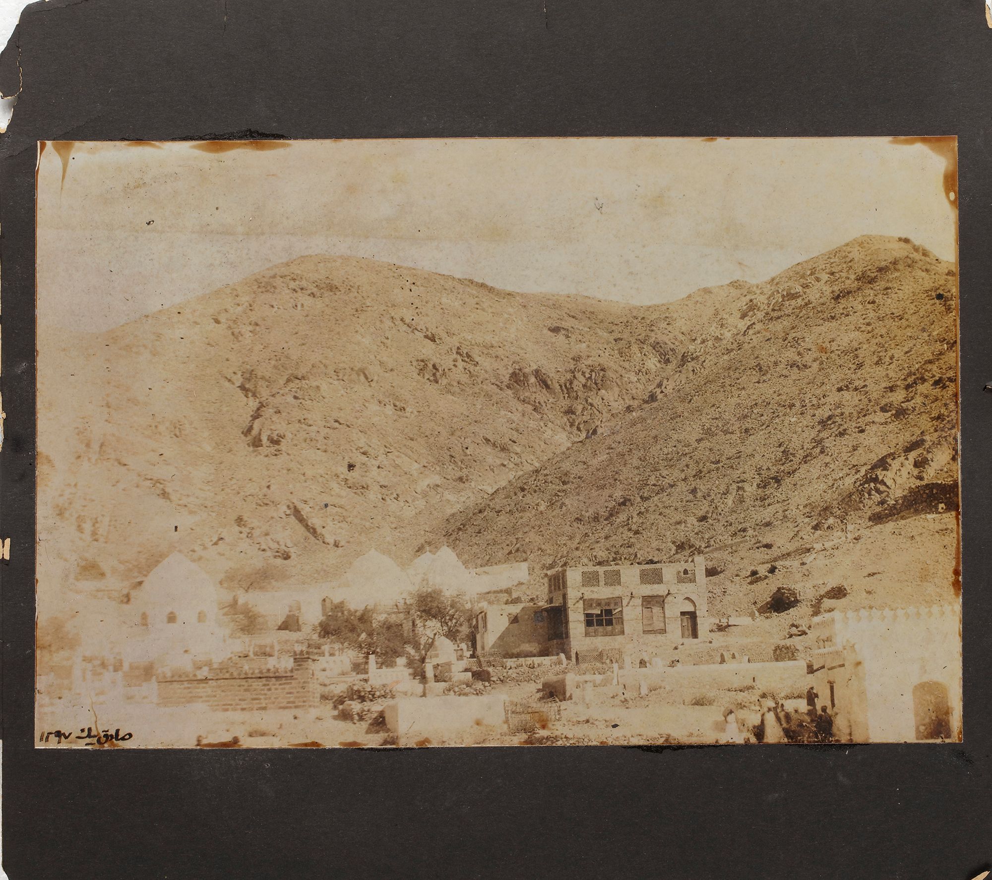The photographs comprise a view of the Kaaba at Mecca, arrival of the Mahmal, a view of the city walls, and an interior of the Masjid-Al-Haram, tents at Mina and al-Masjid al-Haram