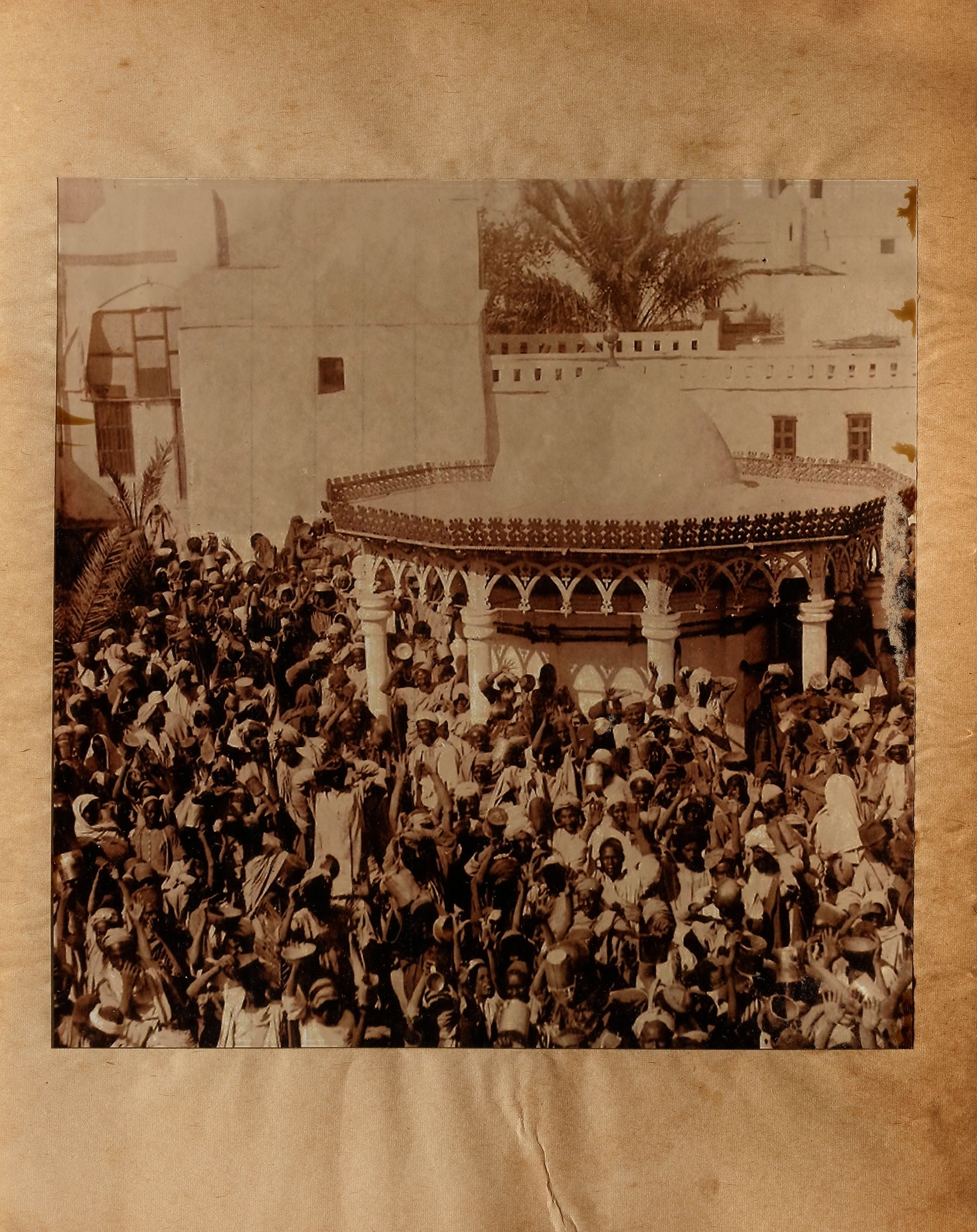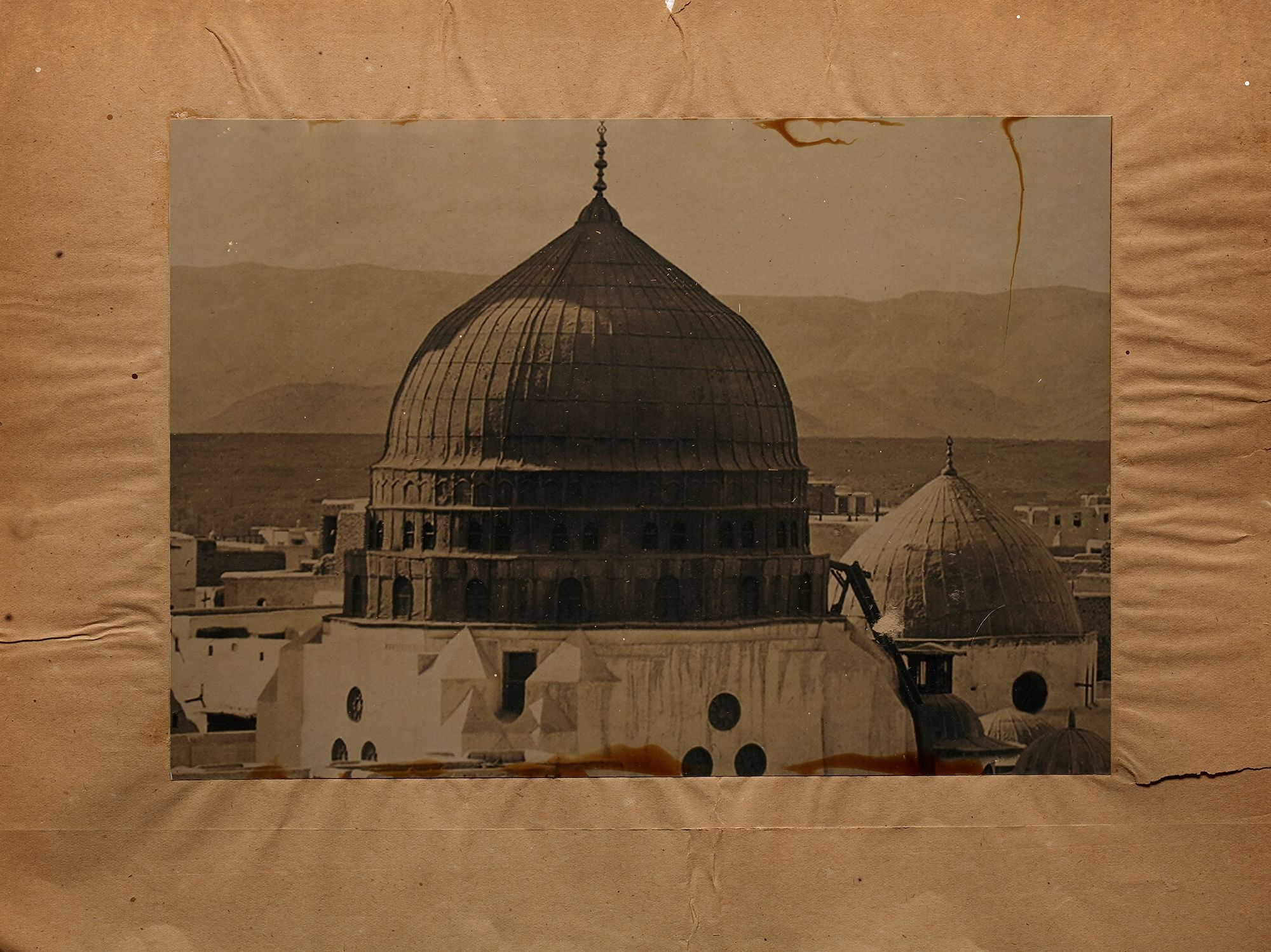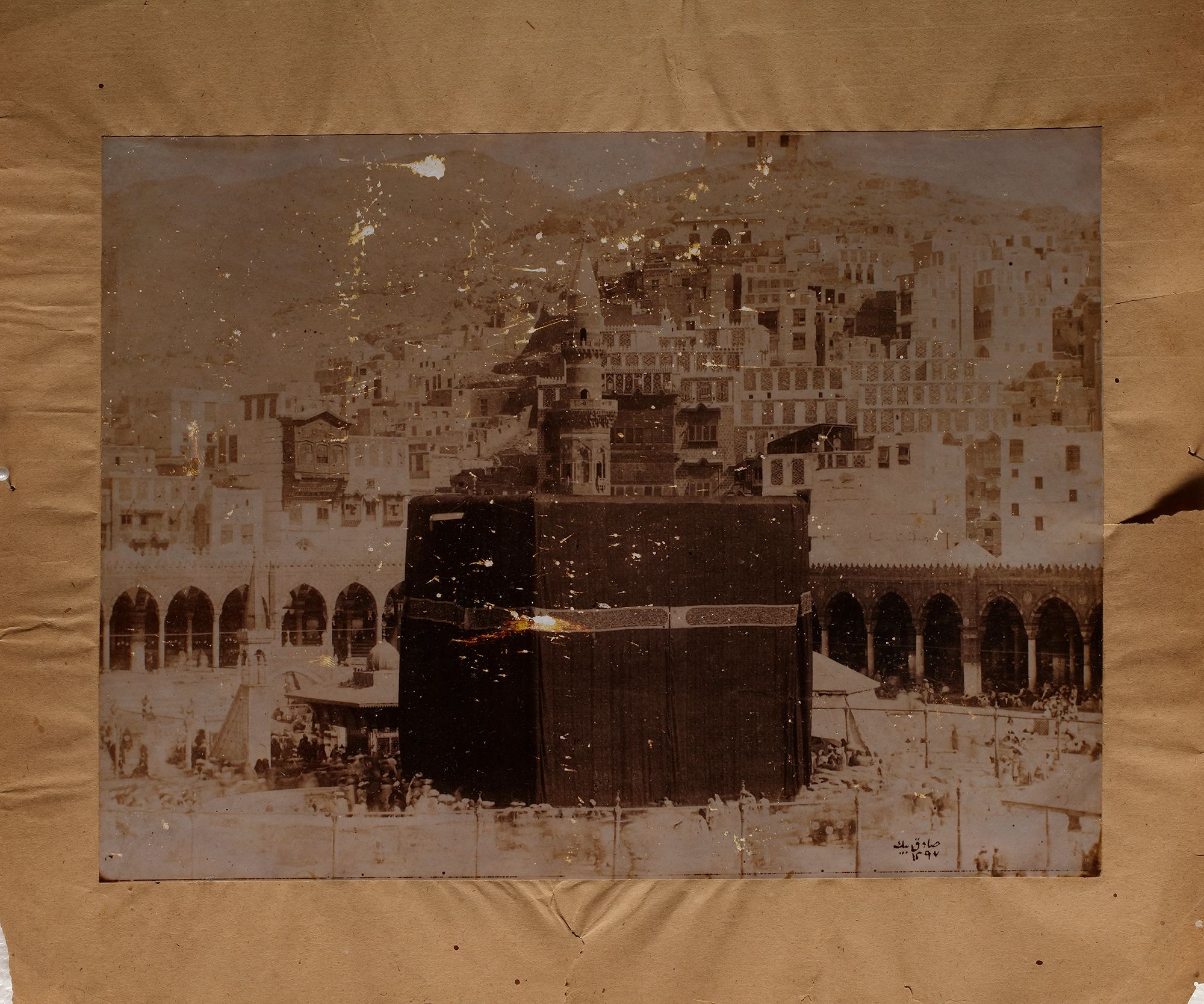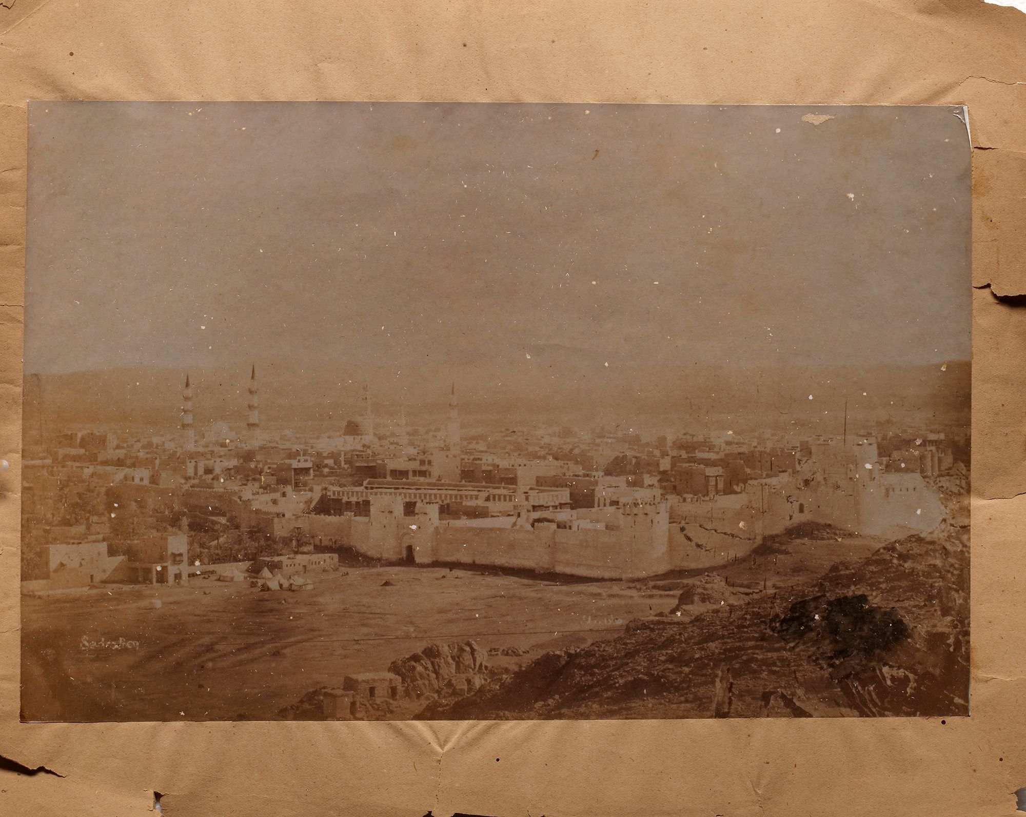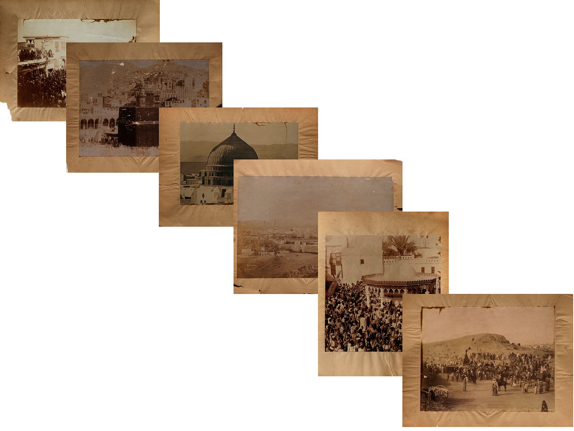 6 photographs of Mecca and Medina: a view of Medina, the arrival of Mahmal, al-Masjid al-Nabawi, and a view of al-Masjid asl-Haram. 25 by 20 cm. Muhammad Sadiq Bey (1832-1902) was the first person to take photographs of Mecca, Medina and the Hajj in 1880 and 1881. These photographs which are after Sadiq Bey's originals comprise a panorama of Mecca, a view of the Kaaba, the Prophet's mosque at Medina, a view of the city of Medina, two photographs of the Mahmal, a panorama of pilgrims' camp at Muna, and a photograph of al-Sharif Shawkat Pasha and his attendants.