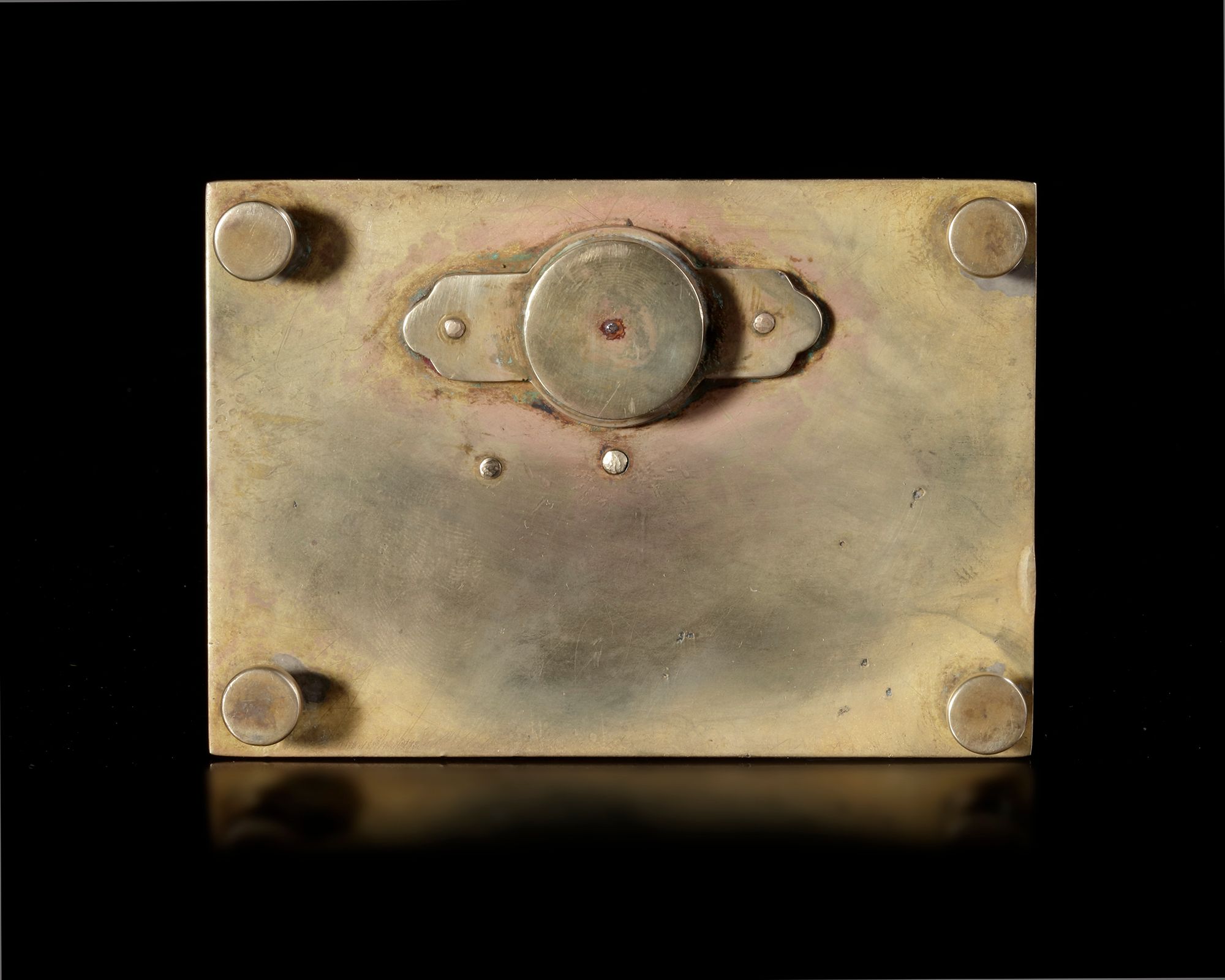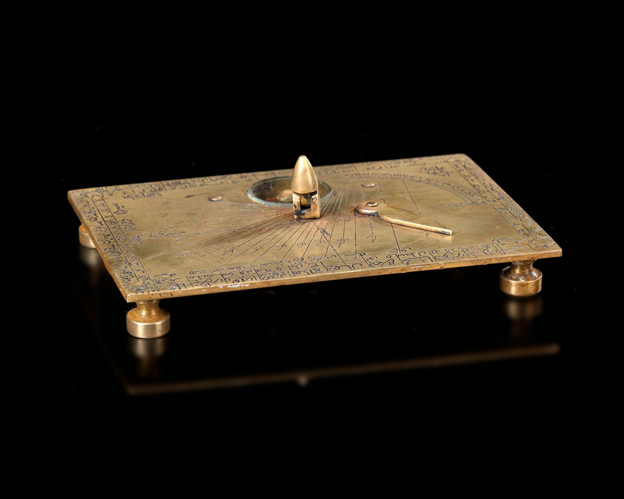 Of rectangular brass plate on four riveted feet, with inset compass-box, engraved hour lines, place names, cardinal directions, meridian line, with signature in cartouche.