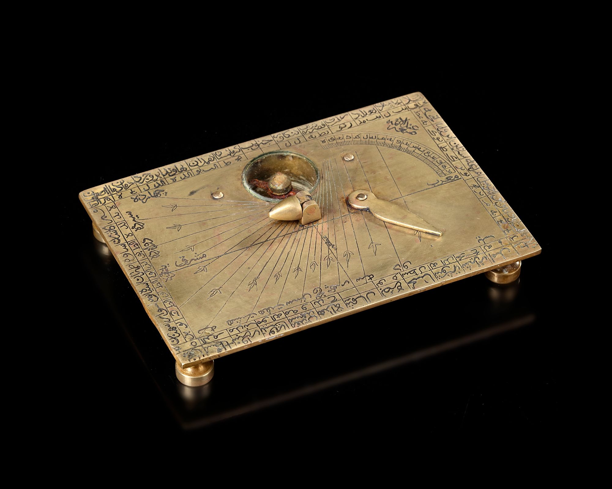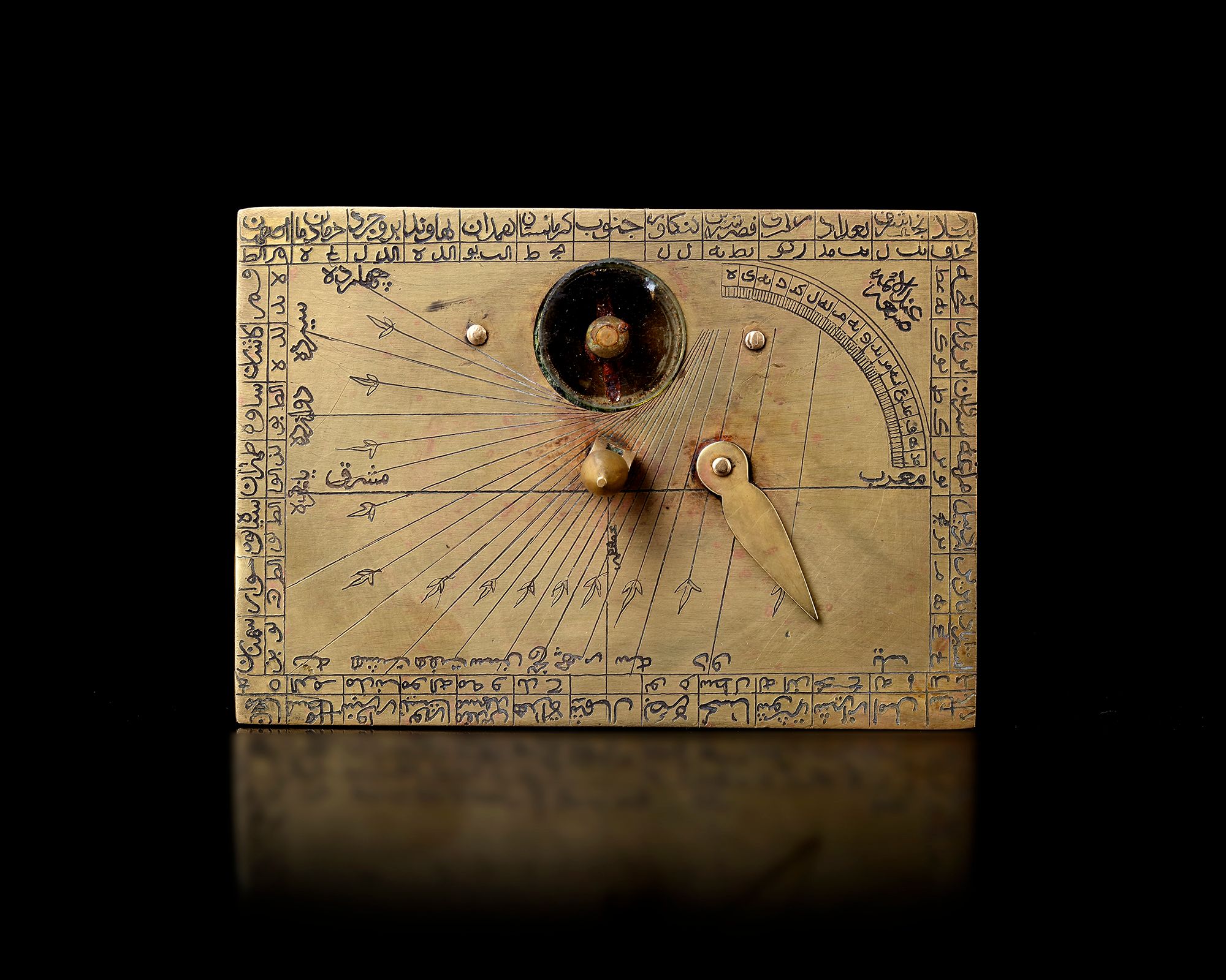 The upper face carries the hour lines for a horizontal dial counting from sunrise to sunset (Babylonian hours) numbered 1-14 in abjad numerals and with 30-minute divisions ending in trefoil leaves. Time is read from the tip of the shadow of a hinged pin-gnomon set on the meridian line beneath the compass-box. A degree arc in the top right corner is divided by 1° divisions 0-90° with every five degrees numbered in abjad. A narrow leaf-shaped pointer can be set against this scale to mark the inhirâf of a particular place, the value being derived from the table of thirty-eight named places, with their inhirâf, engraved along the edges of the instrument. The four cardinal directions are named, as is the meridian line. The compass retains its original needle in the form of a bird, characteristic of late Safavid and succeeding Persian instruments.