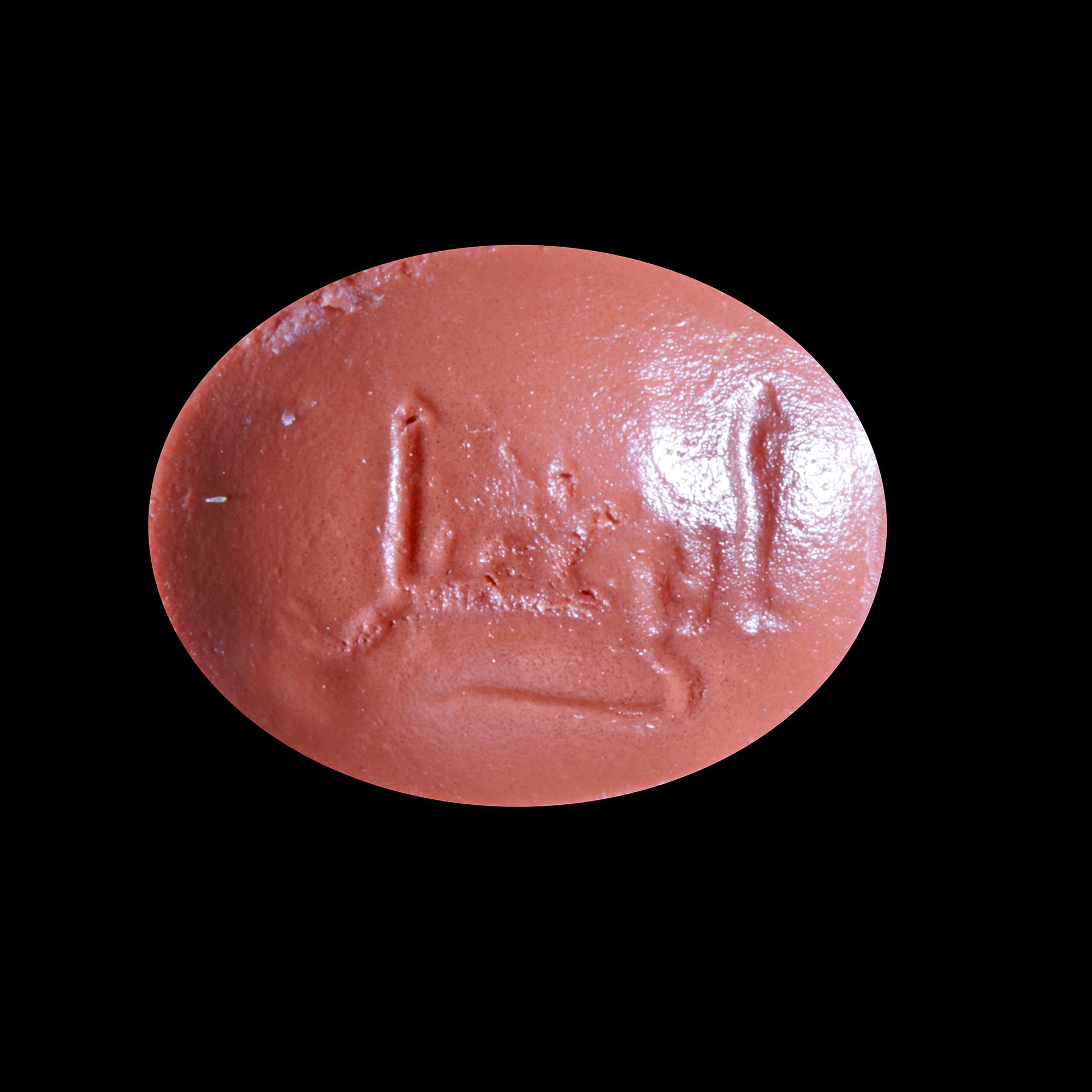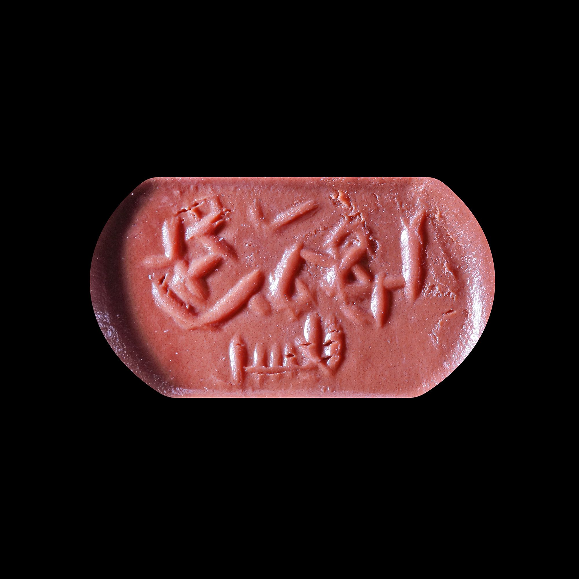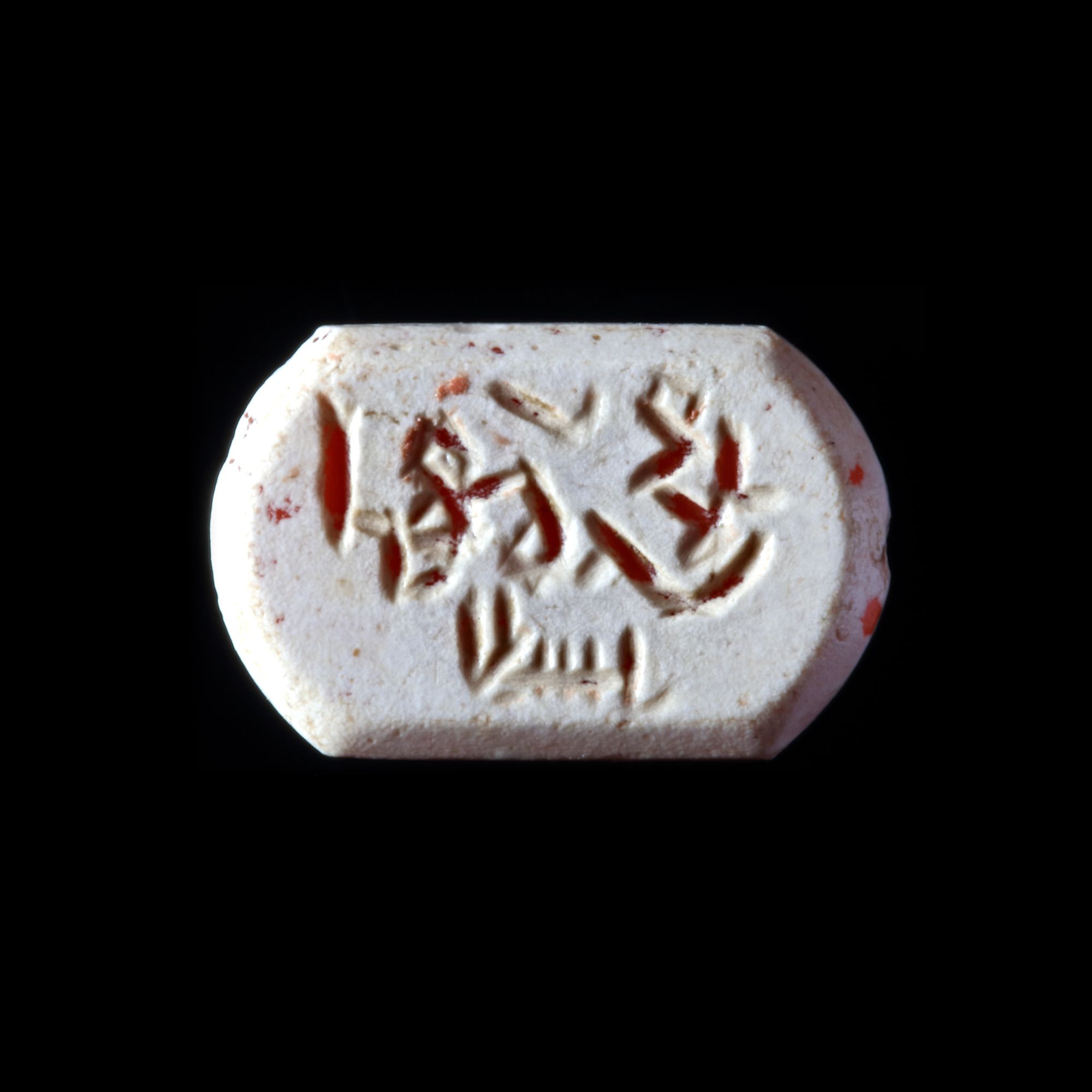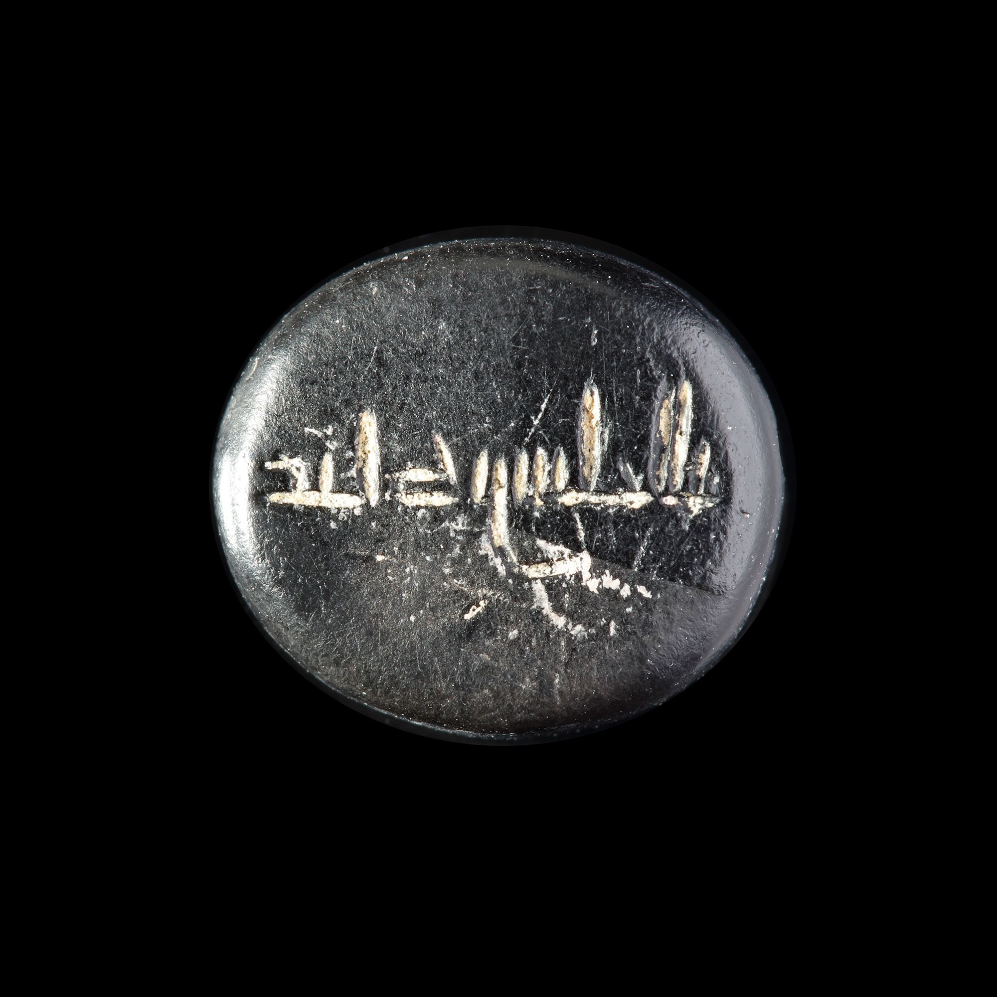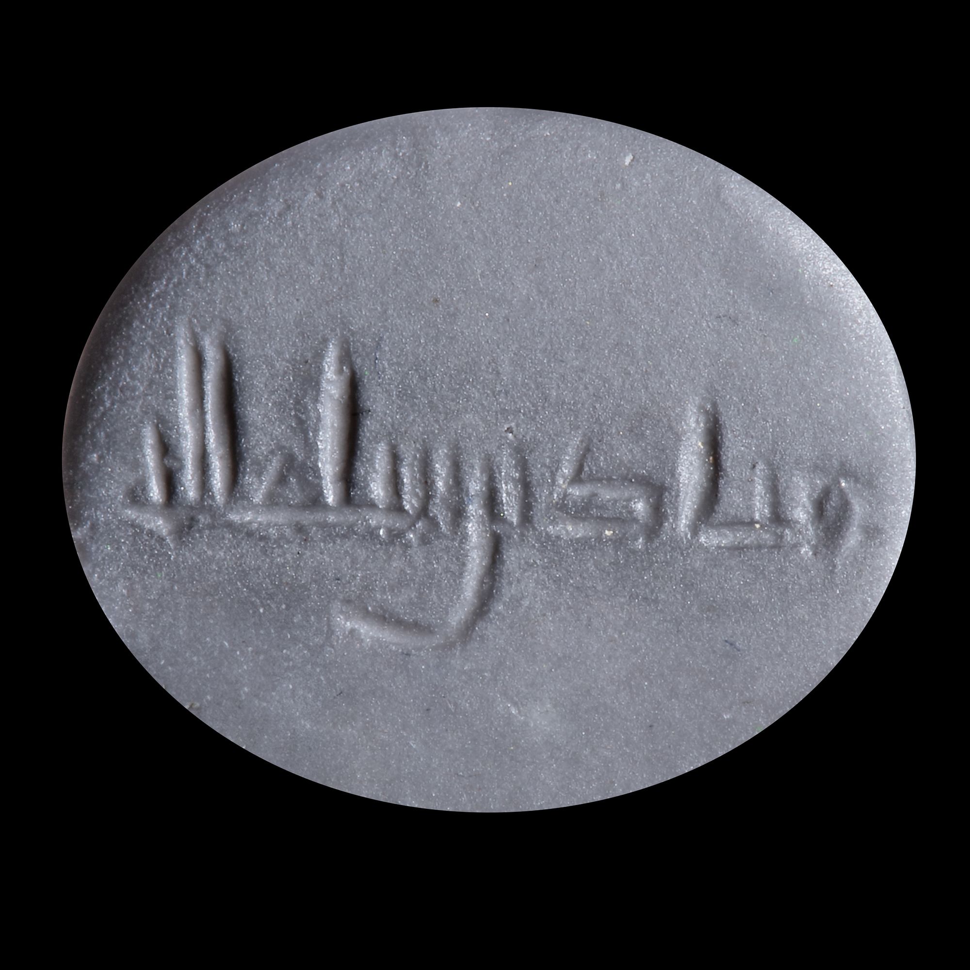 A seal with rounded ends, engraved with the text " ابراهيم بن محمد الحسن, Ibrahim bin Muhammed al-Hasn " in Kufic script. 2th/4th AH-8th/10th AD century, excellent condition, 6 mm. by 11 mm.