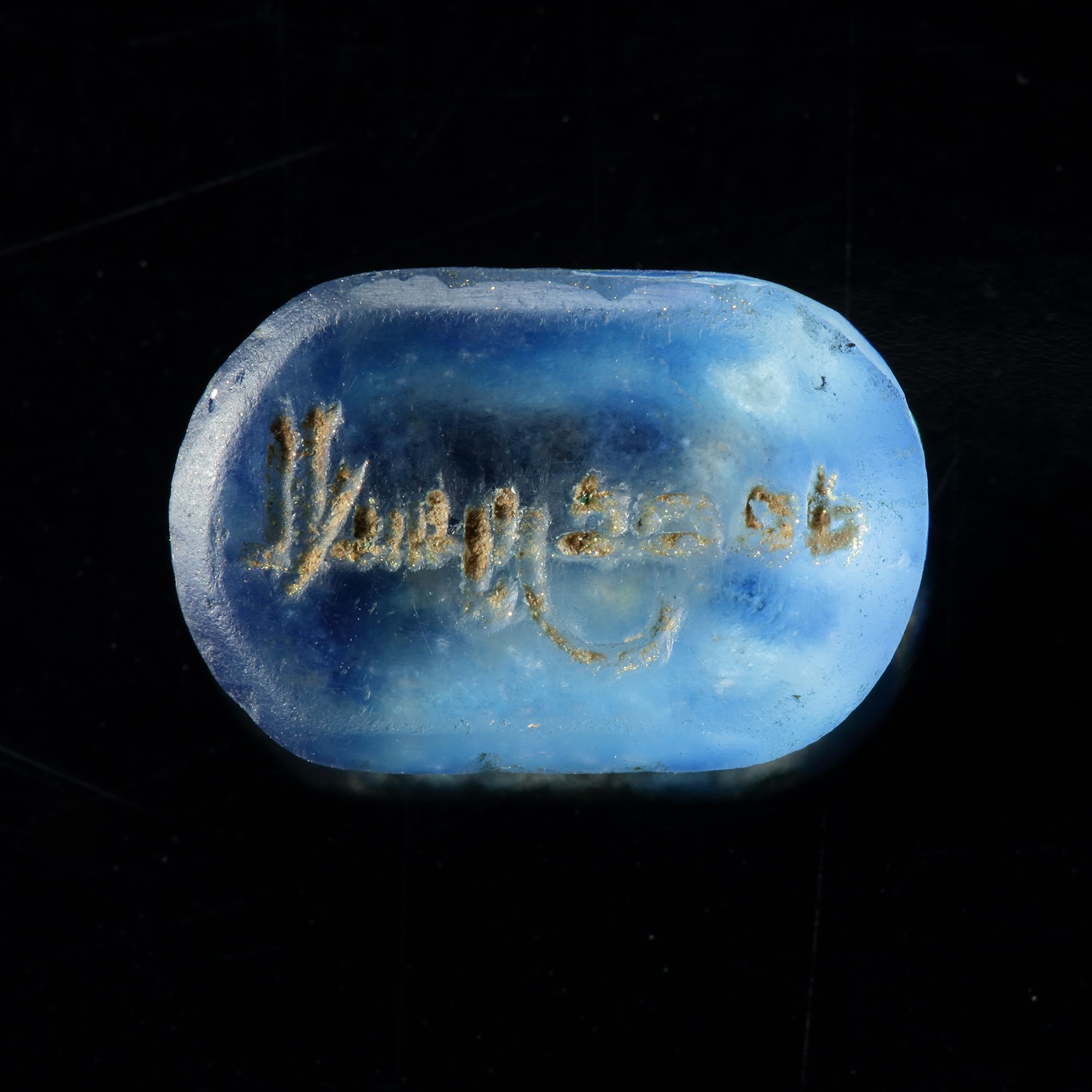 A turquoise stone seal with rounded ends, engraved with the text "الحسن بن عدروه, al-Hasan bin ador'h" in Kufic script. 2th/4th AH-8th/10th AD century, excellent condition, 8 mm. by 12 mm.