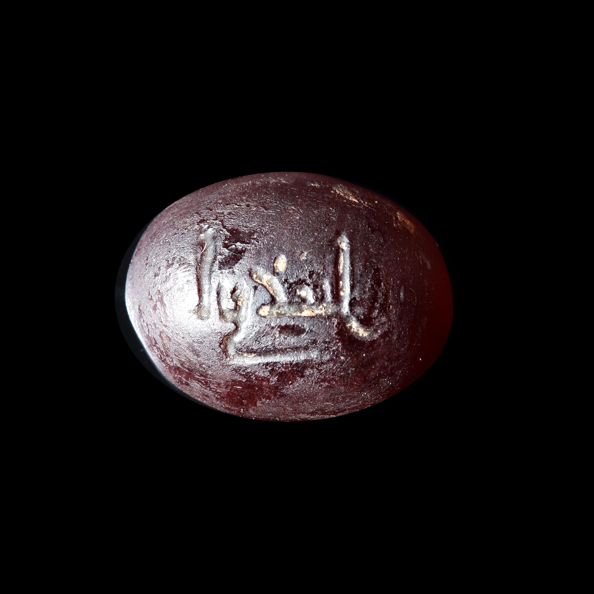 An agate seal with oval shape, engraved with the text " أبي عقيل, father of Akil" in Kufic script.