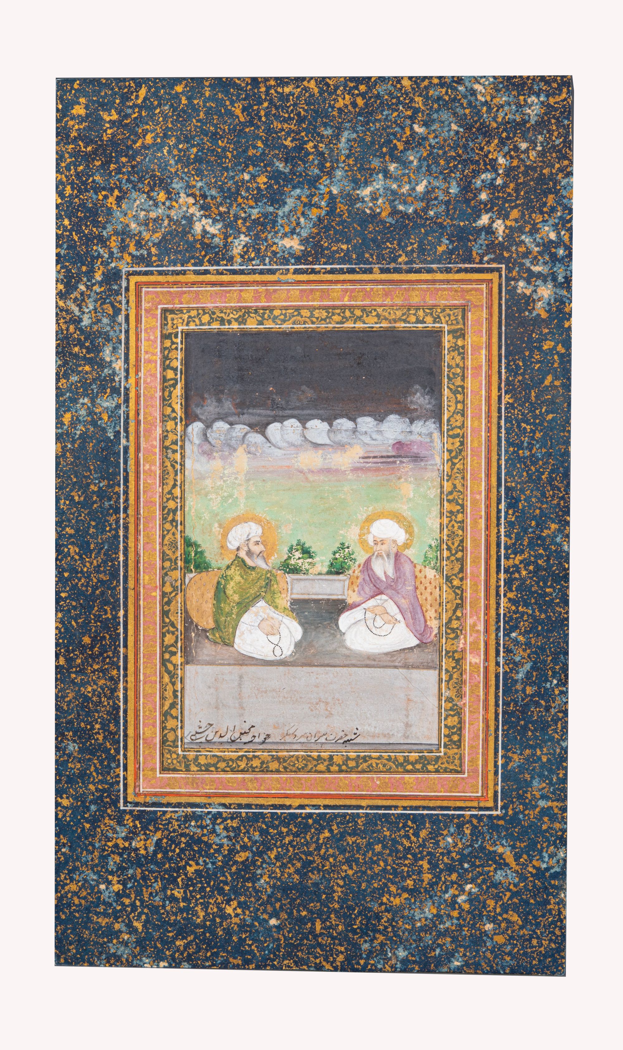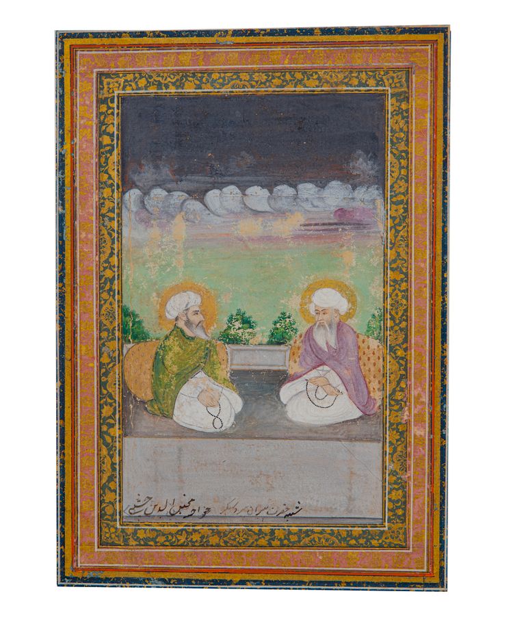 Opaque pigments heightened with gold on paper, the composition depicting two seated Imams, Jilani and Chishti in a fenced garden, both characterized by flaming haloes, green being the colour of Islam and the golden circle surrounding the halo a clear reference to solar symbolism, the books in front of them and the rosaries in their hands clear indications of their pious and educated nature, the scene set within golden and polychrome rules and burgundy red borders with golden floral trellis 11 by 18 cm.