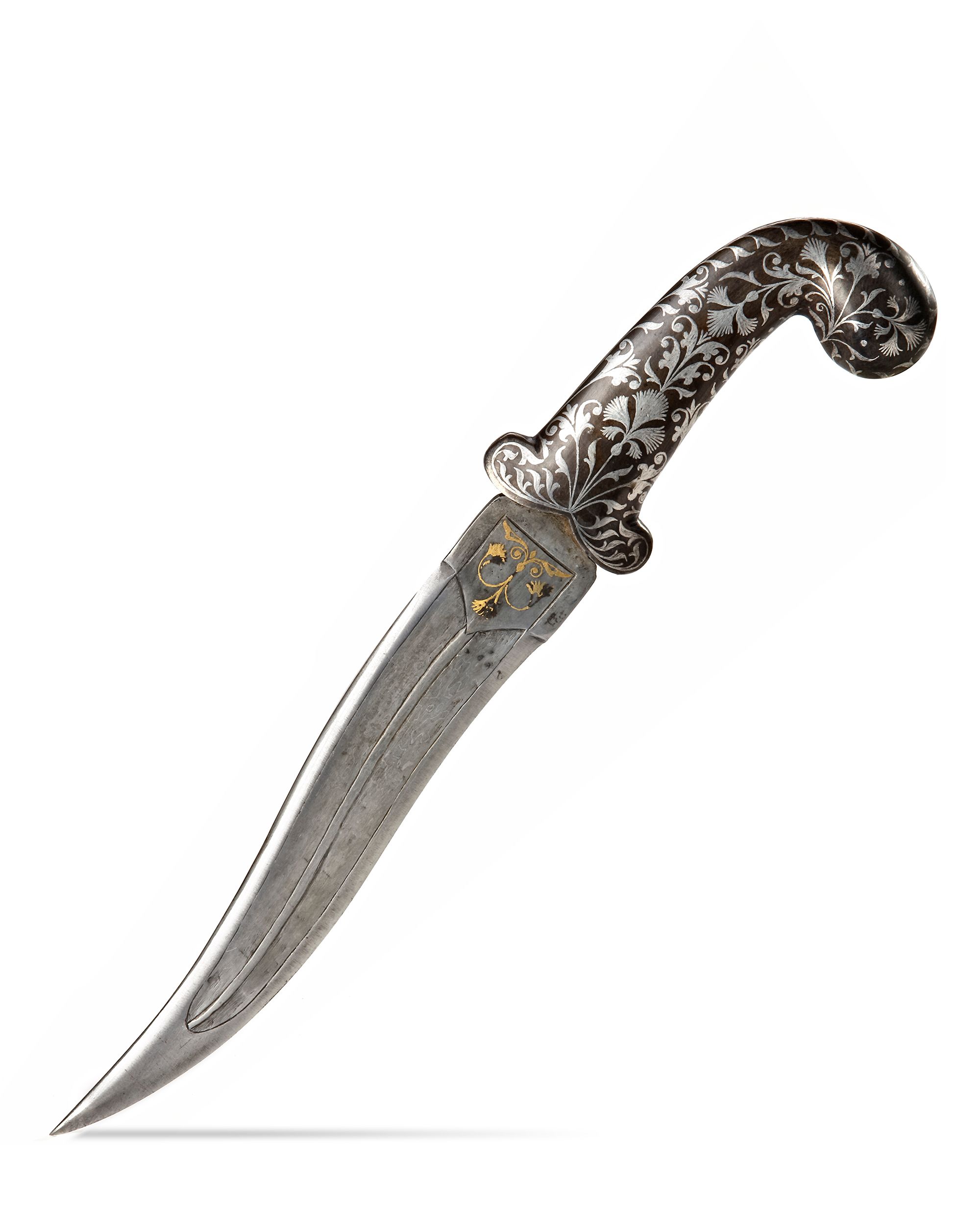 A dagger hilt, the curved lobed section stylized with inlaid lotus floral leafy sprays.