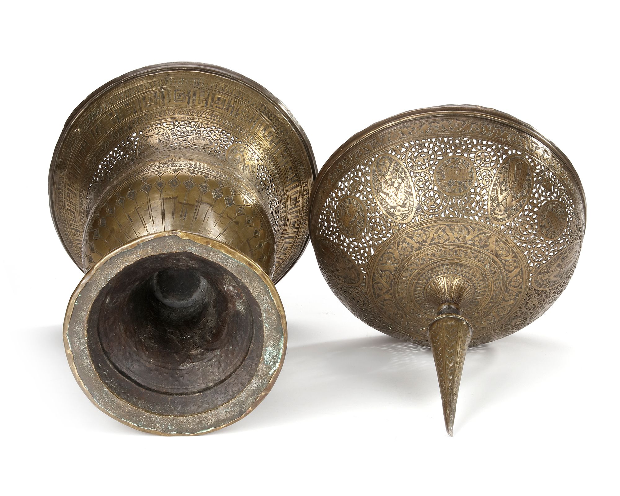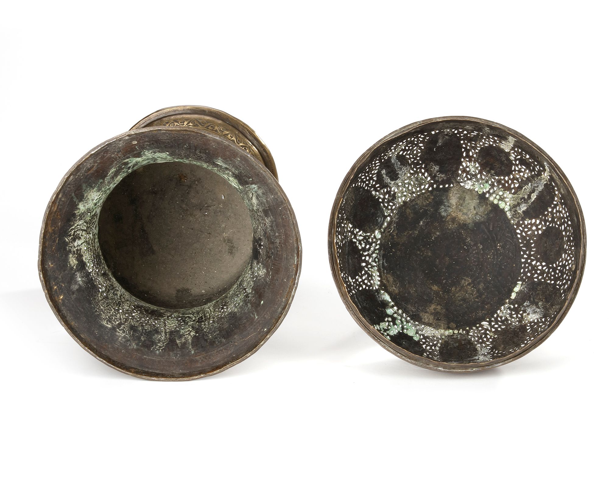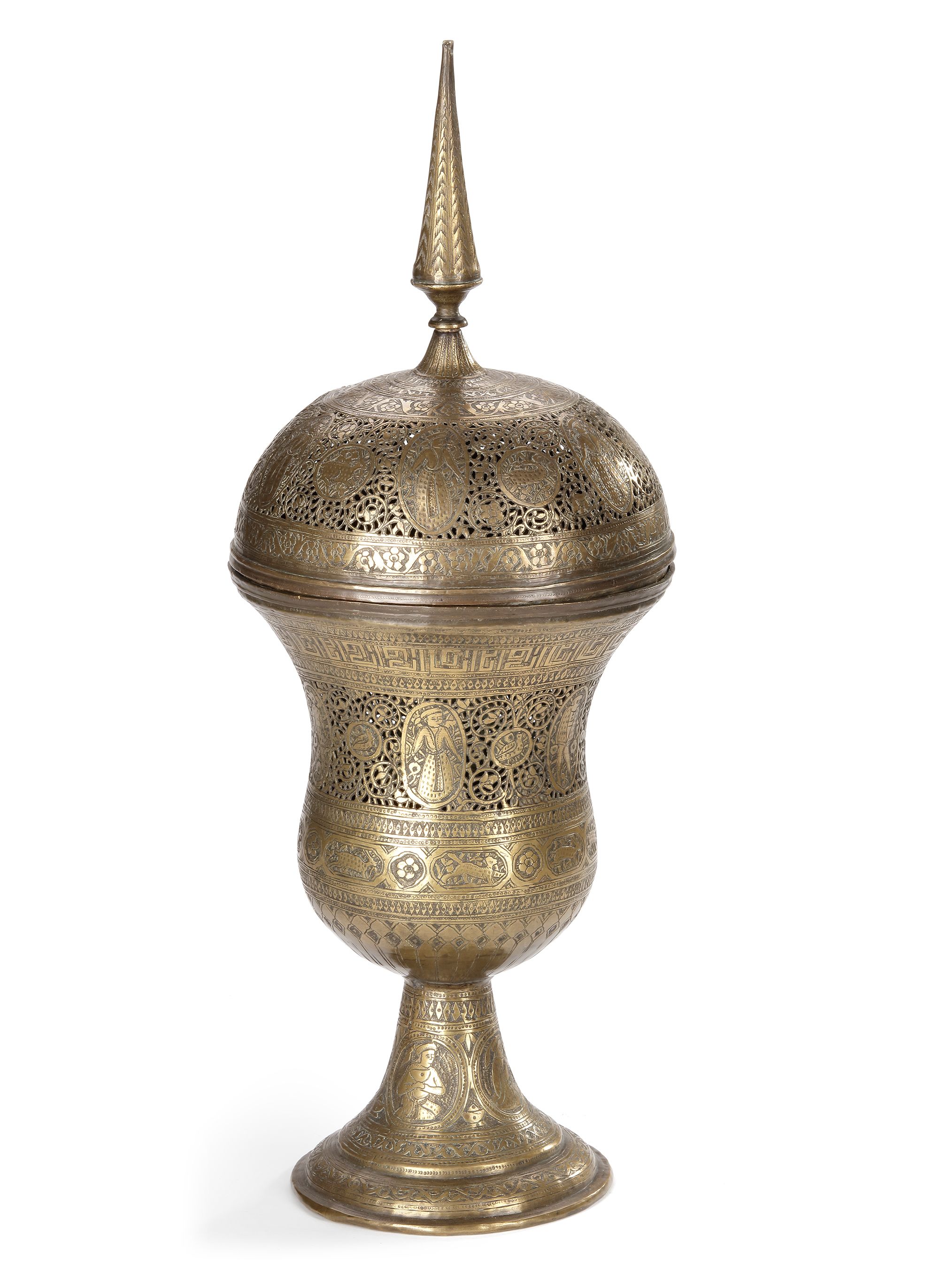 Of bell shape with pierced hinged cover, supported on a trumpet base with v narrow delicate stem, engraved with a very fine design of scrolling vine around paired cypress trees alternating with roundels containing figures and mythical animals. The cover is similarly decorated with a finial.