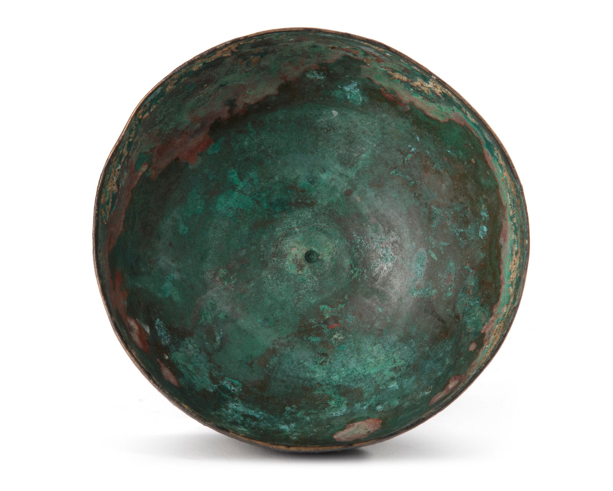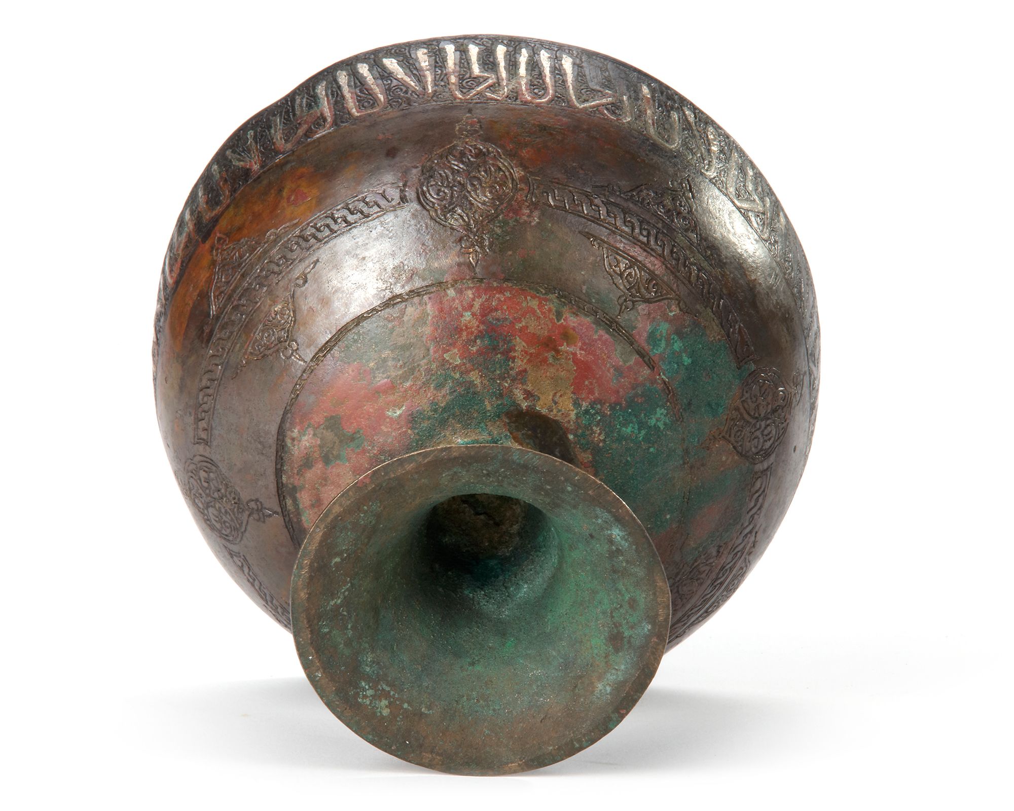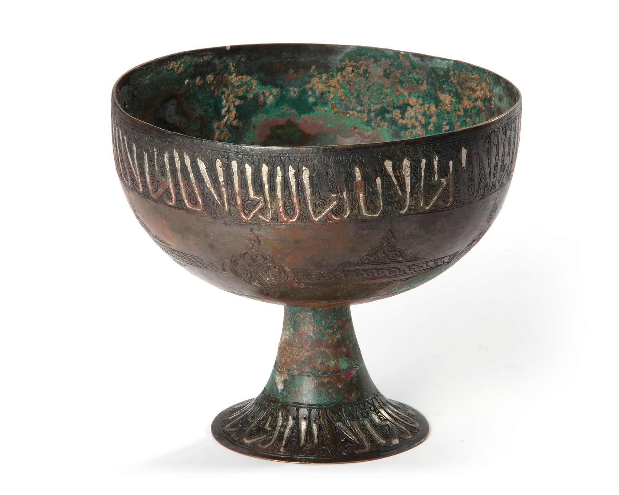 A Khorassan bronze bowl standing on a flared foot adorned with a band of animated naskh inscriptions on a dense scroll ground, the rounded body with alternating medallions and palmettes, the rim with a band of animated kufic script against a dense scrolling ground, most silver remaining.