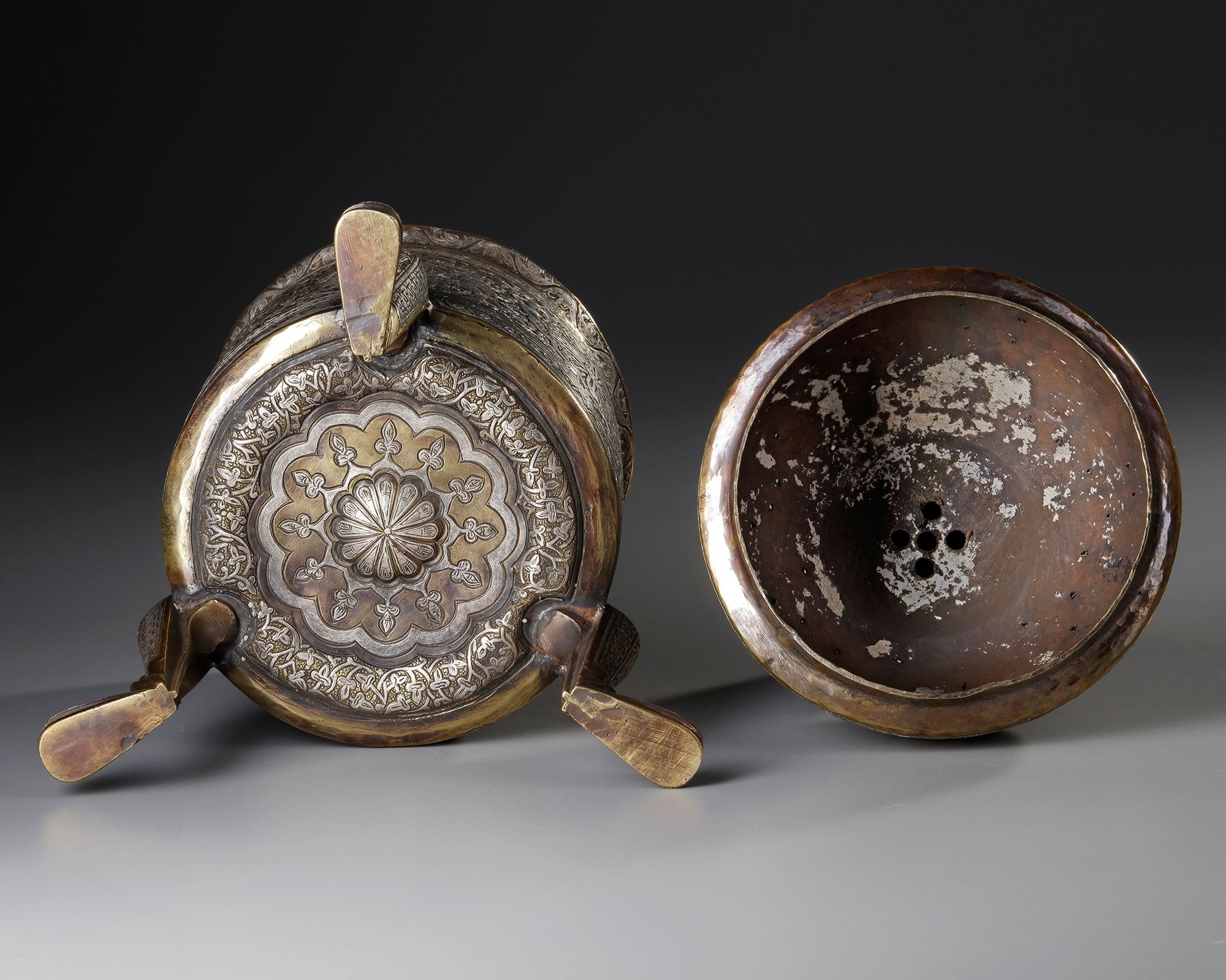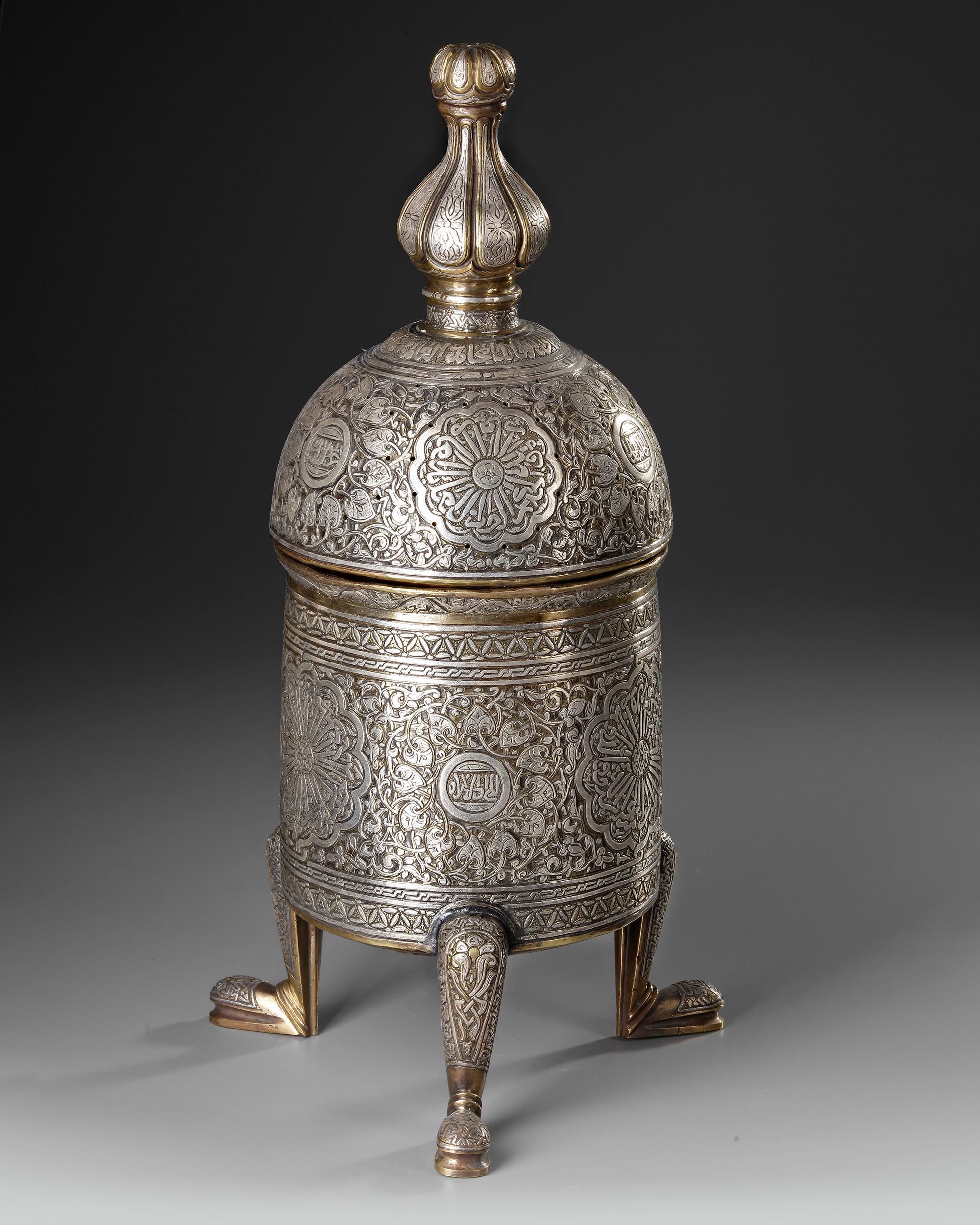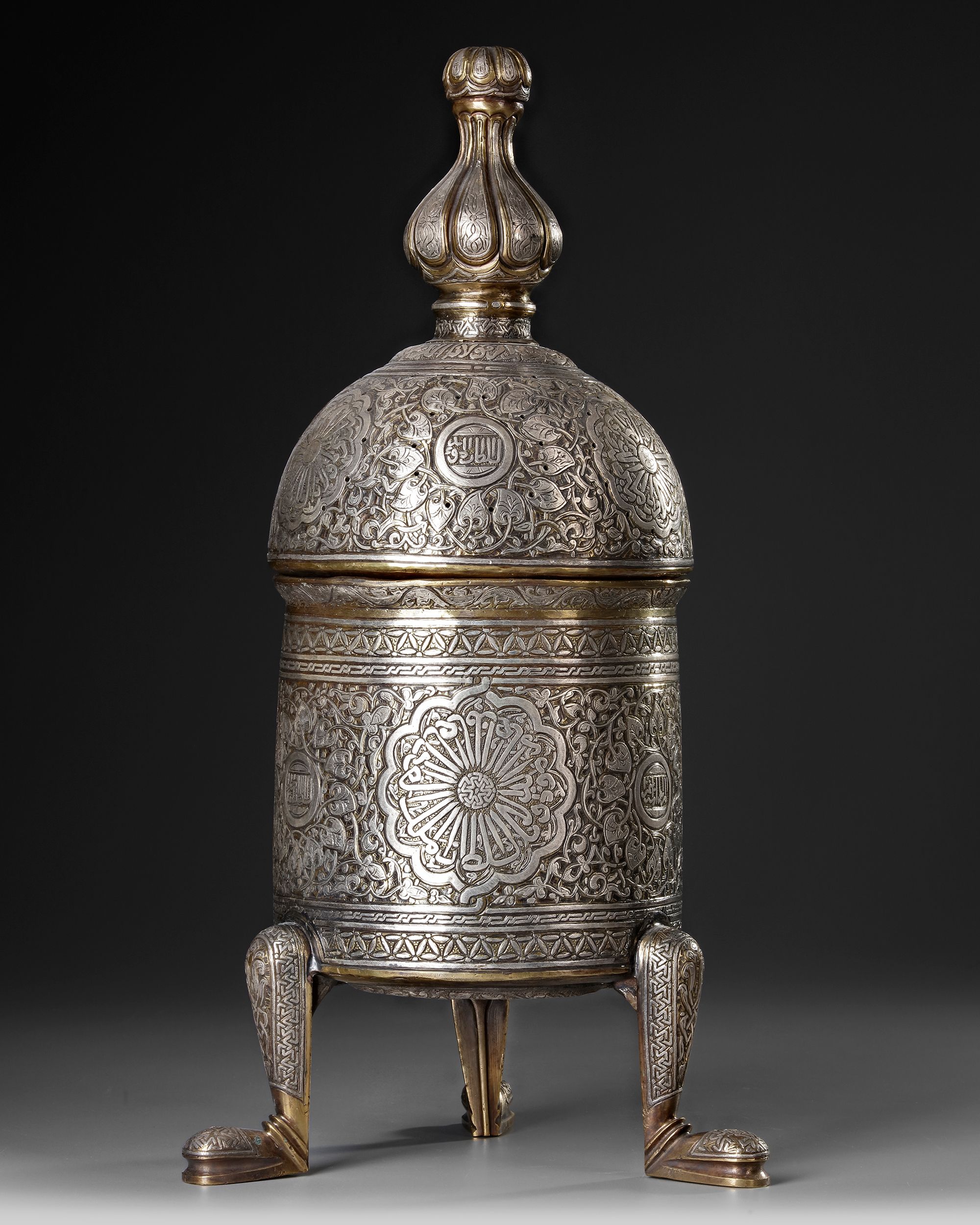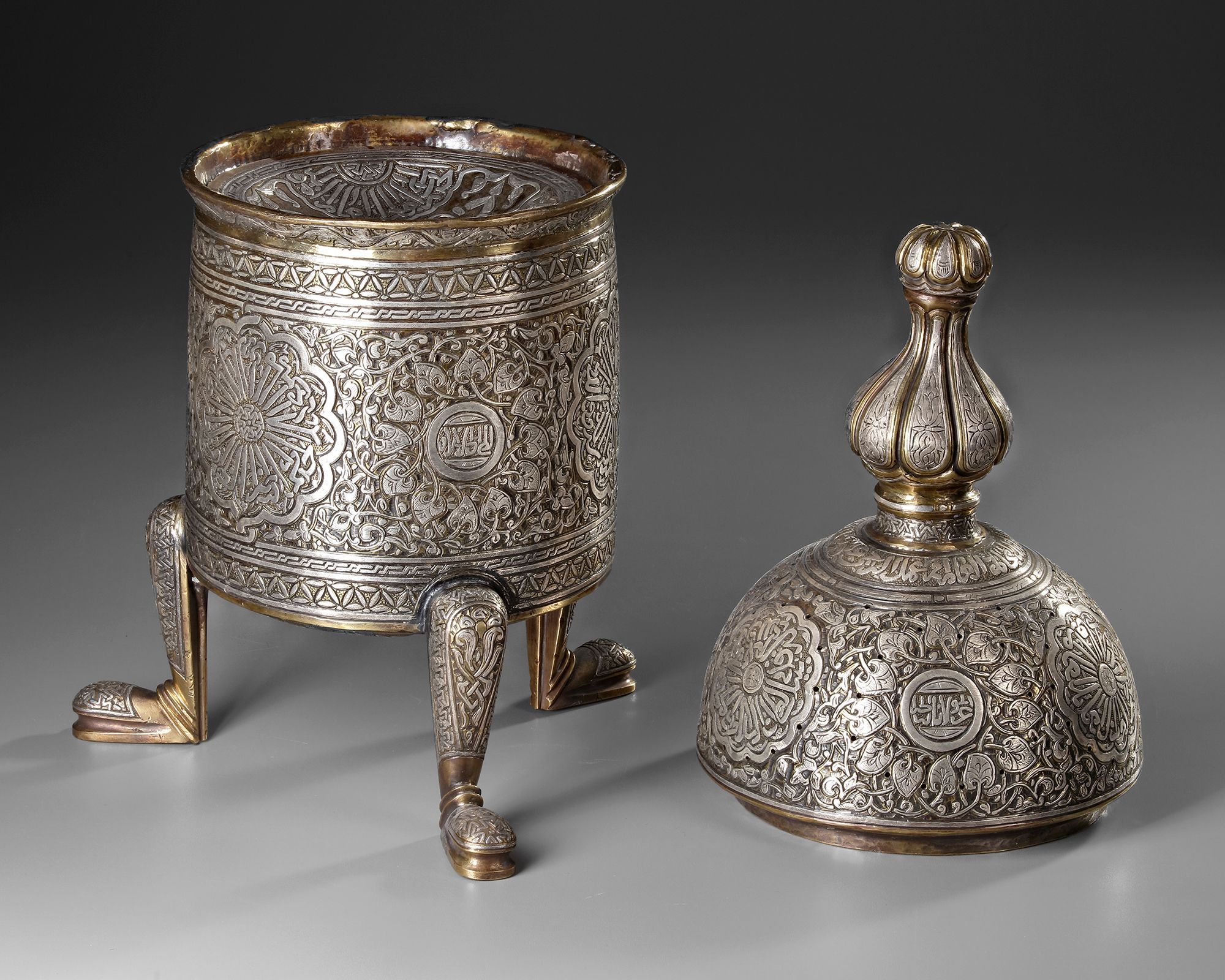 An incense burner of a wide tubular body richly decorated with silver inlays, resting on three feet with stylized floral and vegetal motifs. The pierced domed lid with a knob shaped as a flower bud is engraved with interlocking patterns and calligraphic cartouches. Inside there is an open-work holder with a central star motif to place the incense on.