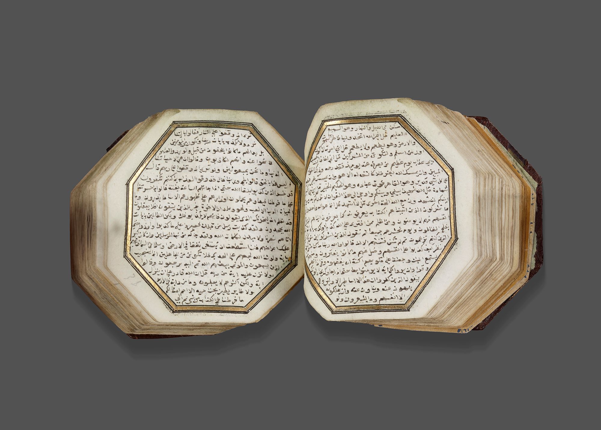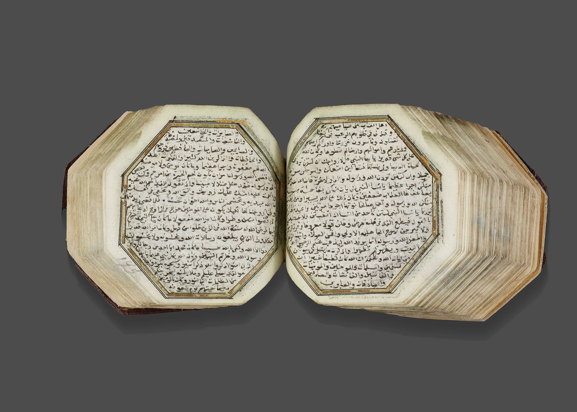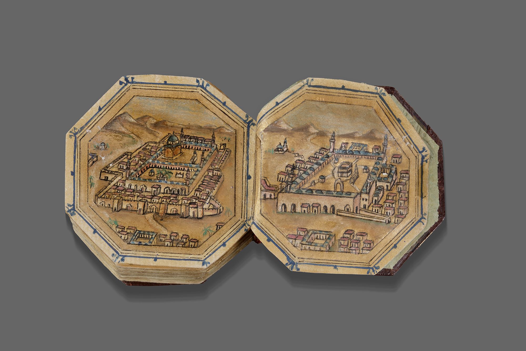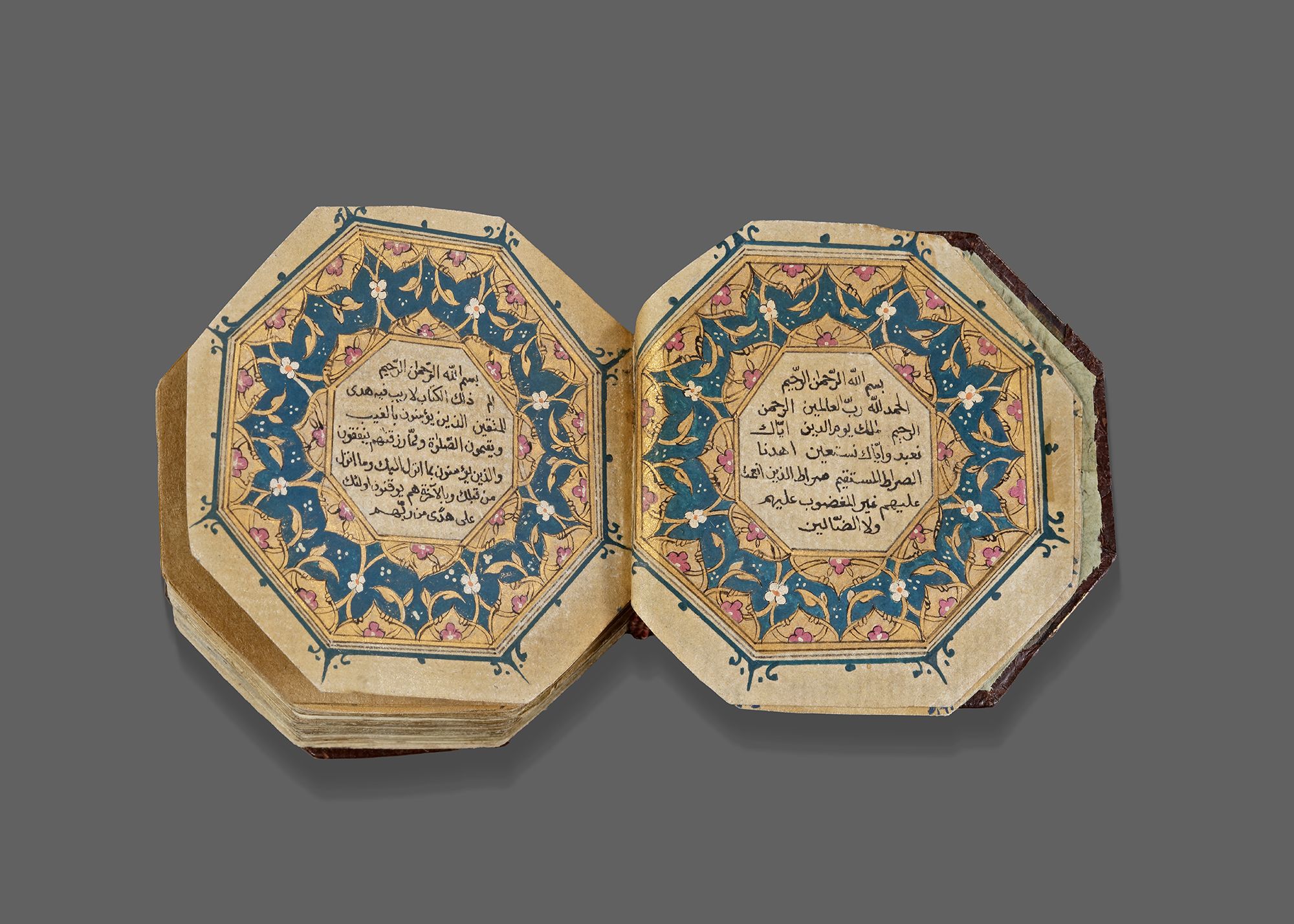 A complete Quran, Arabic manuscript on paper, 217 leaves with 3 fly-leaves, 19 lines to the page written in minute naskhi script in black ink with a black and gilt border, one illuminated double-page frontispiece in colors and gold containing two miniature of Al-Masjid al-Haram and Al-Masjid Al-Nabawi , a second double-page with striking blue and gilt decoration framing 7 lines, surah headings in red, some water-staining mostly restricted to outer margins, dark brown binding with covers painted with floral sprays in gold, leather outer case.