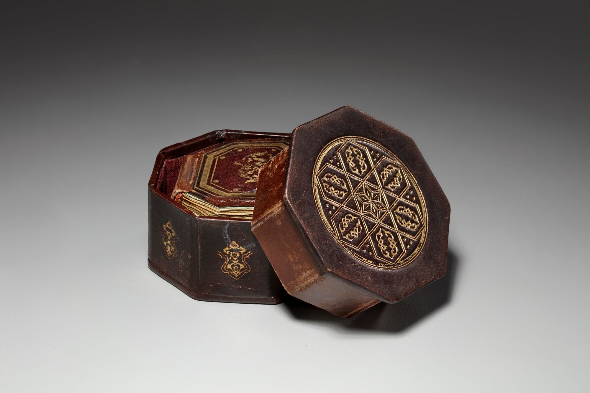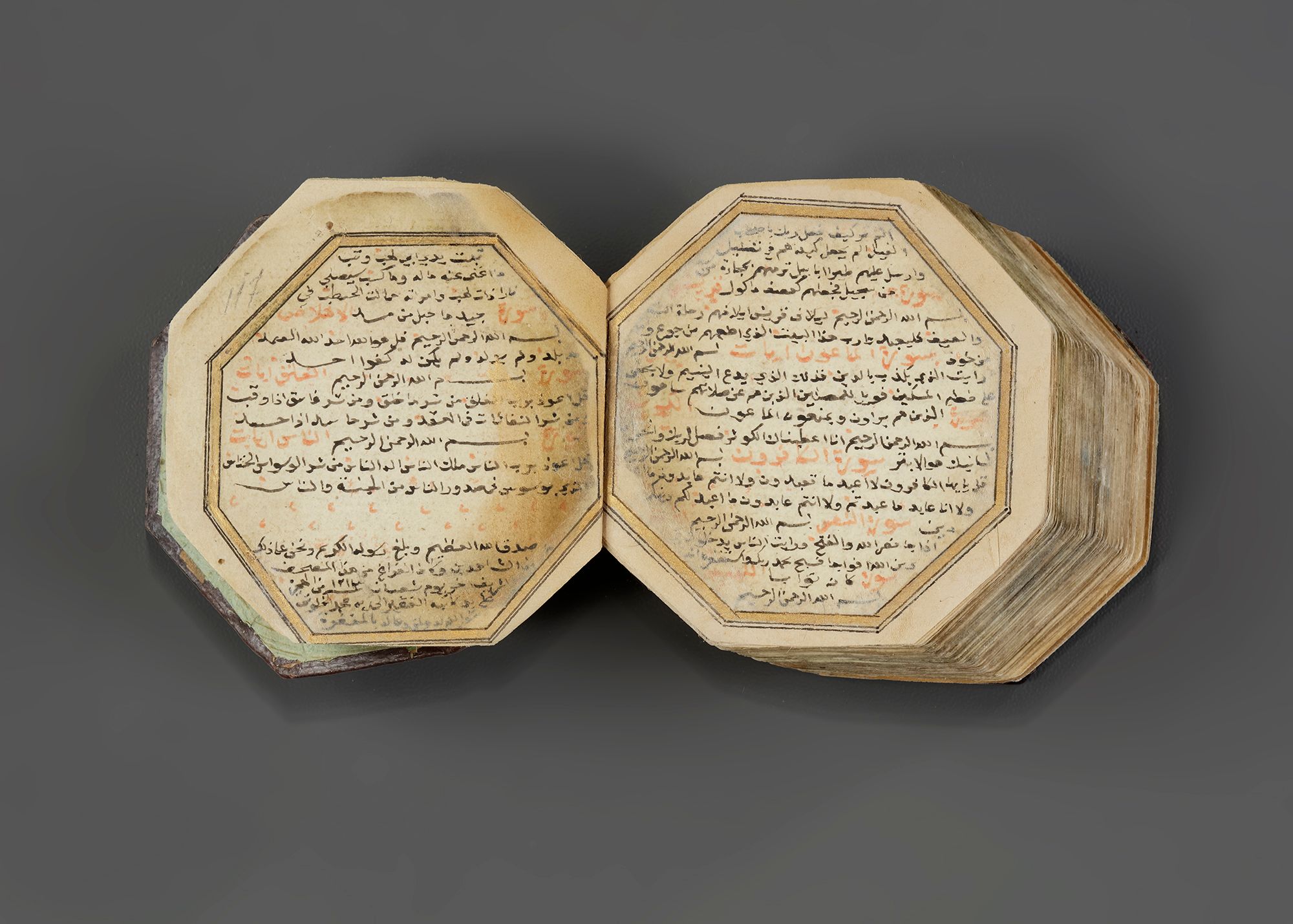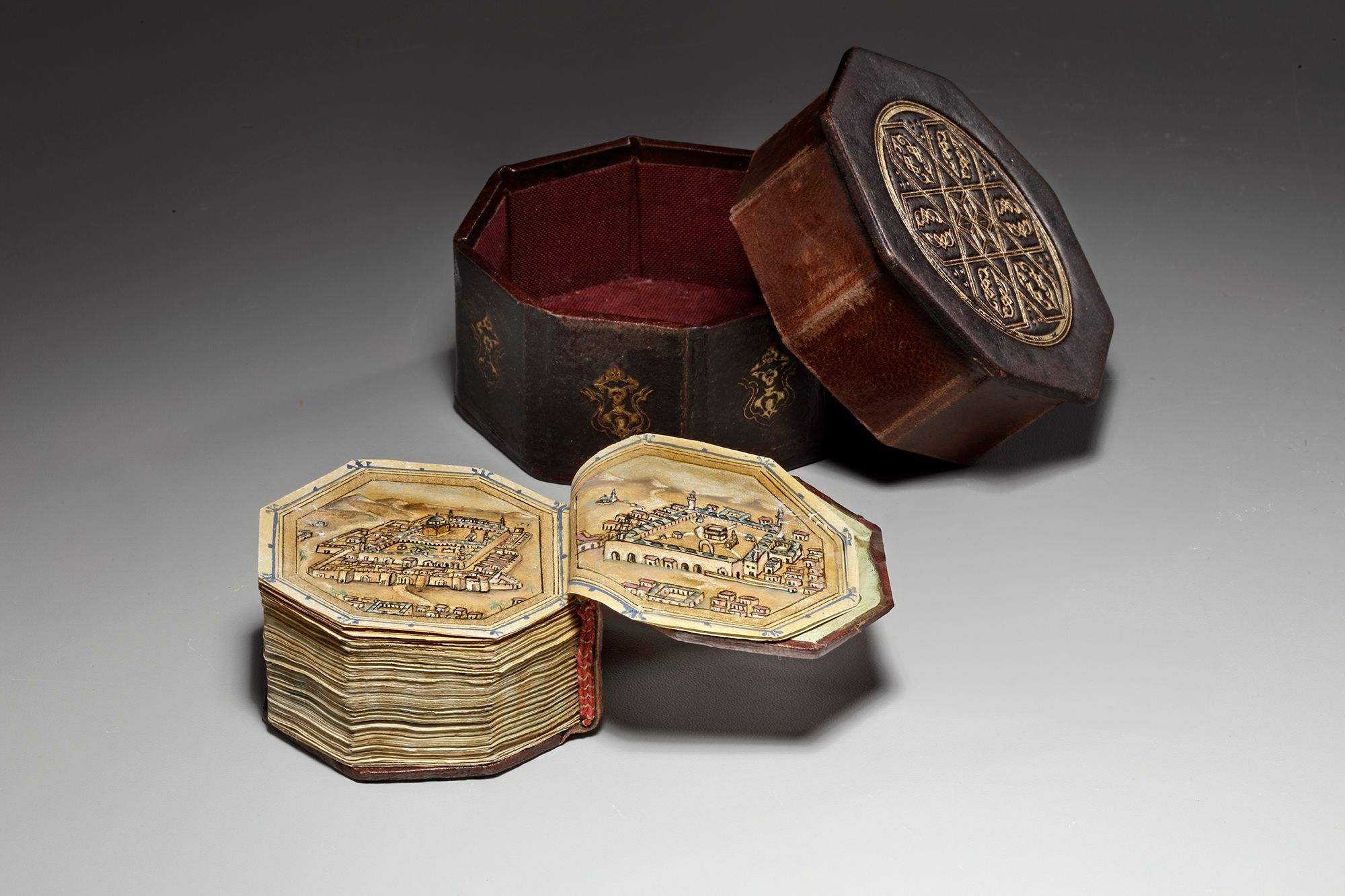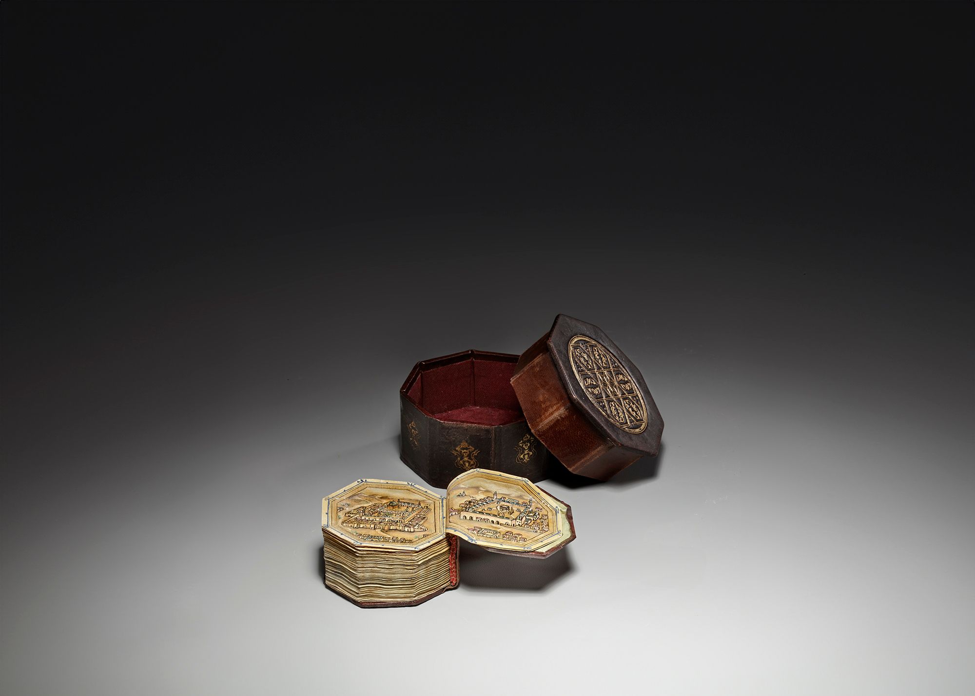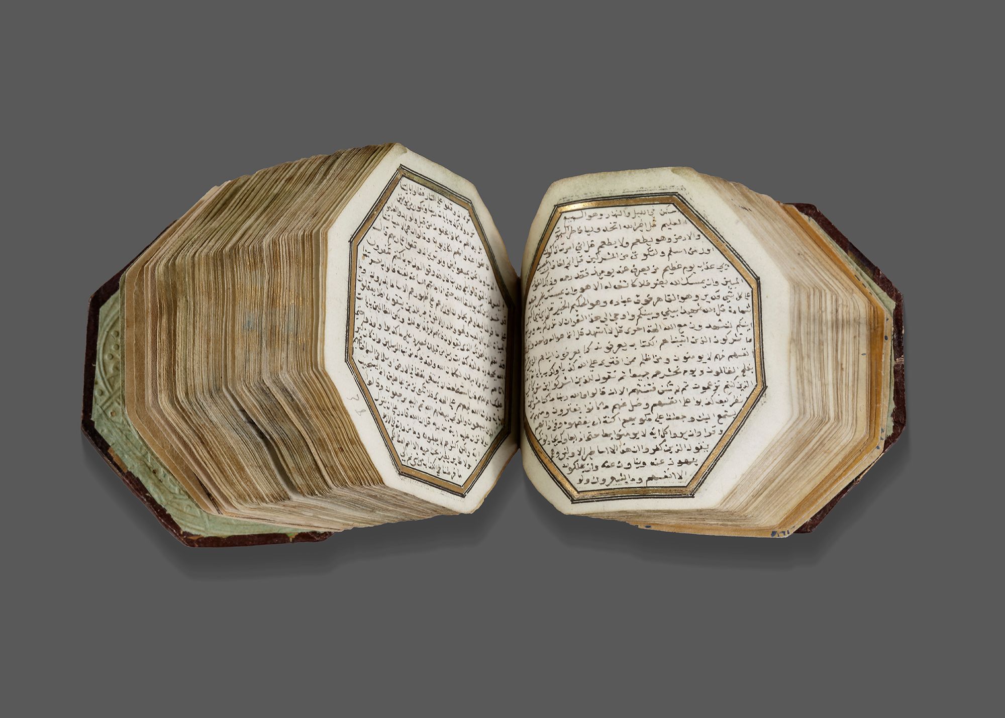 A complete Quran, Arabic manuscript on paper, 217 leaves with 3 fly-leaves, 19 lines to the page written in minute naskhi script in black ink with a black and gilt border, one illuminated double-page frontispiece in colors and gold containing two miniature of Al-Masjid al-Haram and Al-Masjid Al-Nabawi , a second double-page with striking blue and gilt decoration framing 7 lines, surah headings in red, some water-staining mostly restricted to outer margins, dark brown binding with covers painted with floral sprays in gold, leather outer case.