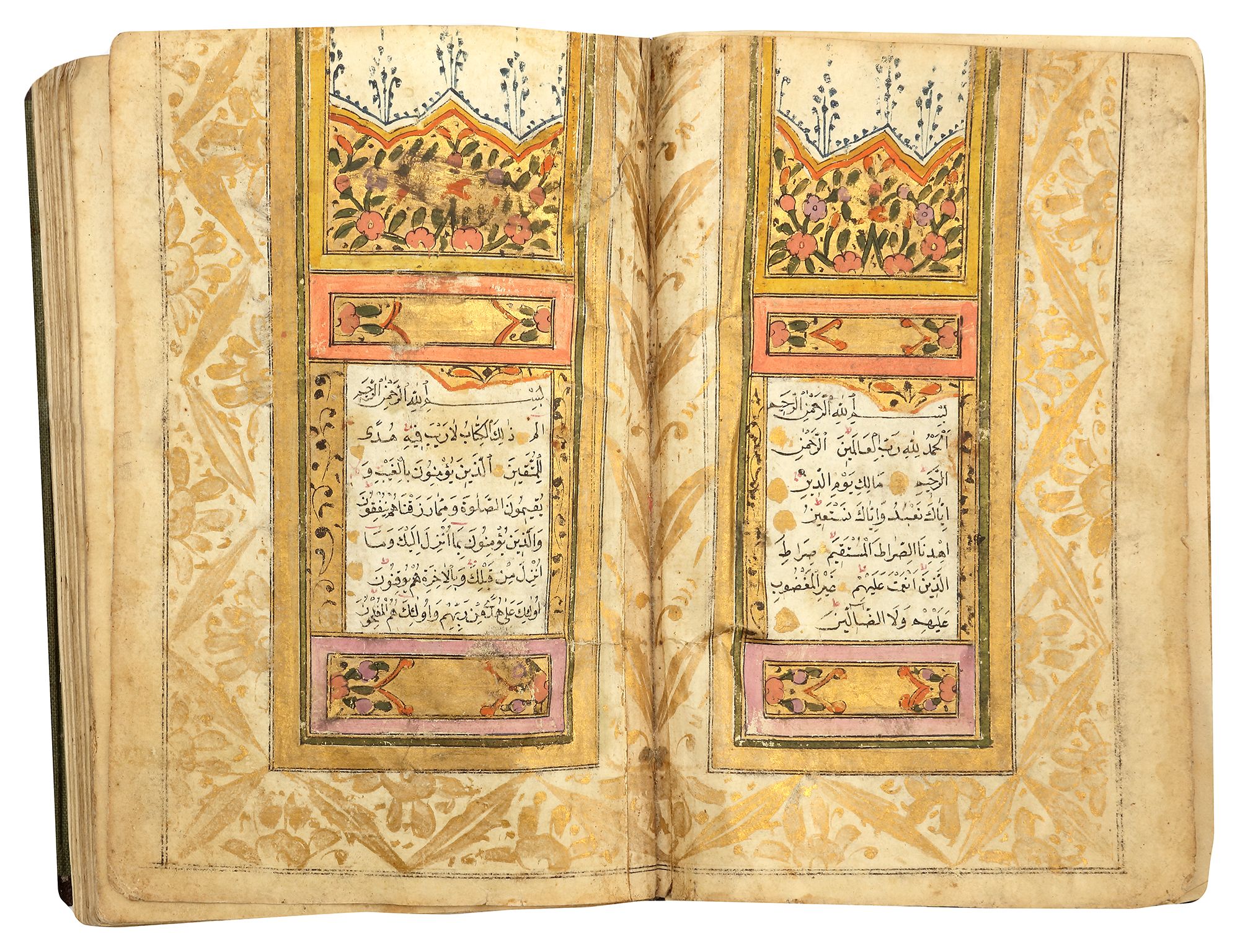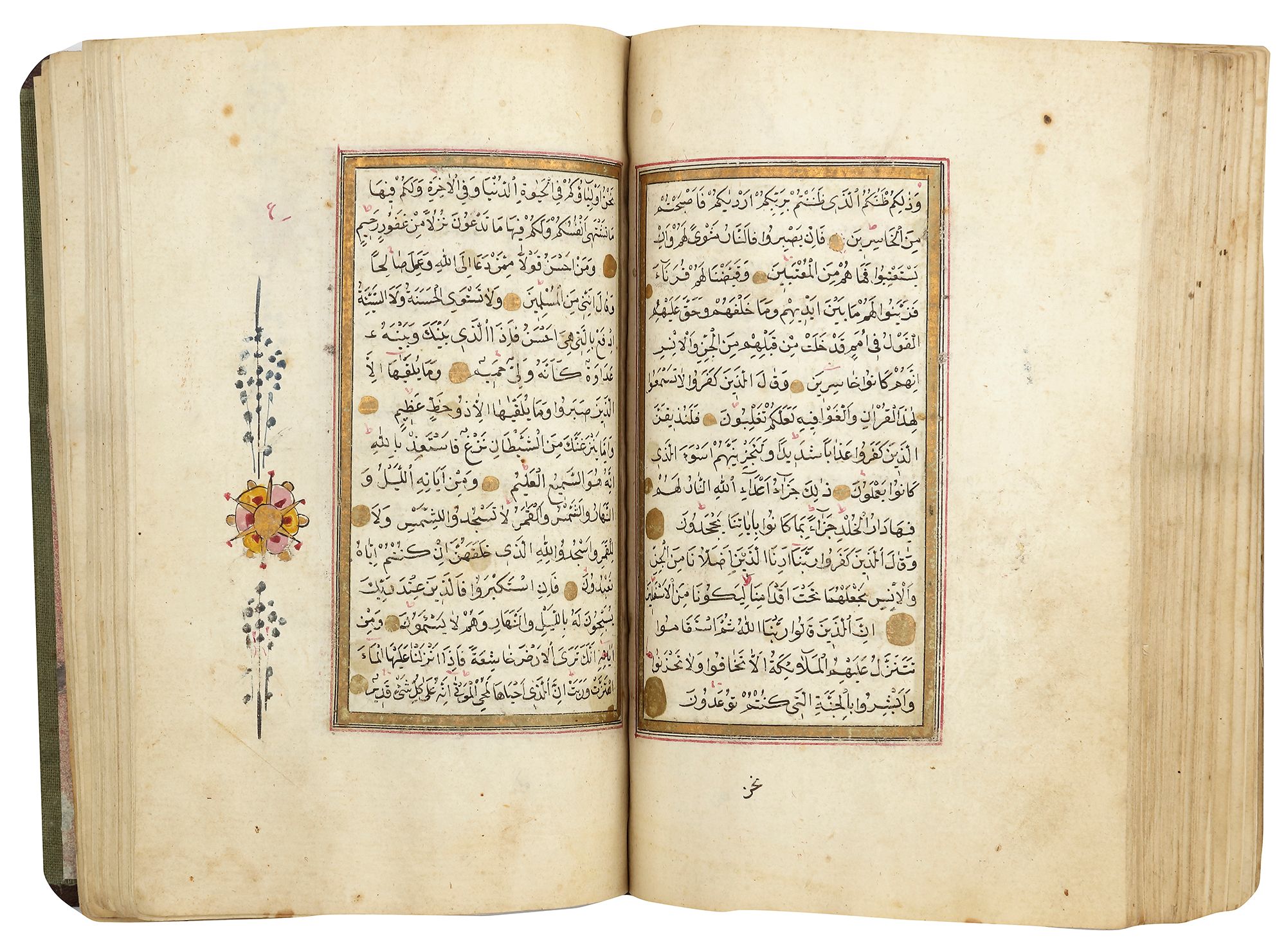 A complete Quran, Arabic manuscript on paper, 15 lines to each page in bold black naskh script within a gilt and polychrome border. Two opening biofolia with polychrome and gilt decoration framing 7 lines. Gold verse markers with Al tajwid in red ink. with gilt floral occasional marginal " Hizb " markers.