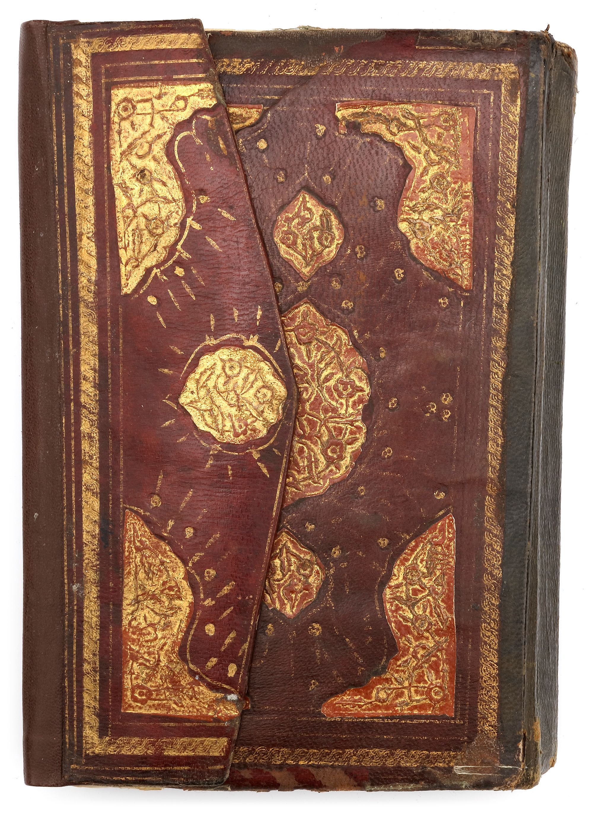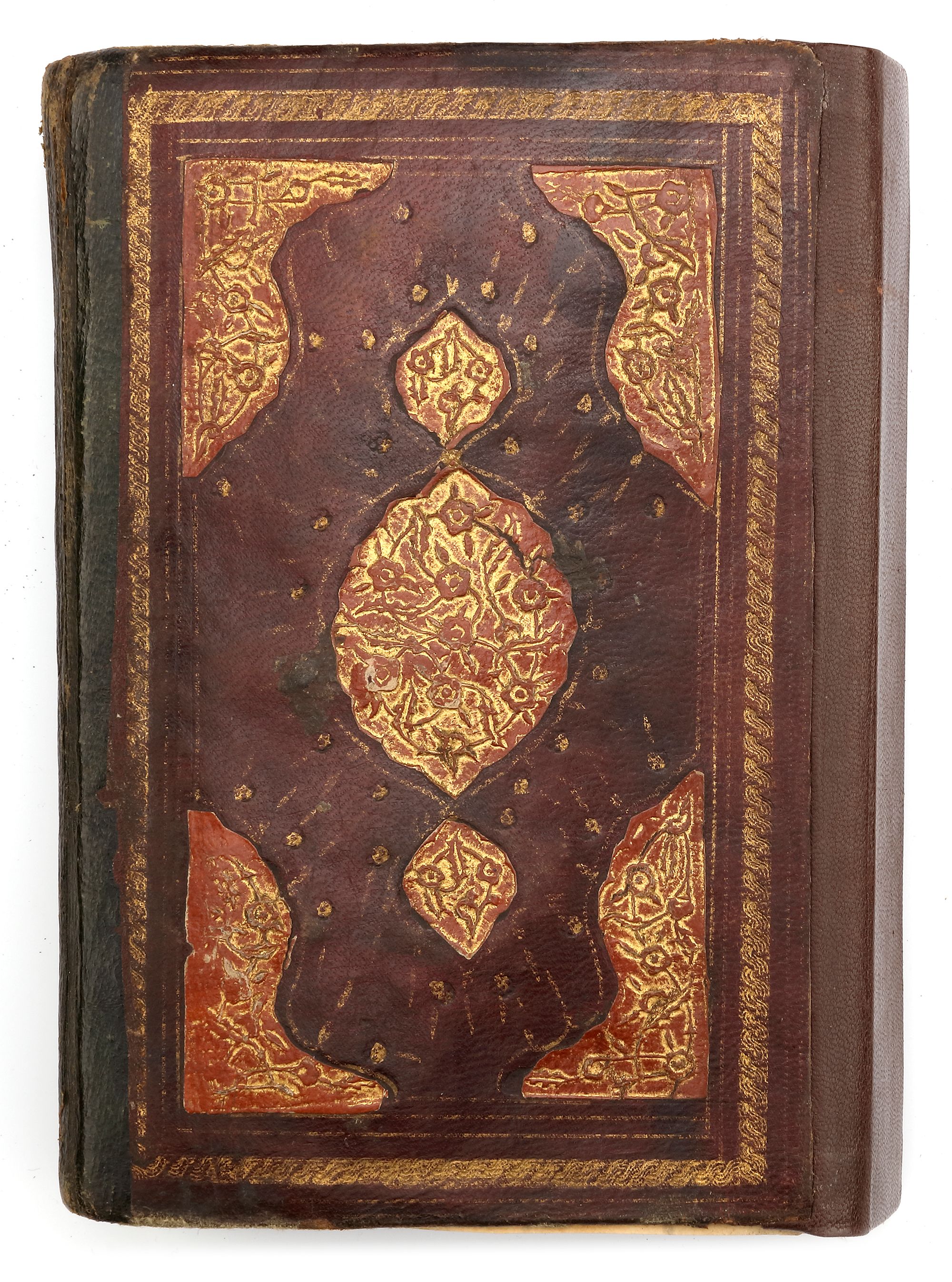 In brown morocco binding with flap decorated with gilt floral motifs.