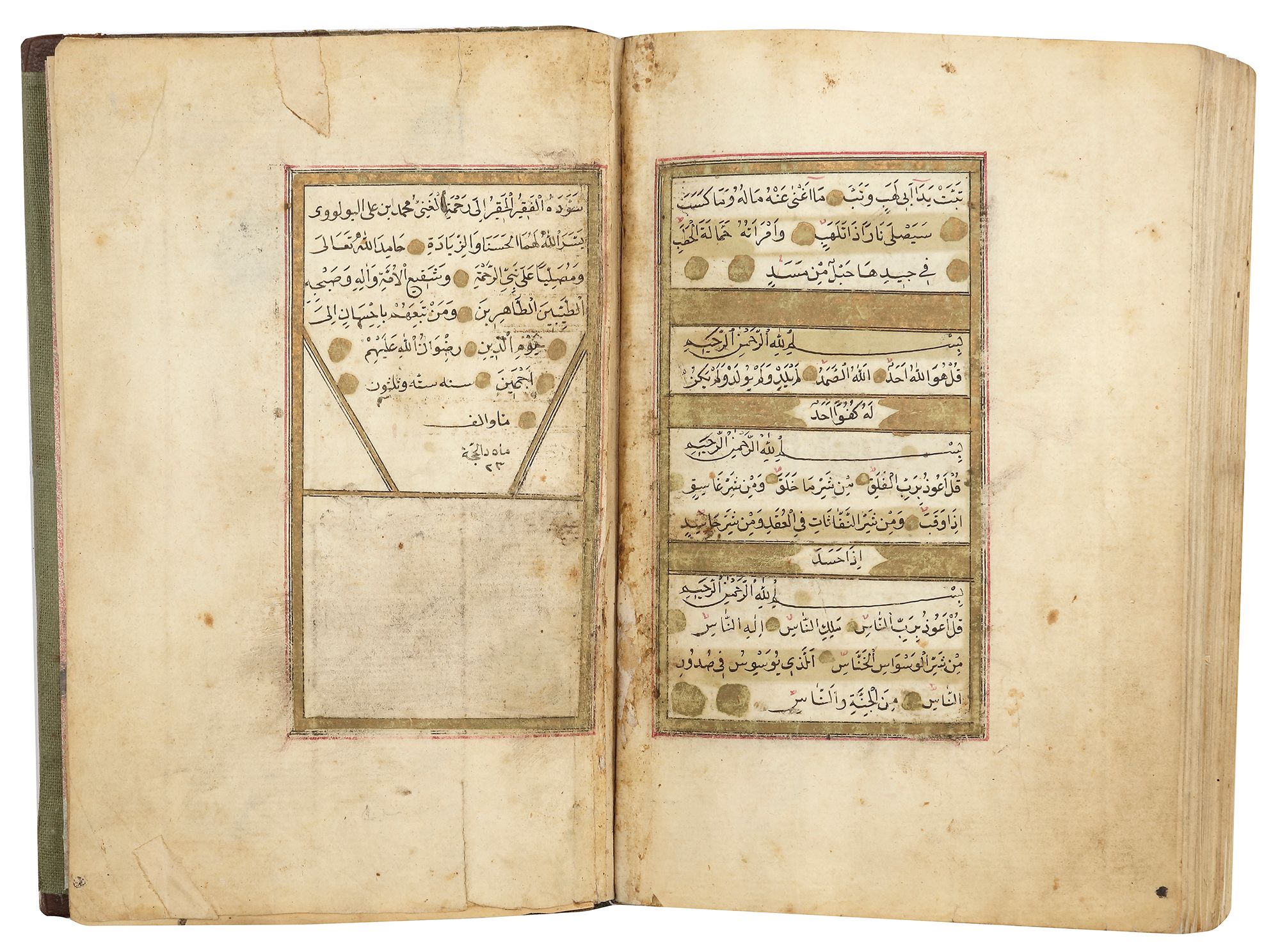 Final folio with a prayer for completion of the recitation of the Quran (Due- al-Khatm) and signed " written by Muhammad Ibn AlI AL-Bolui ( from Bolu, Turkey), dated 1136 AH.