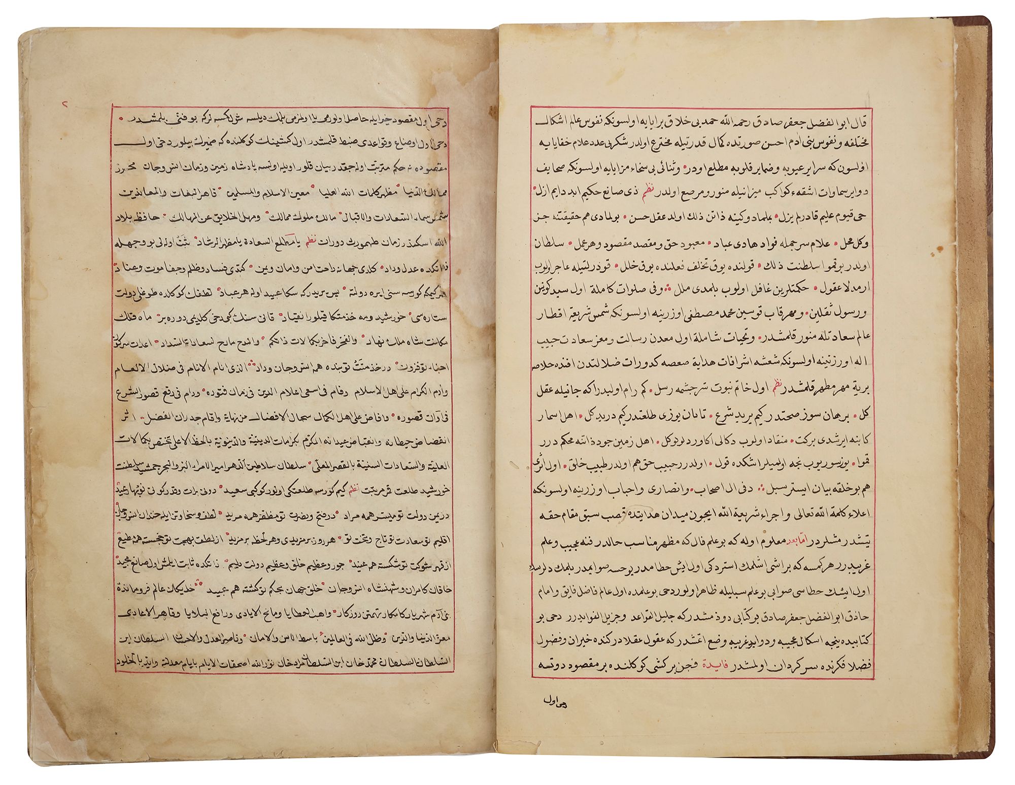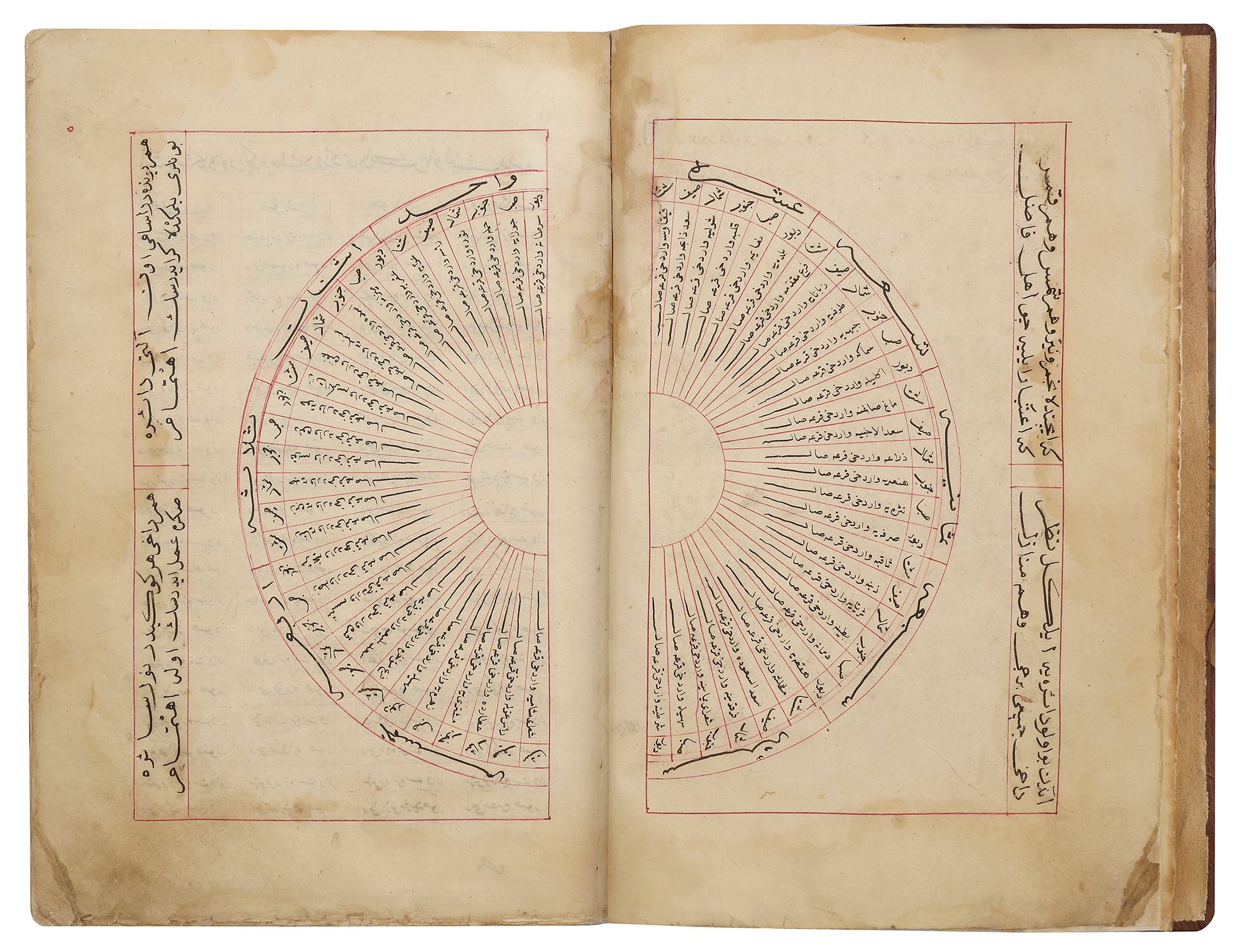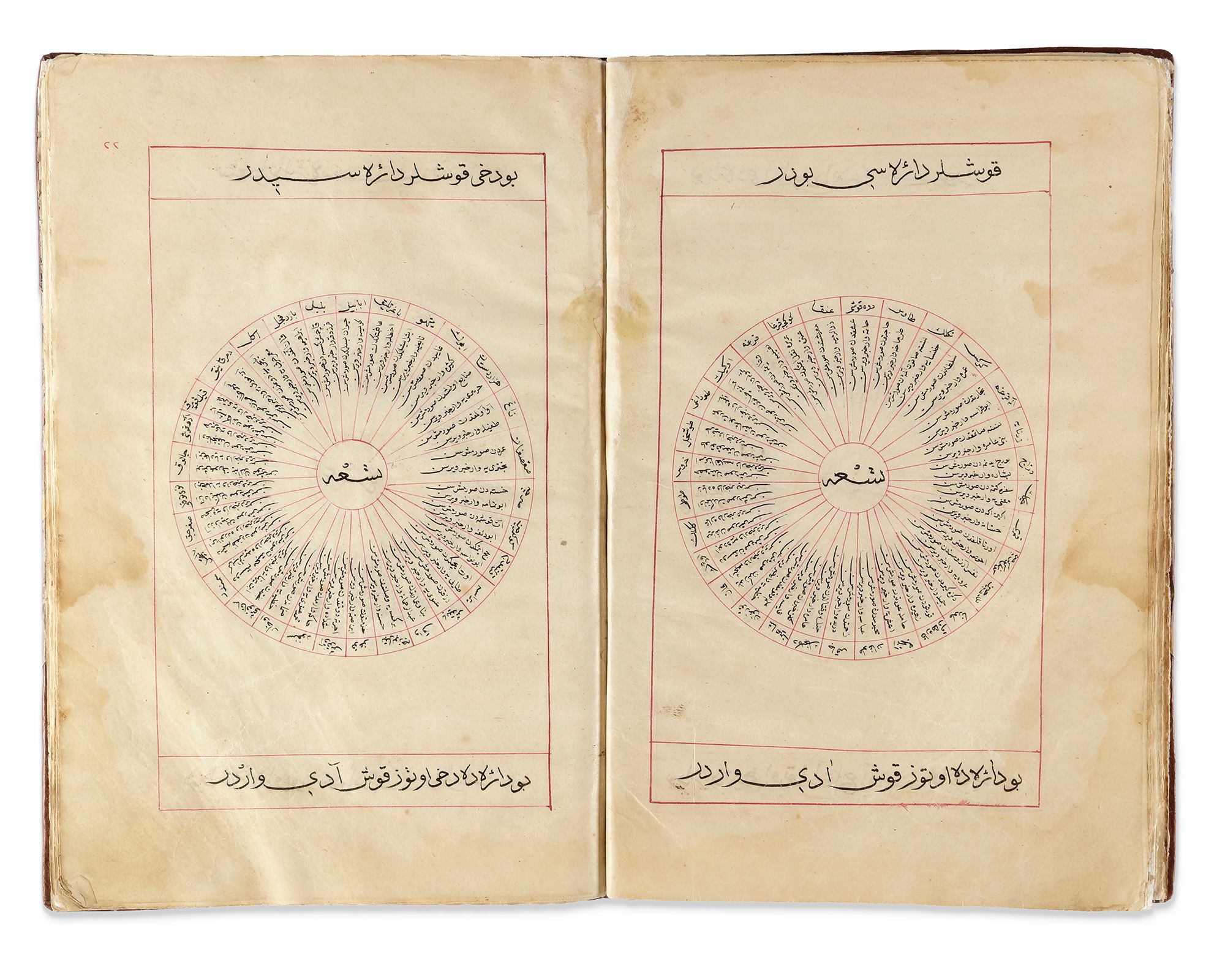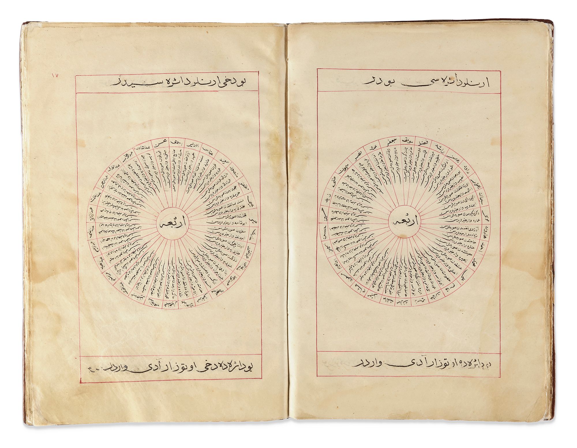 Ottoman Turkish manuscript on paper, 53 leaves. with 2 fly-leaves, written in black ink, titles and catchwords in red ink, ruled in red border. Large circles in red ink, Arabic poetry translated to Ottoman Turkish arranged in two columns of different famous poets of pre-islam, umayyid, and abbasid periodes.