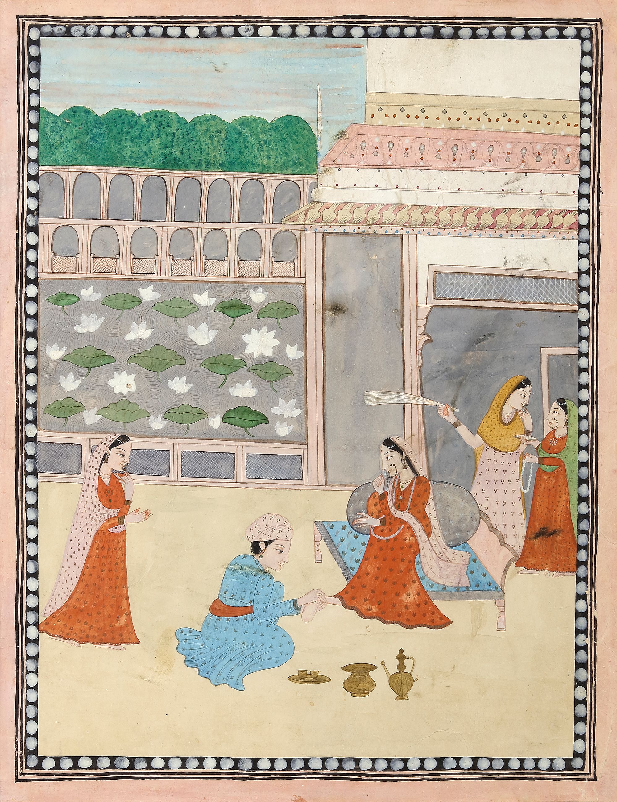 Gouache colour heightened with gold on paper. Painting: 24.5 by 32 cm. With frame 35.5 by 43.5 cm.