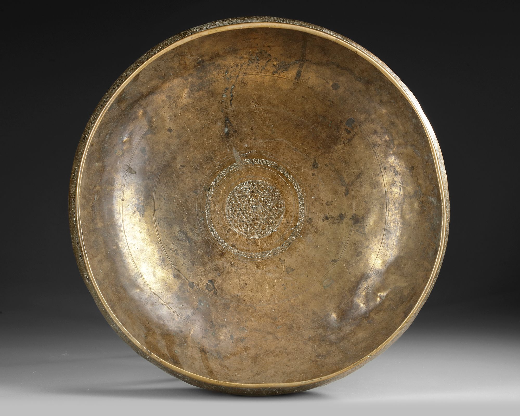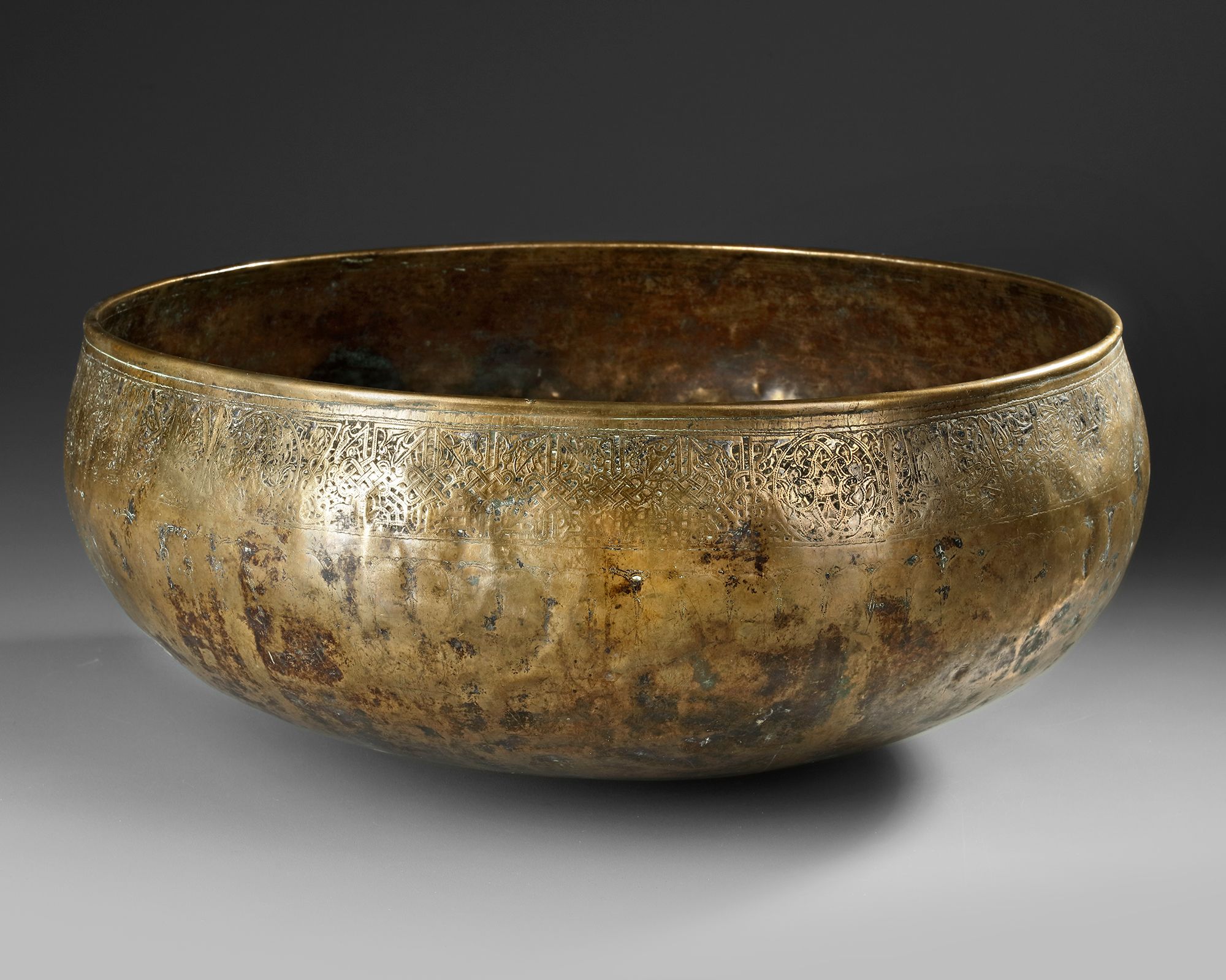 The finely executed decoration combined with language used would suggest it was intended for a high-ranking patron. The benedictory inscriptions here are not just typical of similar metalwork but can be found on many other forms of Mamluk art and architecture of the late 13th and early 14th centuries.The bowl is engraved on the exterior with "Bi-Rasm Bilban al-Bitahi", made for the price of Aleppo in 699/1299 born in Mecca, Said al-Dain Bilban al-Bitahi al-Mansuri.
