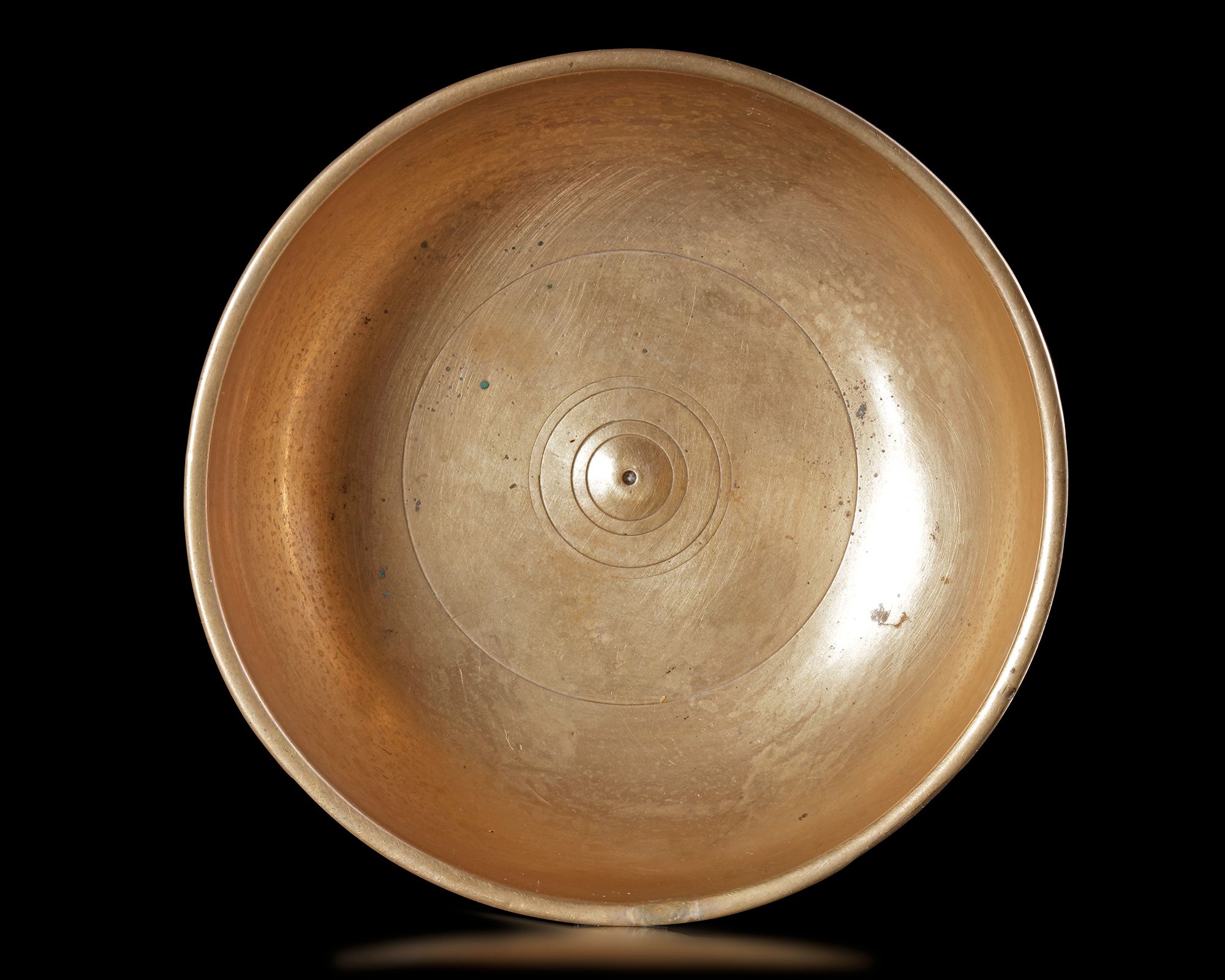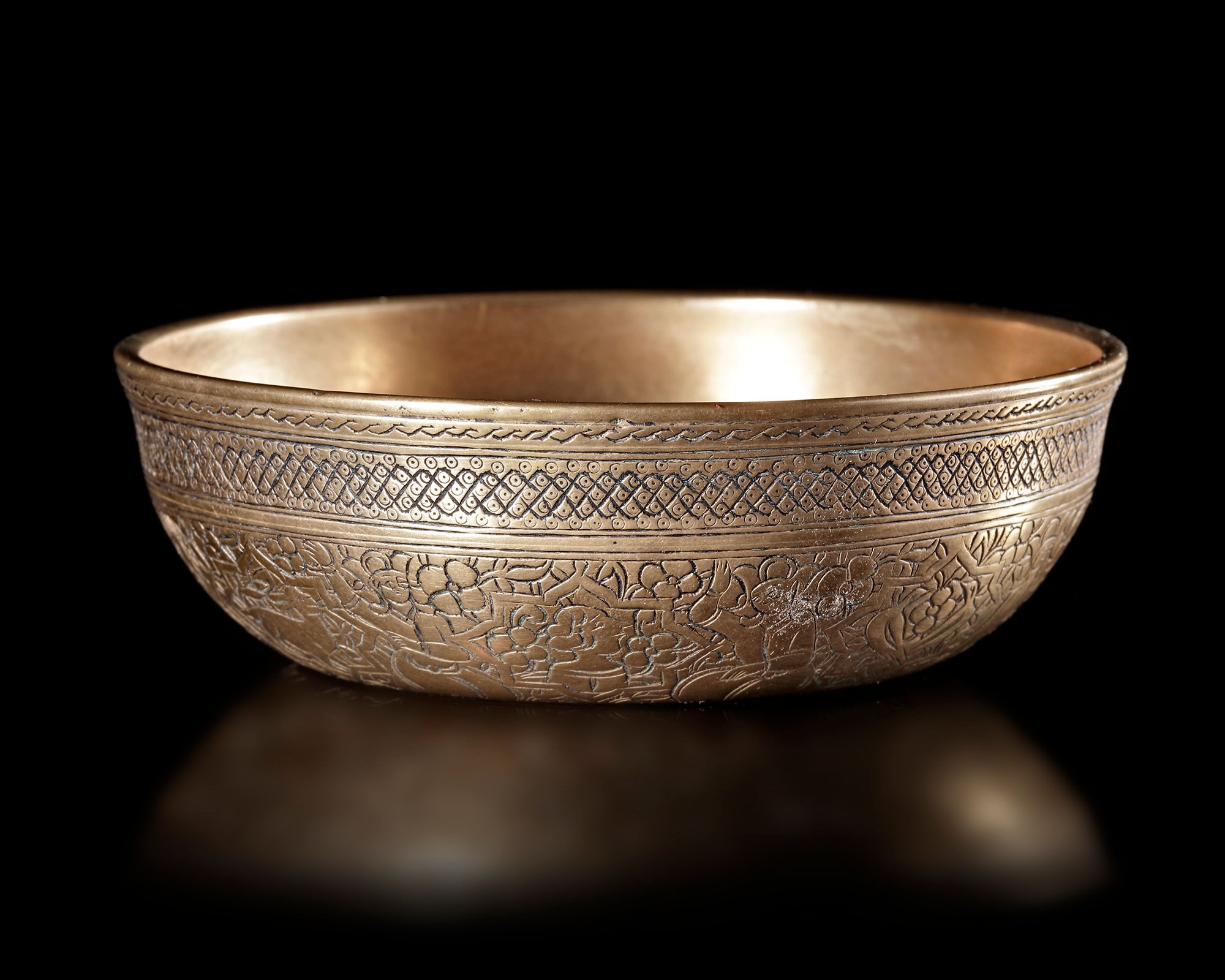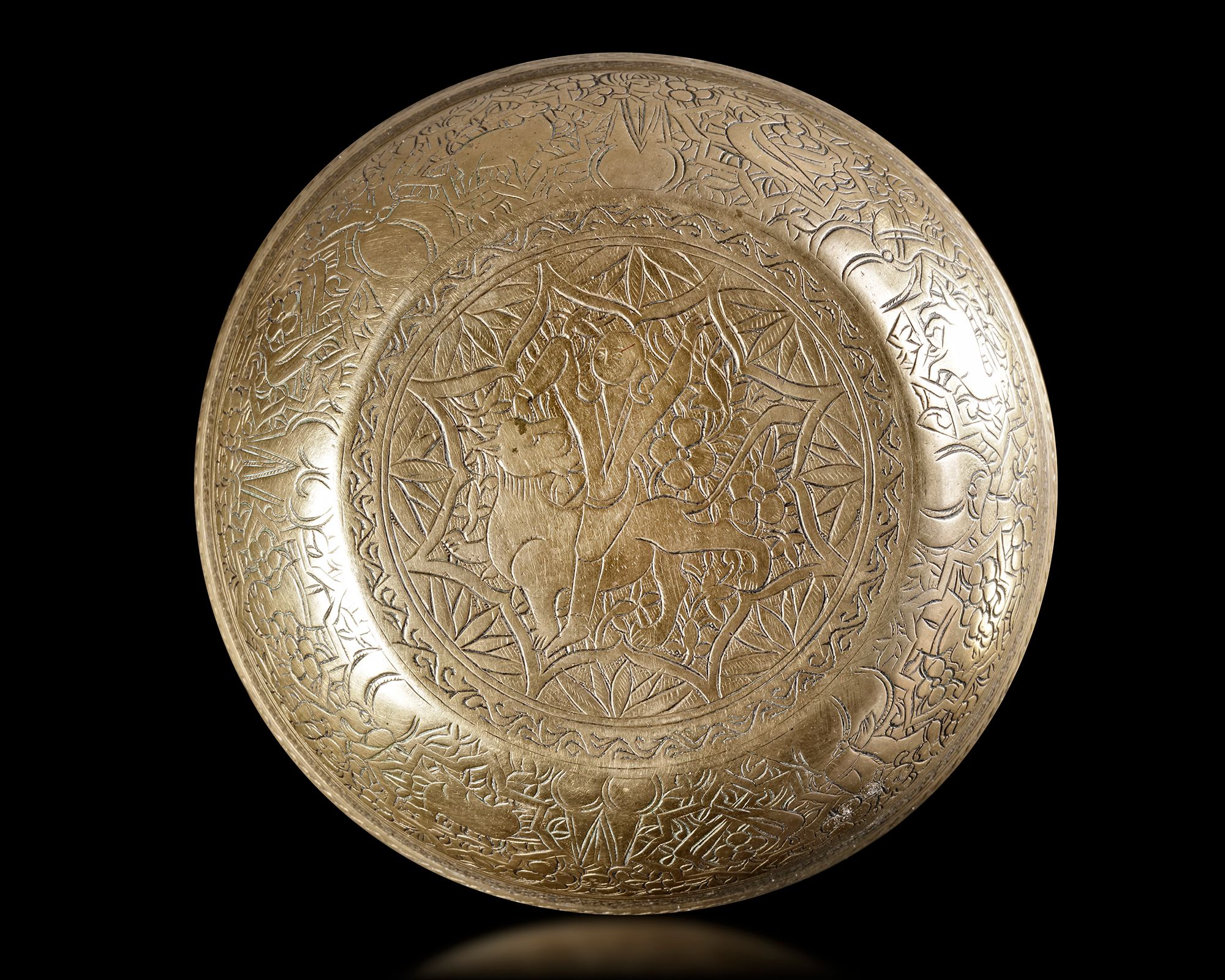 A gilt bronze magic bowl of shallow rounded form engraved to the exterior with a figure mounted on a mythological beast, the cavetto with a band of seated figures alternating with different animals amongst a dense design of floral sprays.