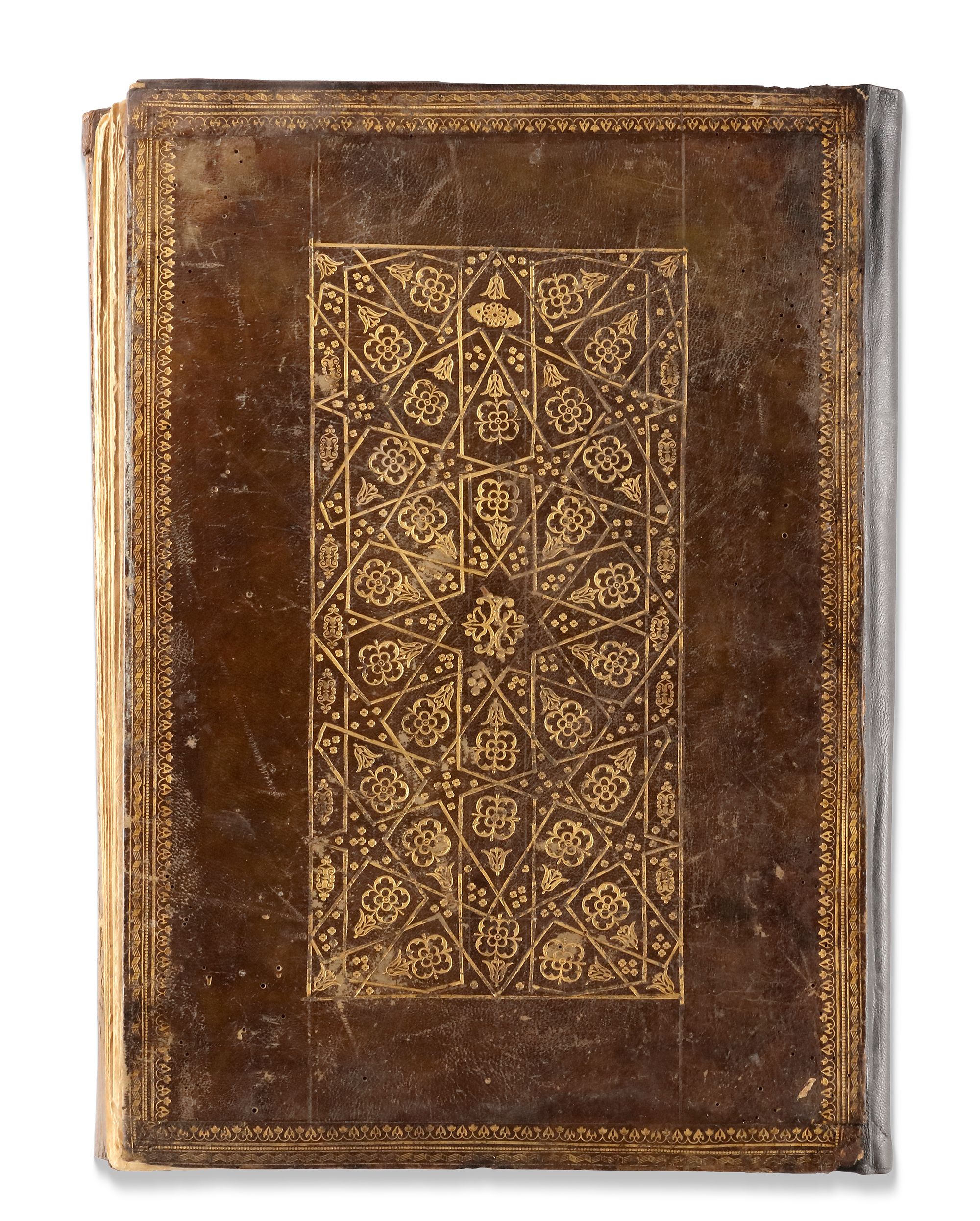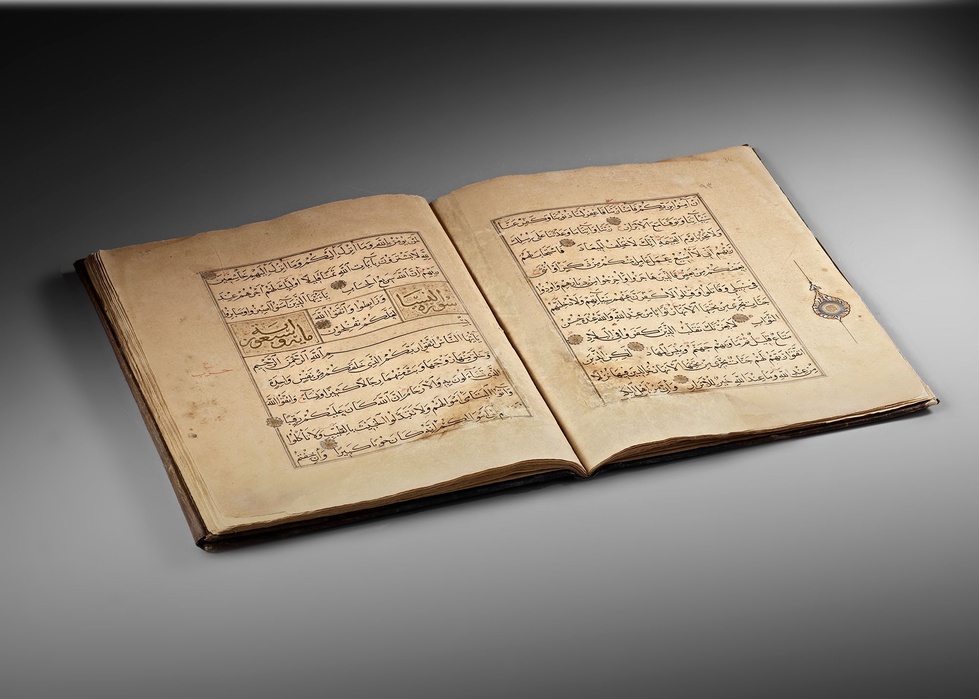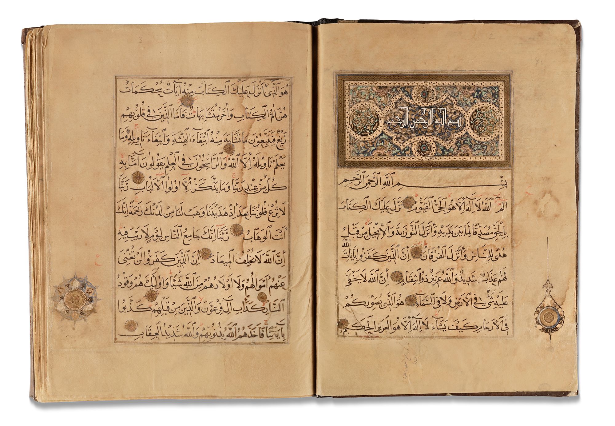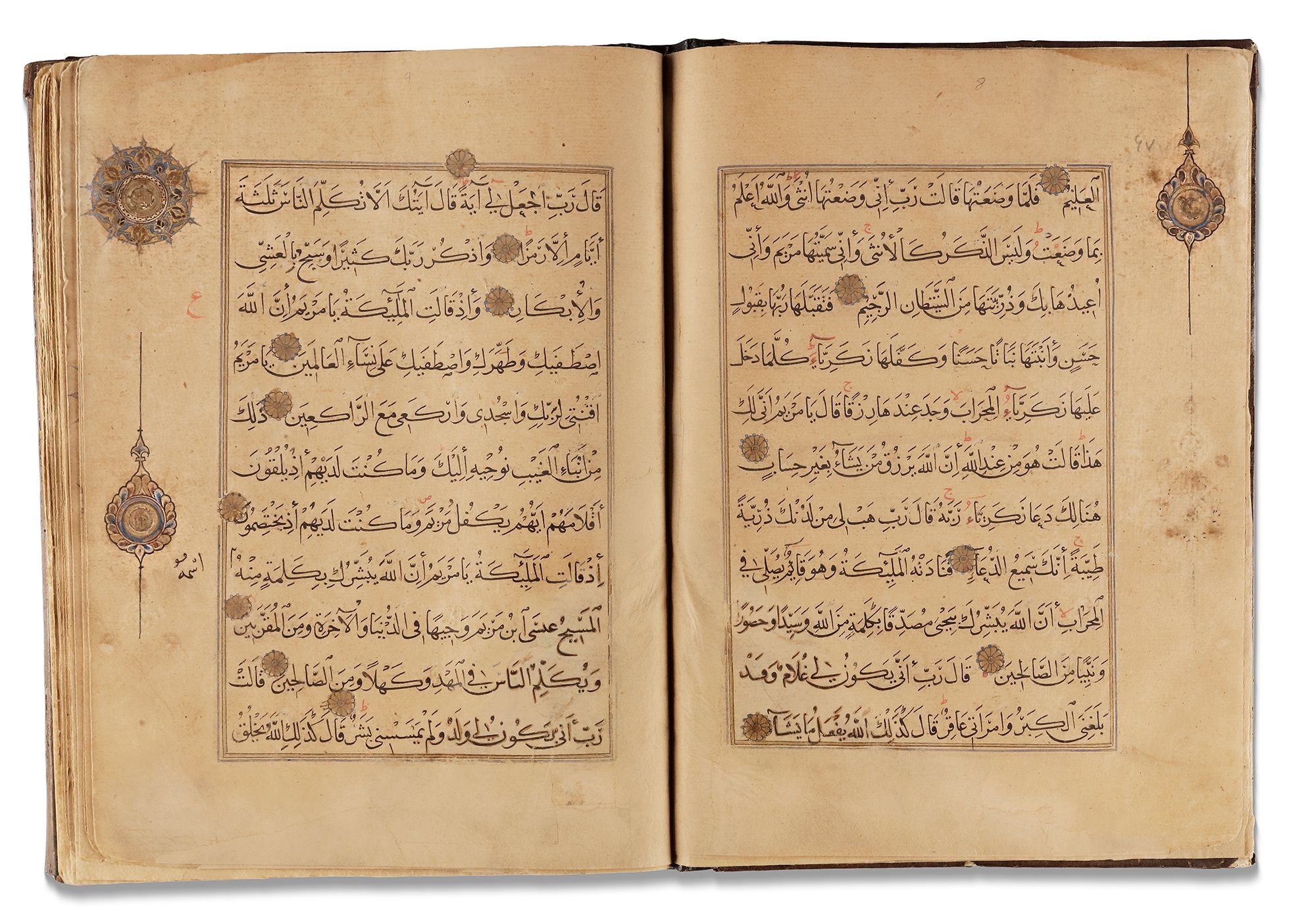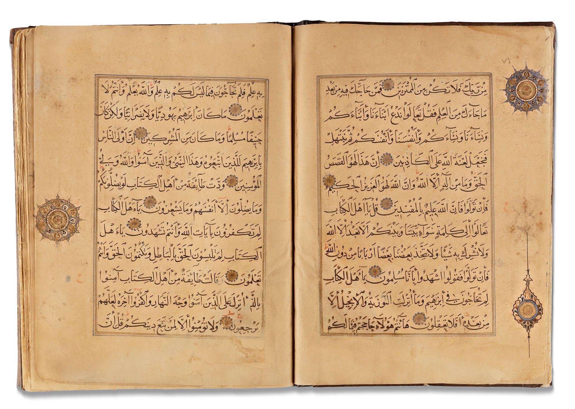Comprising the 4th and 5th juz’, Arabic manuscript on paper, 36 leaves, each folio with 11 lines of elegant black naskh script, surah headings in gold thuluth script outlined in black, Basmallah in white Kufic script, gold and polychrome rosette verse markers outlined in black and pointed by blue dots, ruled in blue and gold borders, tajwid in red, occasional marginal floral motifs indicating the 'Juz, Hizb, Aushr and Khums', colophon of each surah with gilt and blue decoration, in black morocco binding with gilded decoration.